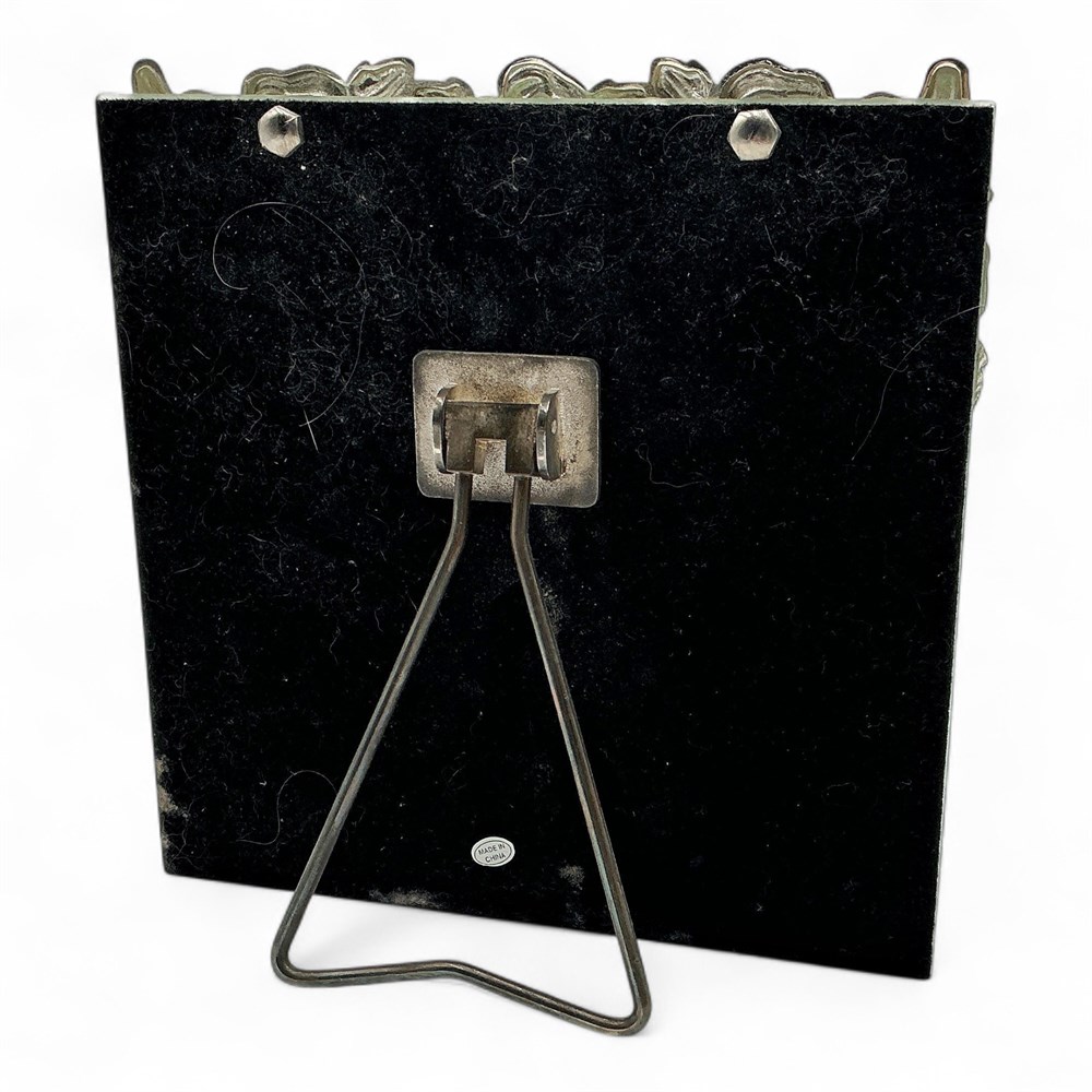 A vintage-style metal and glass tabletop vanity mirror with an ornate rose motif. The frame features sculpted roses and leaves in a pewter-tone or silver finish, reminiscent of Art Nouveau or Victorian design styles. Has an easel back for tabletop use. 8" H x 8" W Good condition.