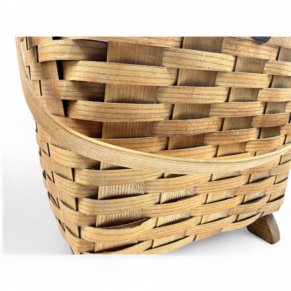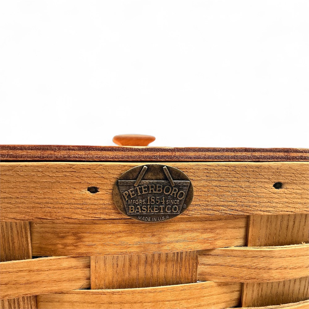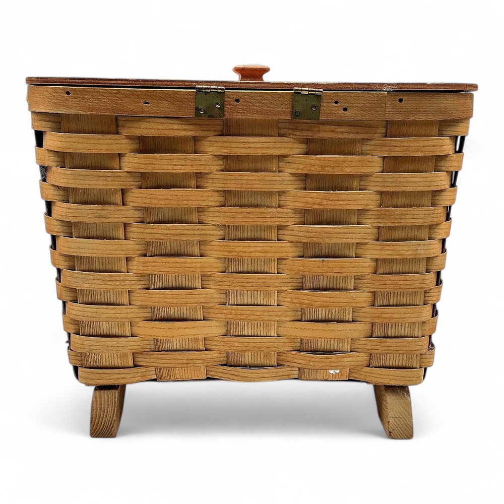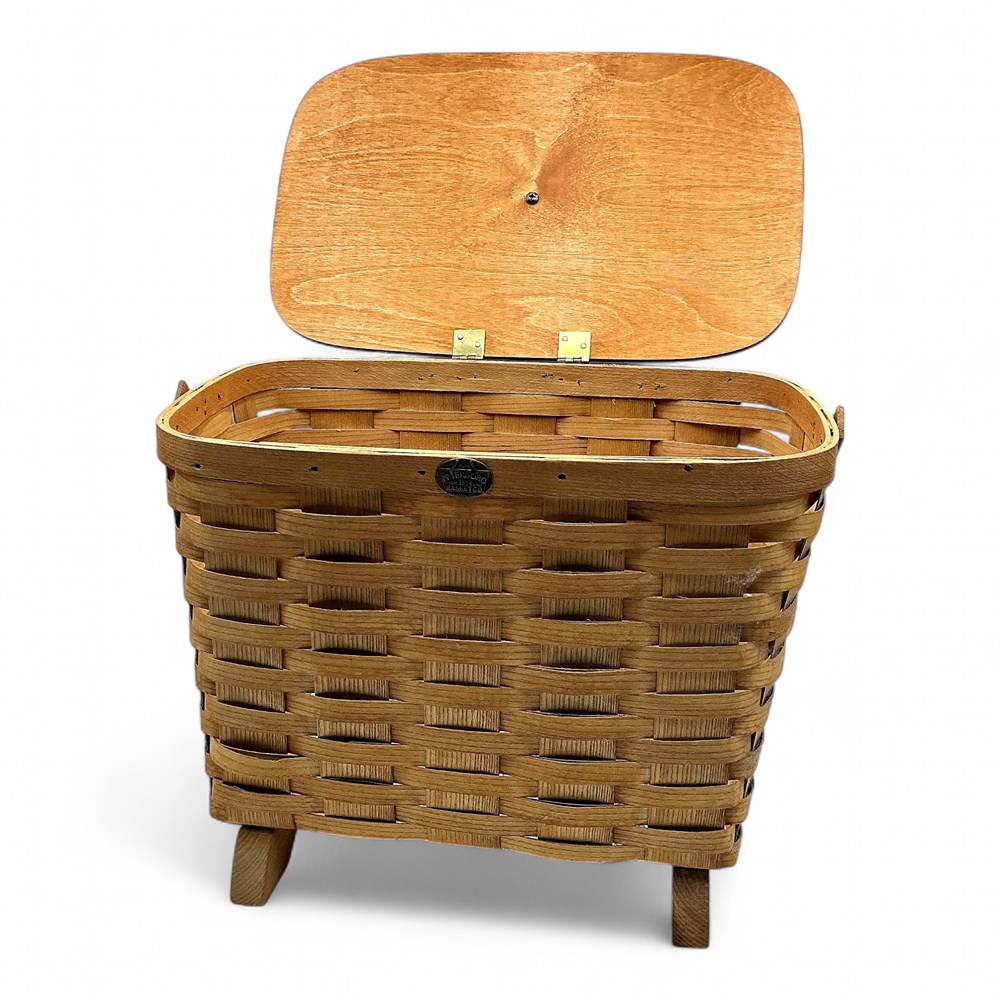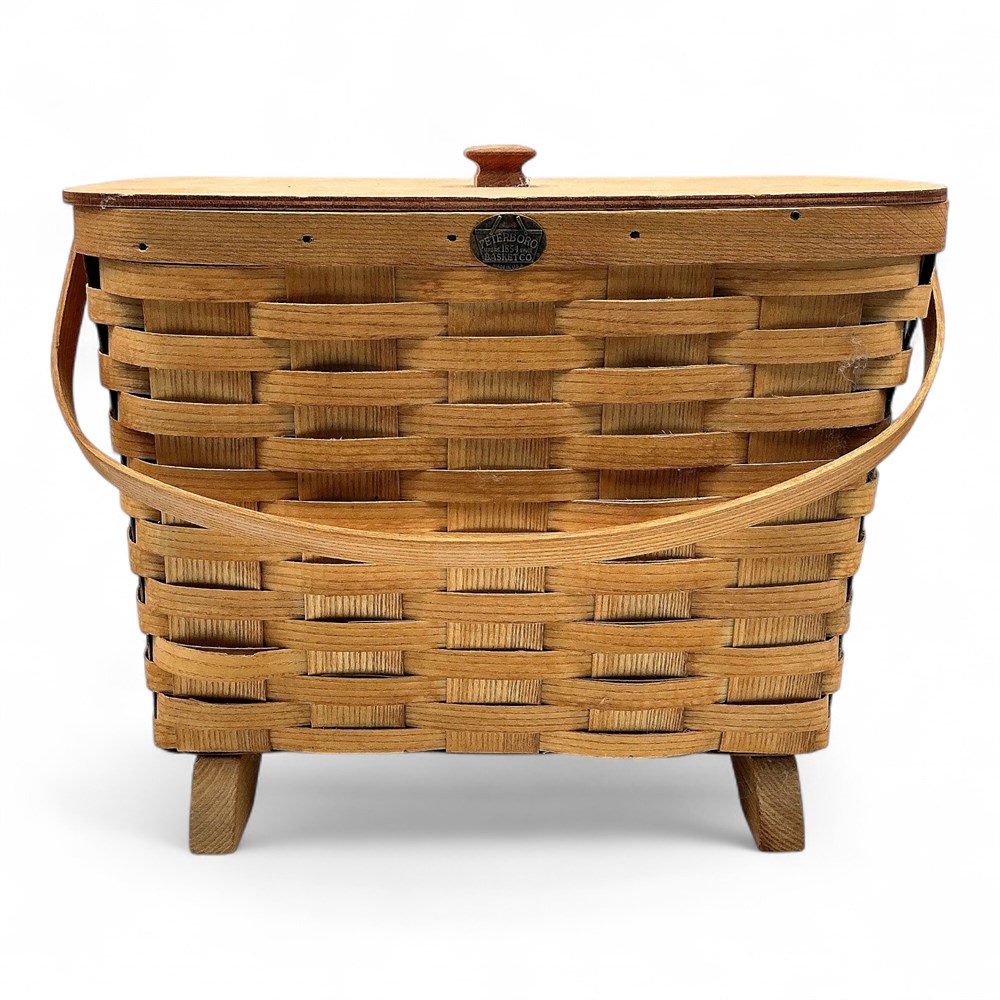 A Peterboro Traditional Knitting Basket. The Peterboro Basket Company claims to be the only manufacturer of this specific "one-of-a-kind" design featuring hand-cut wooden feet and a wooden lid. The baskets are handcrafted in the USA from hardwood Appalachian Ash. The basket features a woven body, a flat wooden hinged lid, a single swinging handle, and four solid wooden feet for stability. It is commonly marketed as a knitting basket to hold yarn and projects, a magazine basket, or general storage. 17.5" L x 11.5" W x 14" H Good condition.
