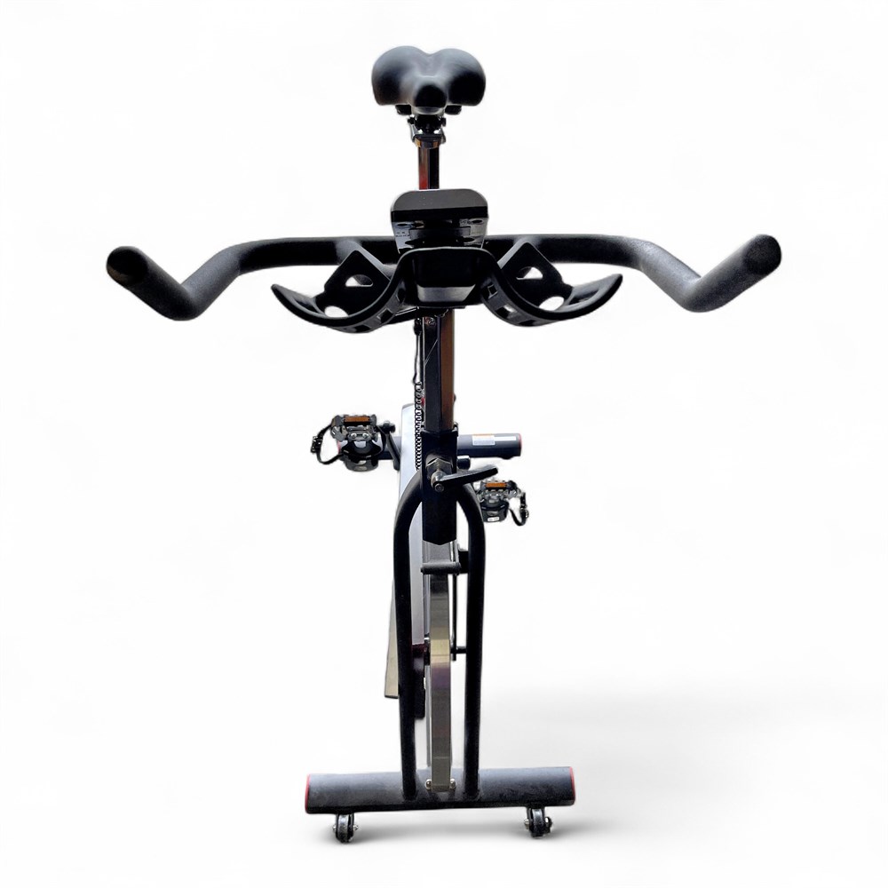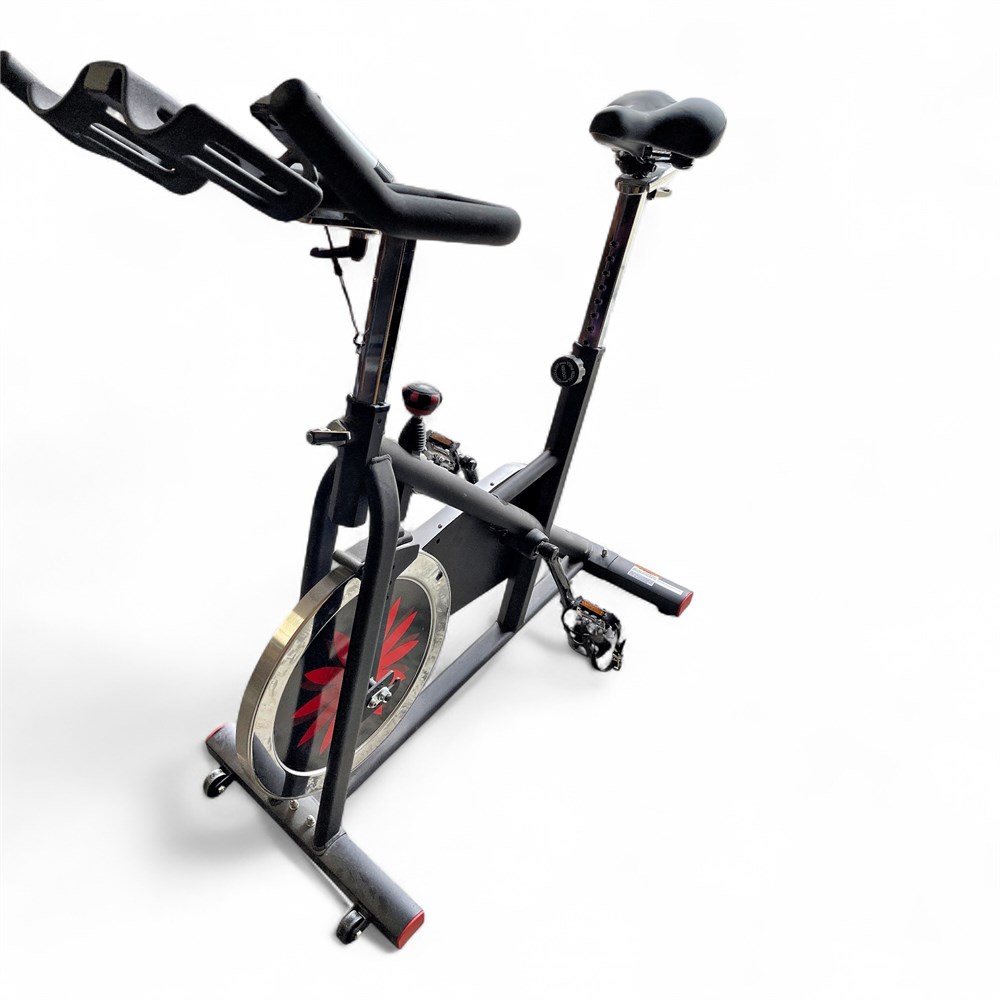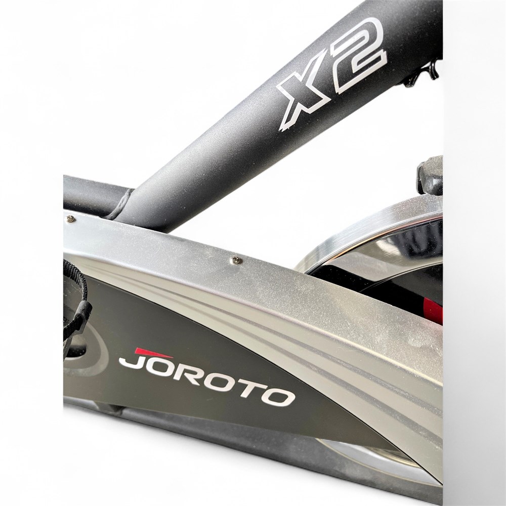 A JOROTO X2 magnetic indoor exercise bike. It features a heavy-duty 44 lb flywheel for a smooth and stable ride. The magnetic resistance system provides a nearly silent workout experience and reduces wear and tear. The seat and handlebars are 4-way adjustable for a customizable fit. It has a high weight capacity, typically supporting up to 300 lbs. 46" H x 42" L Good condition.