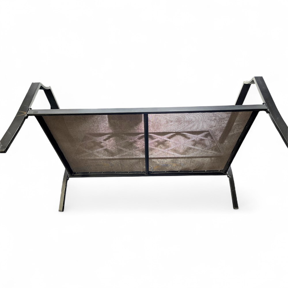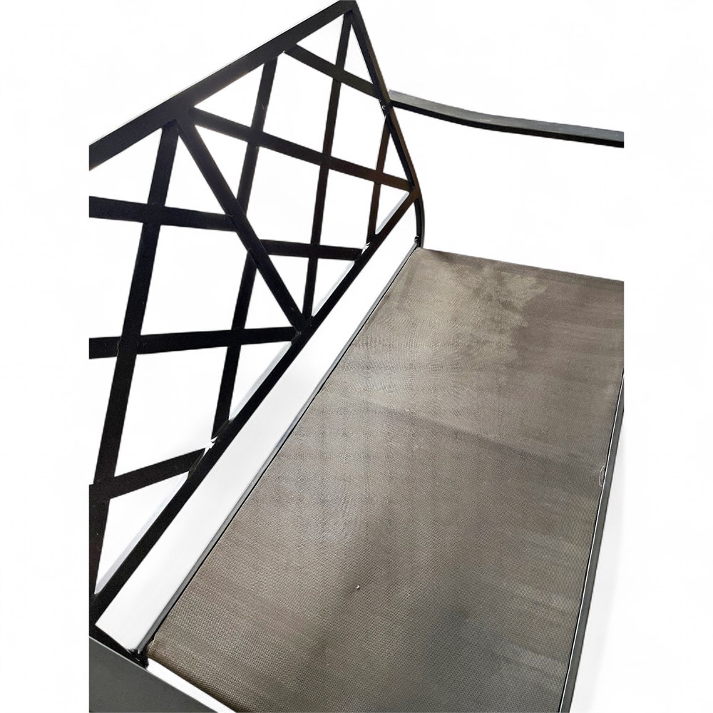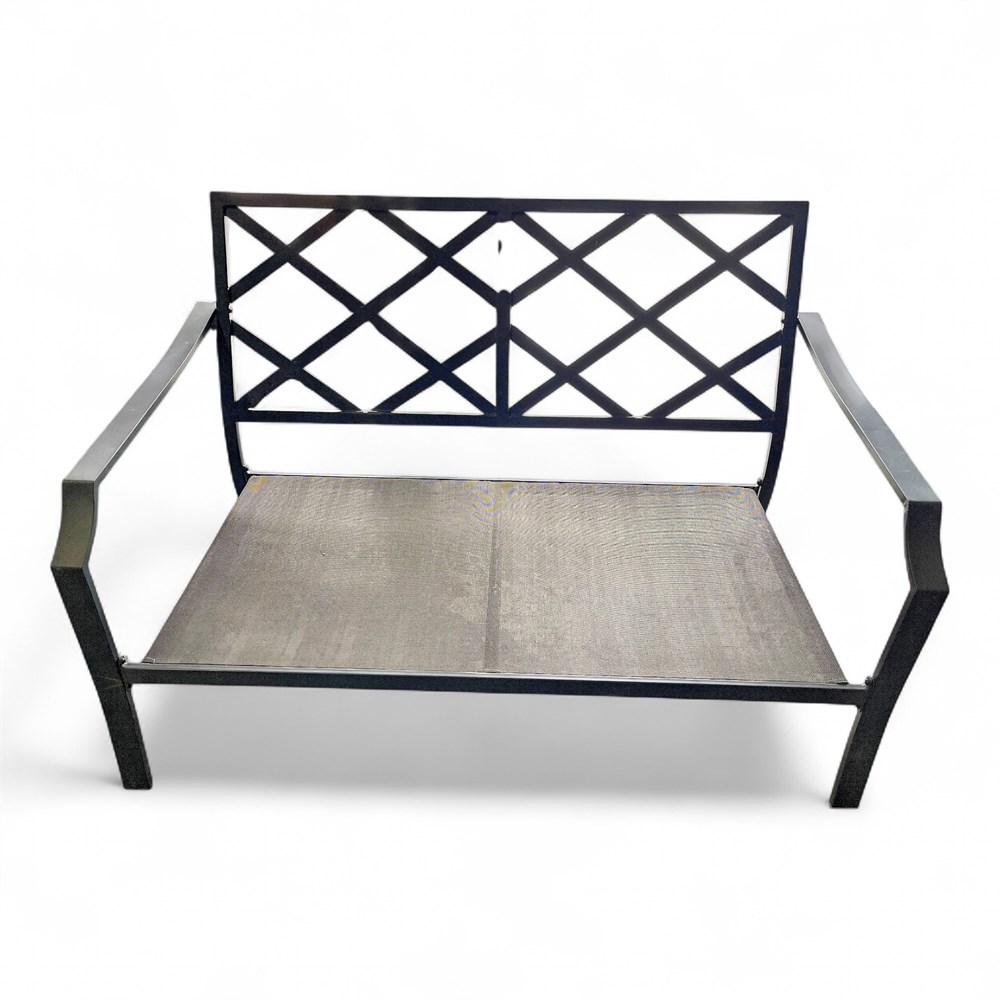 A metal outdoor loveseat or settee, made of aluminum or wrought iron, featuring a distinctive diamond or cross-back lattice pattern. The frame is designed for outdoor use and is typically coated to be weather-resistant. The piece exhibits a classic or traditional design, common in patio and garden furniture collections. It is primarily constructed from metal, likely powder-coated aluminum for durability and rust resistance. A prominent diamond/lattice pattern makes up the back of the settee. It is a two-person seat (loveseat) with a slatted or mesh seat base designed to allow water drainage. 34 1/2" H x 54" L x 24" W Good condition.