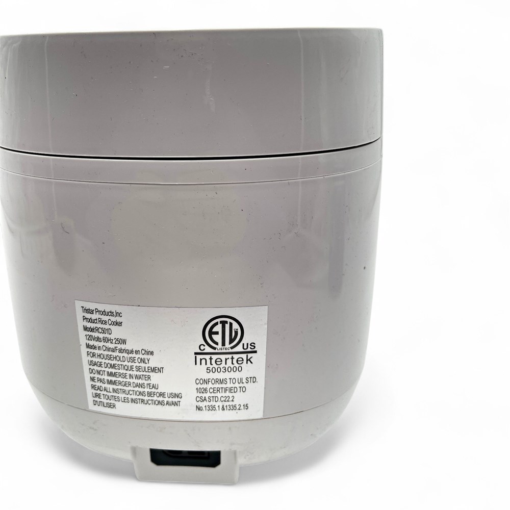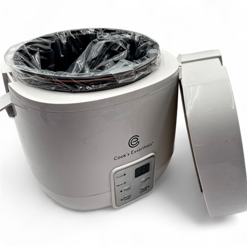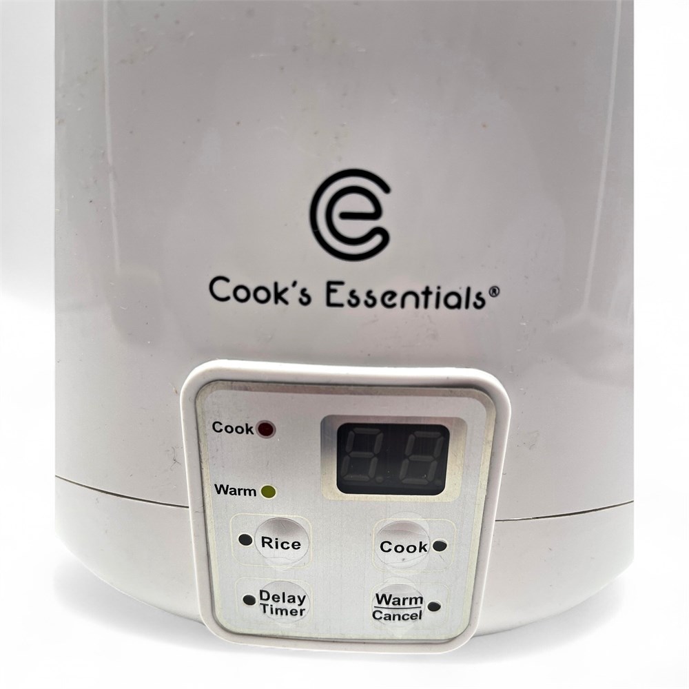 A Cook's Essentials 5-cup digital cooker, also known as the "Perfect Cooker", model RC501D. It is a multi-purpose appliance that can steam vegetables or rice, cook chicken or fish, and make soups, stews, or desserts. The 5-cup capacity makes it a portable size for small meals, suitable for one or two people. It features a digital display and functions including "Cook", "Warm", "Rice", "Delay Timer", and "Warm Cancel". The appliance is programmable and includes a timer function. 7 1/2" H x 6 1/2" L x 6" W Good condition.