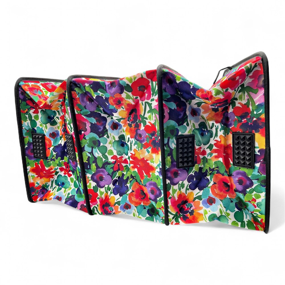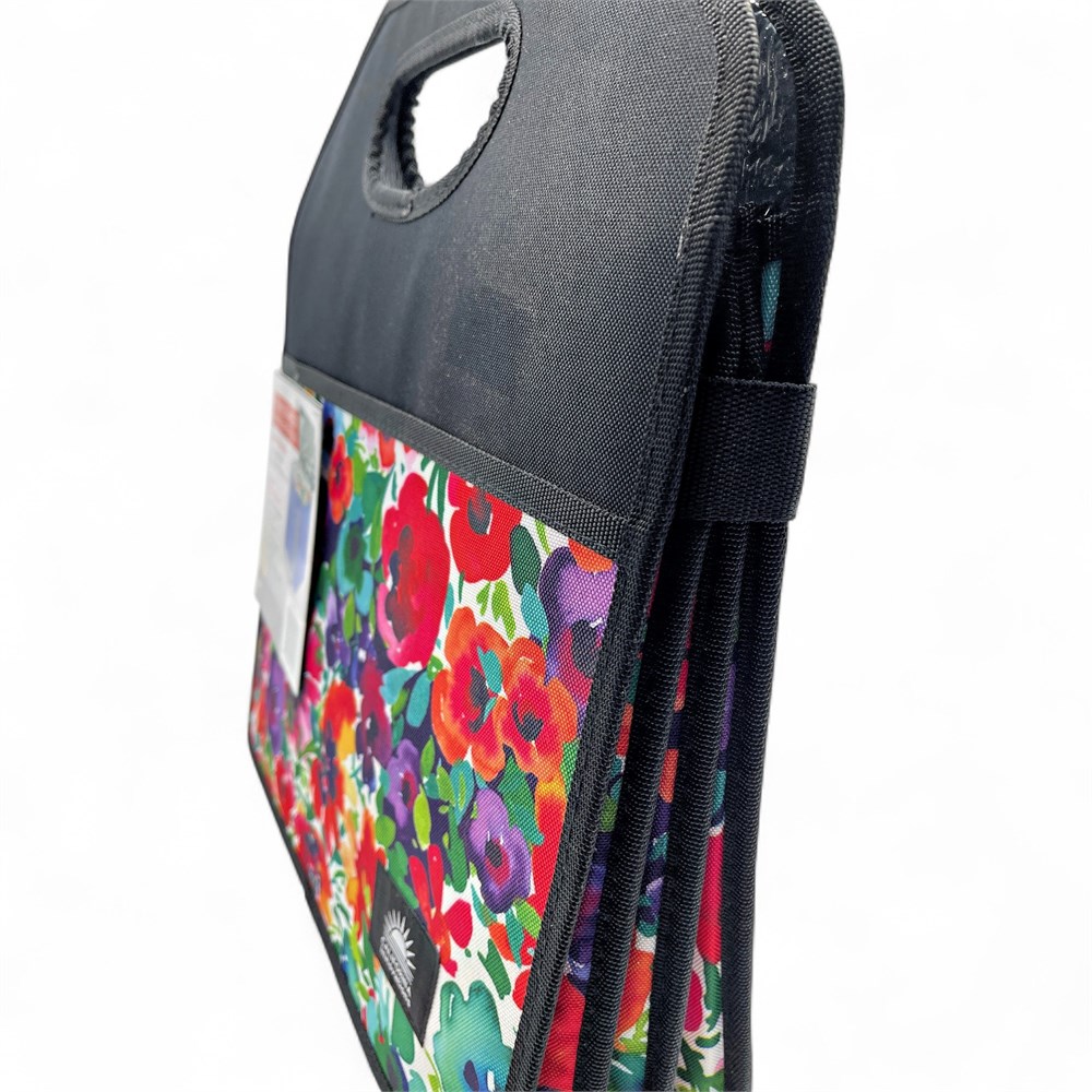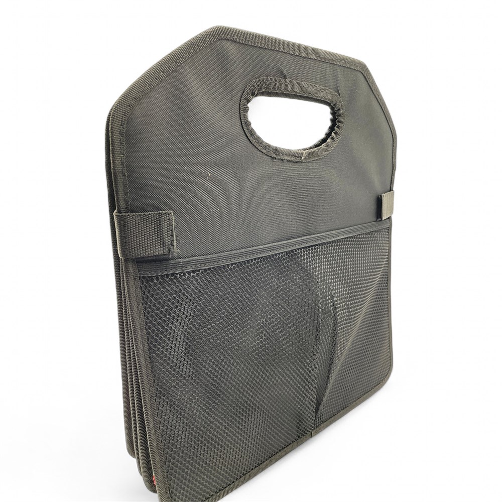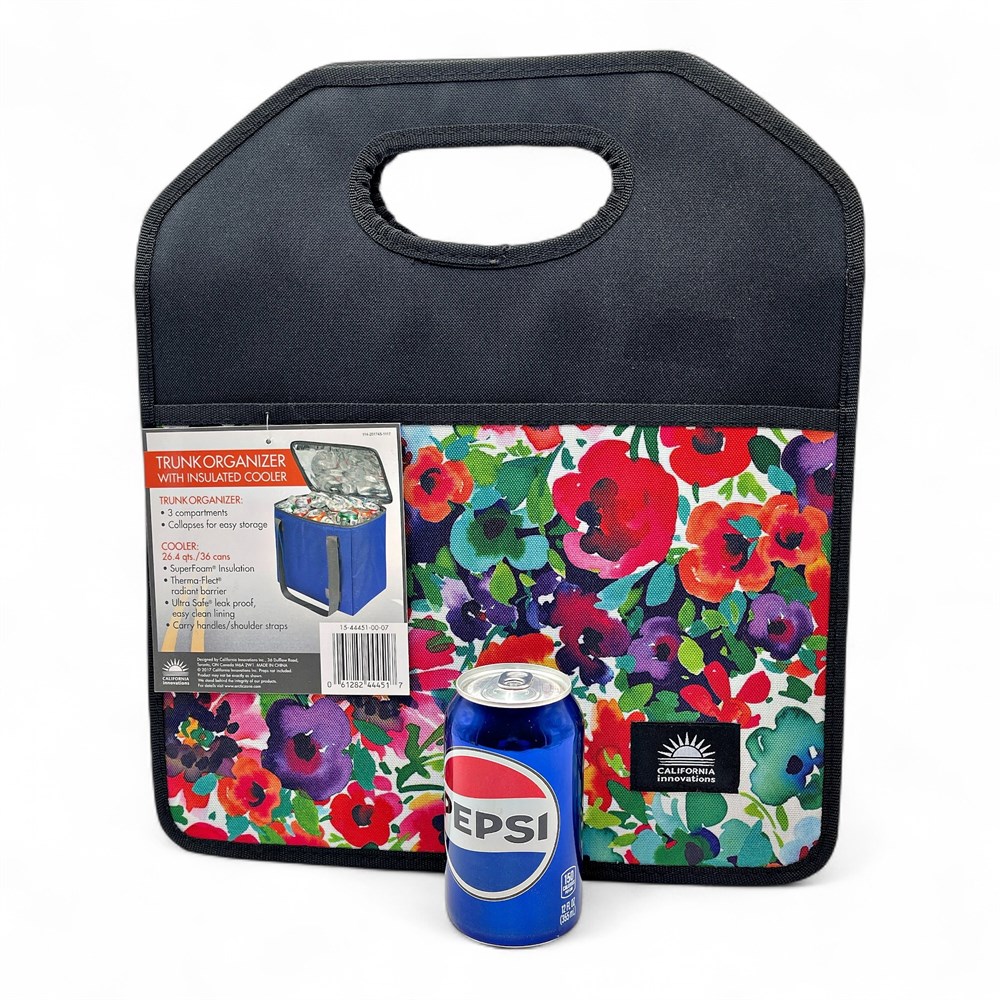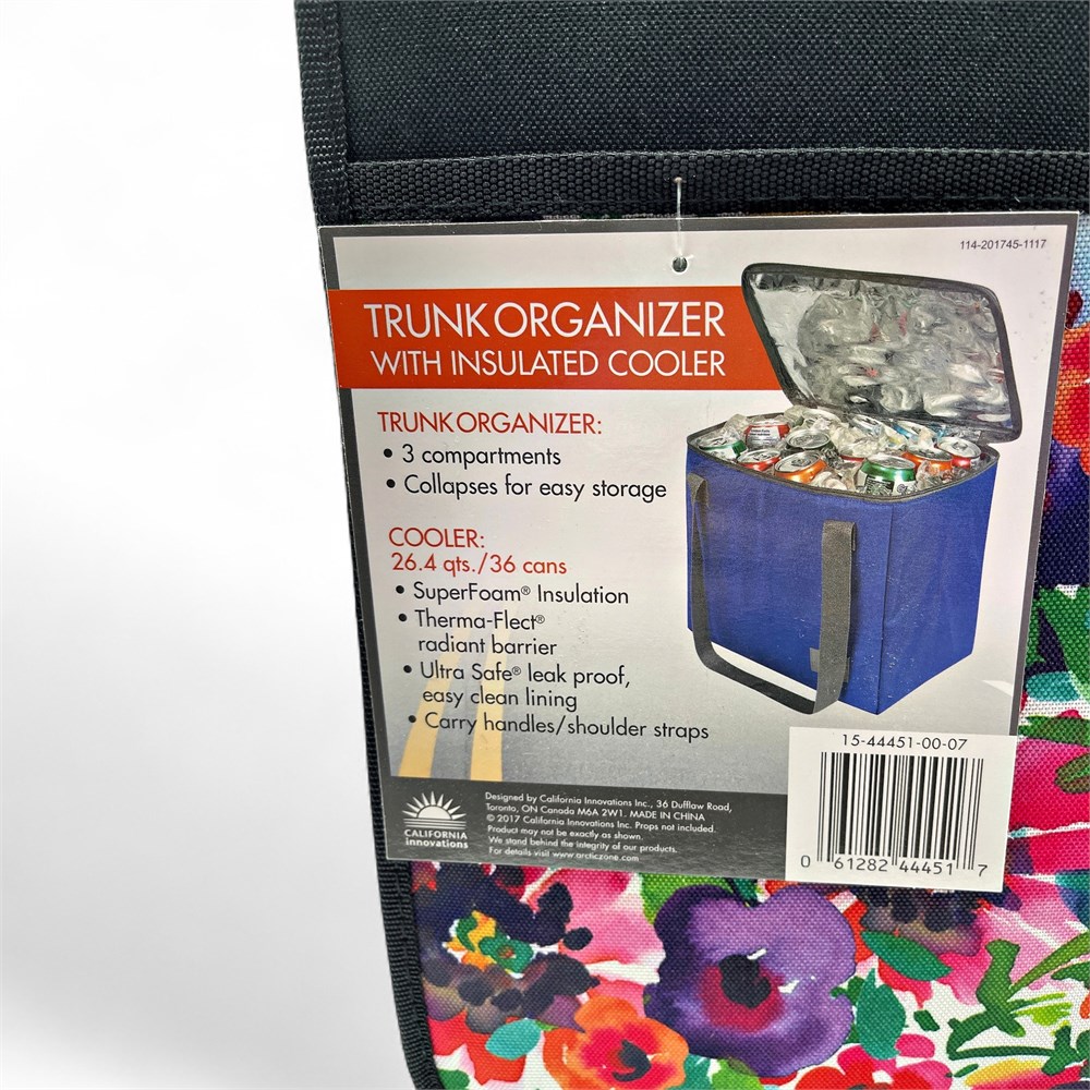 A California Innovations trunk organizer with insulated cooler. Features 3 compartments and collapses for easy storage. Holds 26.4 quarts or 36 cans. Utilizes SuperFoam® Insulation and a Therma-Flect® radiant barrier. Features an Ultra Safe® leak-proof, easy-clean lining. Includes carry handles and shoulder straps. 16" H x 23" L x 14" W Good condition.