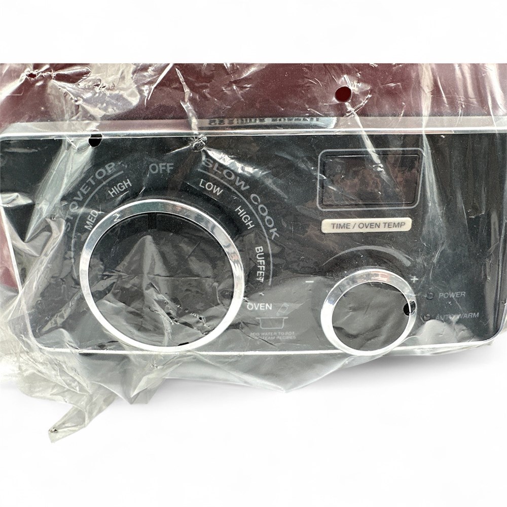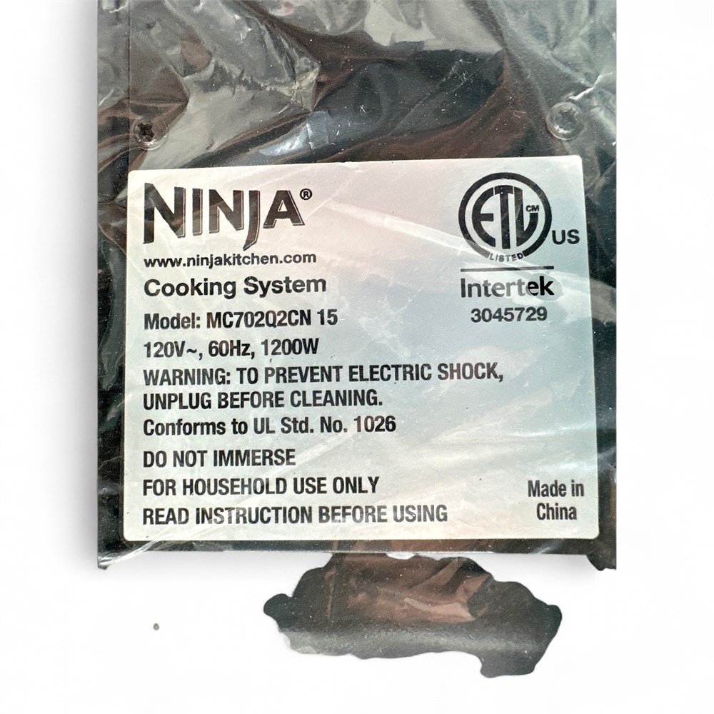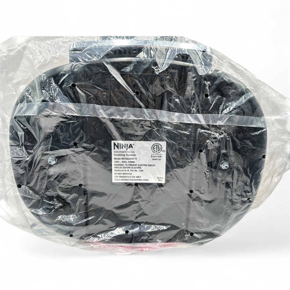 A Ninja cooking system model: MC702Q2CN 15, which is a Ninja 3-in-1 cooking system.It features stovetop, oven, and slow cooker functions for versatility. The system uses Triple Fusion Heat technology, combining bottom, side, and steam heating elements for faster cooking. The pot is non-stick for easy cleaning. It is designed for one-pot meals, reducing mess. 9" H x 18.5" W x 12" L Good condition.