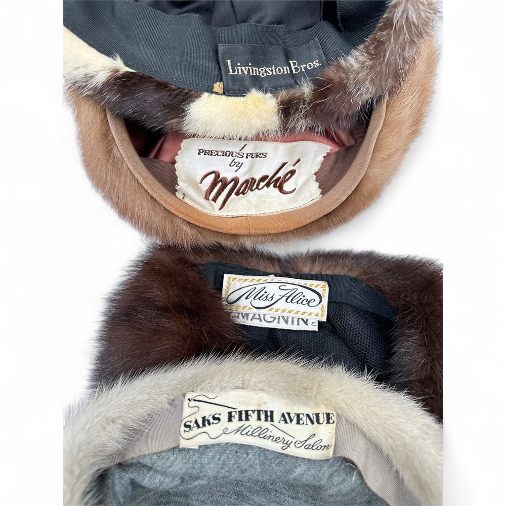 A collection of eight vintage mink fur pillbox hats, most of which are associated with a different prominent American department store or brand from the mid-20th century. "Precious Furs by Marché" and "Livingston Bros". Marche was an Italian designer whose fur hats were often sold in US department stores. Livingston Bros was a San Francisco-based department store chain that operated until the late 20th century.
