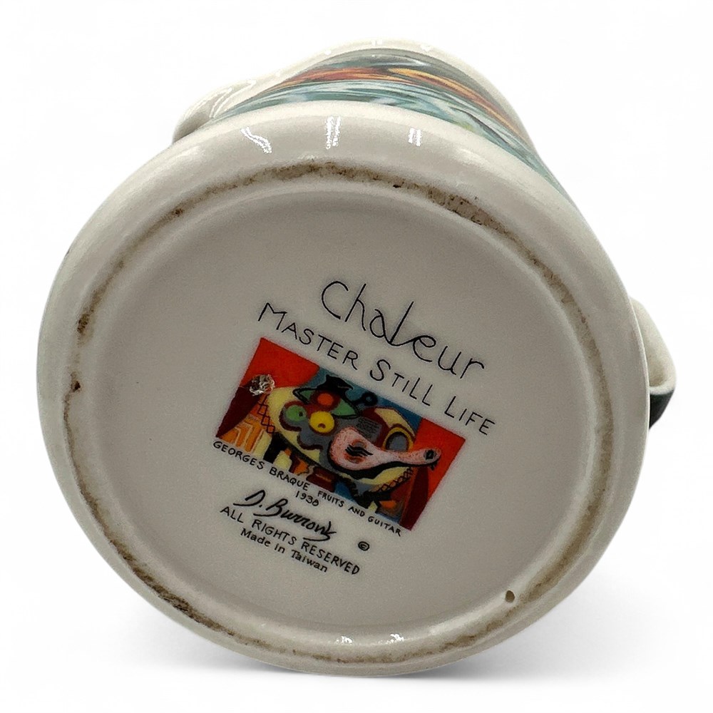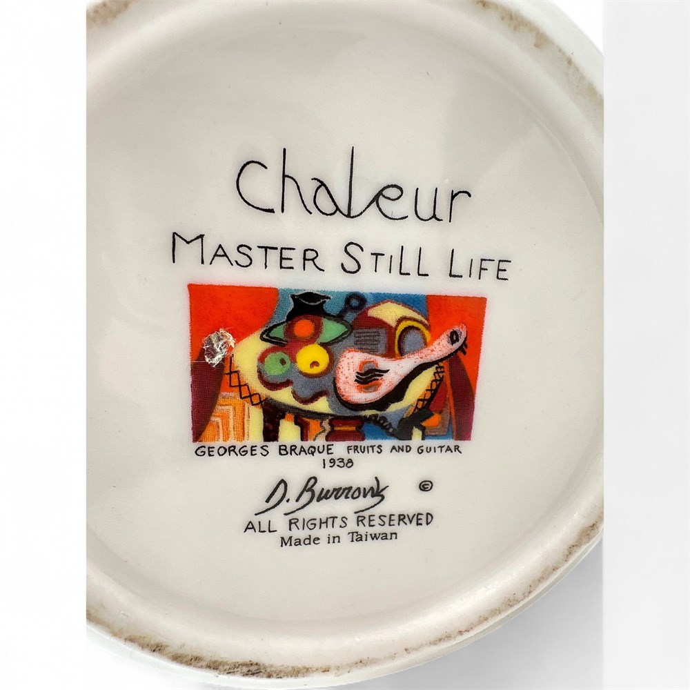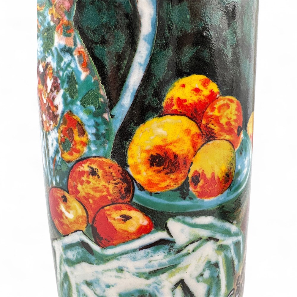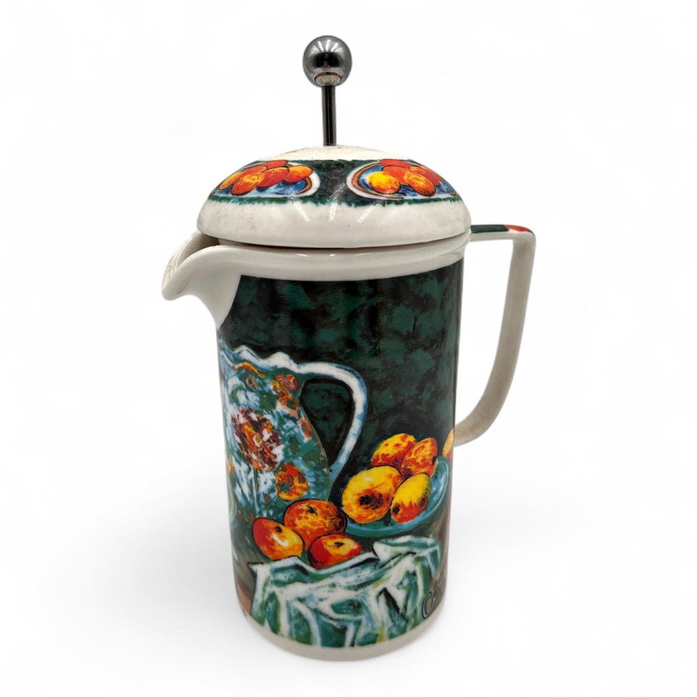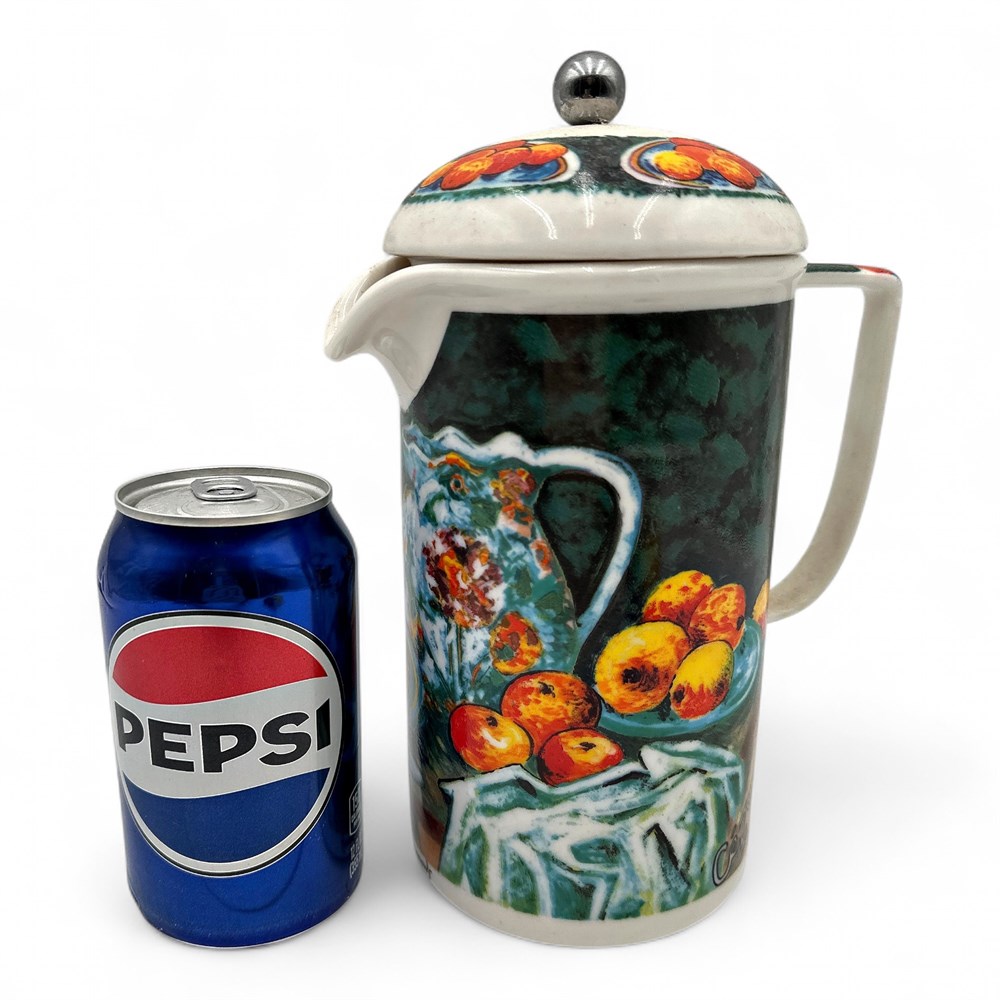 A Chaleur Master's Collection ceramic French press coffee pot featuring a design inspired by Paul Cézanne's "Still Life with Apples" painting. It has a 4-cup capacity. The item is microwave and dishwasher safe. The design is a discontinued piece from the collection. The original artwork inspiration for the design is from the French post-impressionist painter Paul Cézanne. 9.5" H x 6.5" W (including handle); Base: 4" W Good condition.
