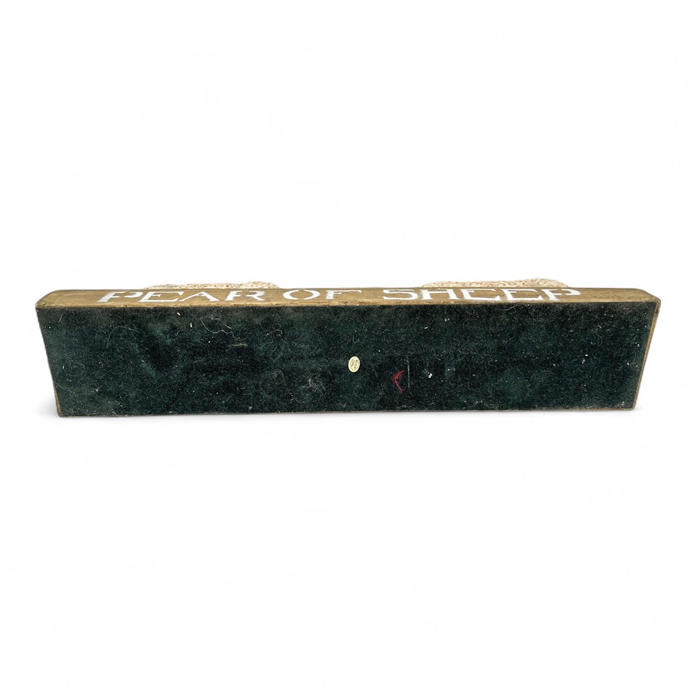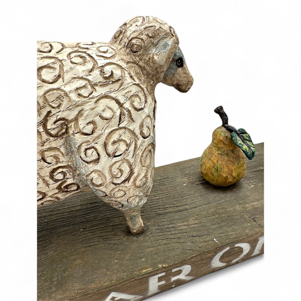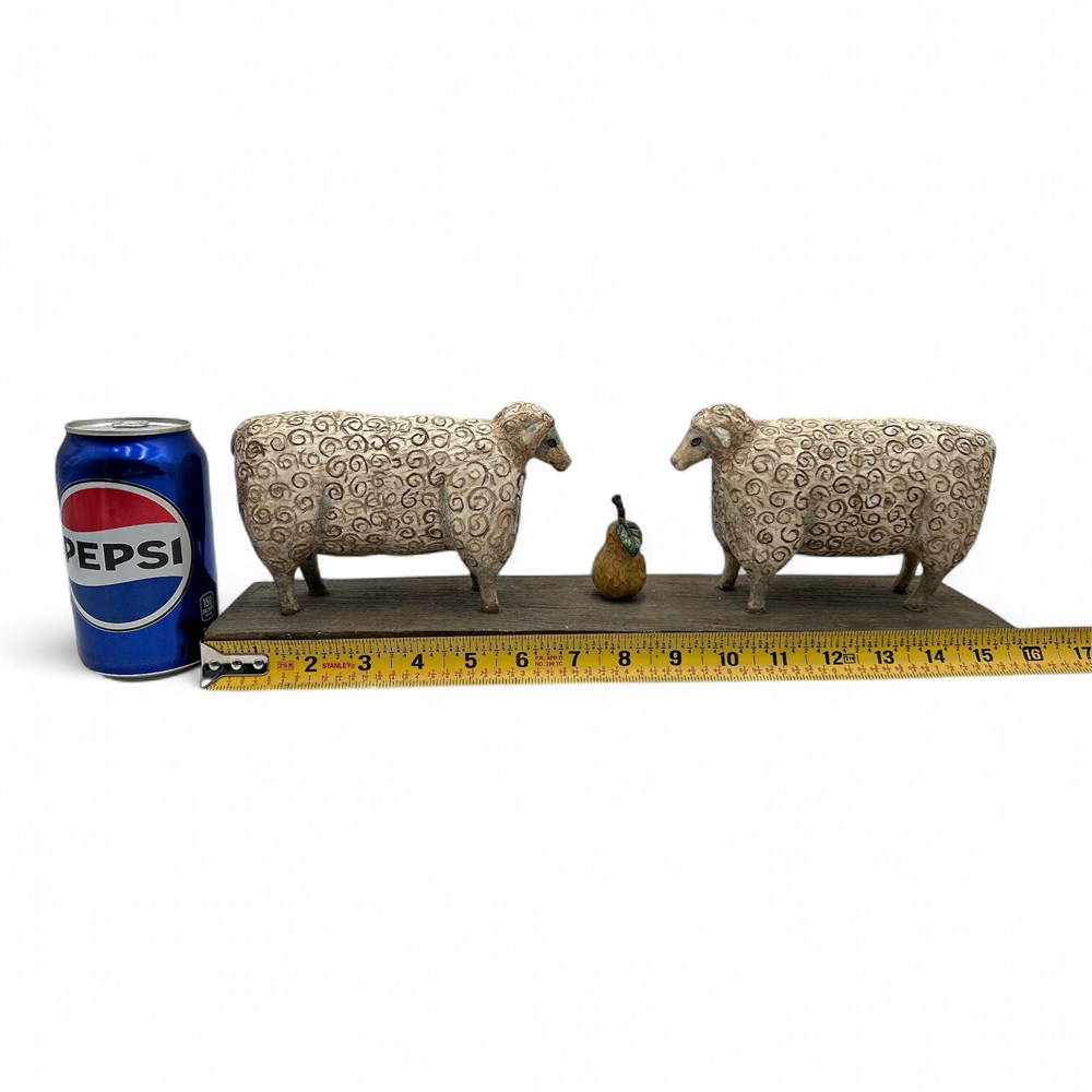 A "Pear of Sheep" figurine, a piece of primitive folk art made of resin by Ohio-born artist David Harden. The sculpture is of two sheep facing each other with a small object (a pear) in the middle on a base. It is a signed, vintage piece of home decor. It is known for its rustic, hand-carved look and distressed finish. 5.5" H x 16" L x 3.5" W Good condition.
