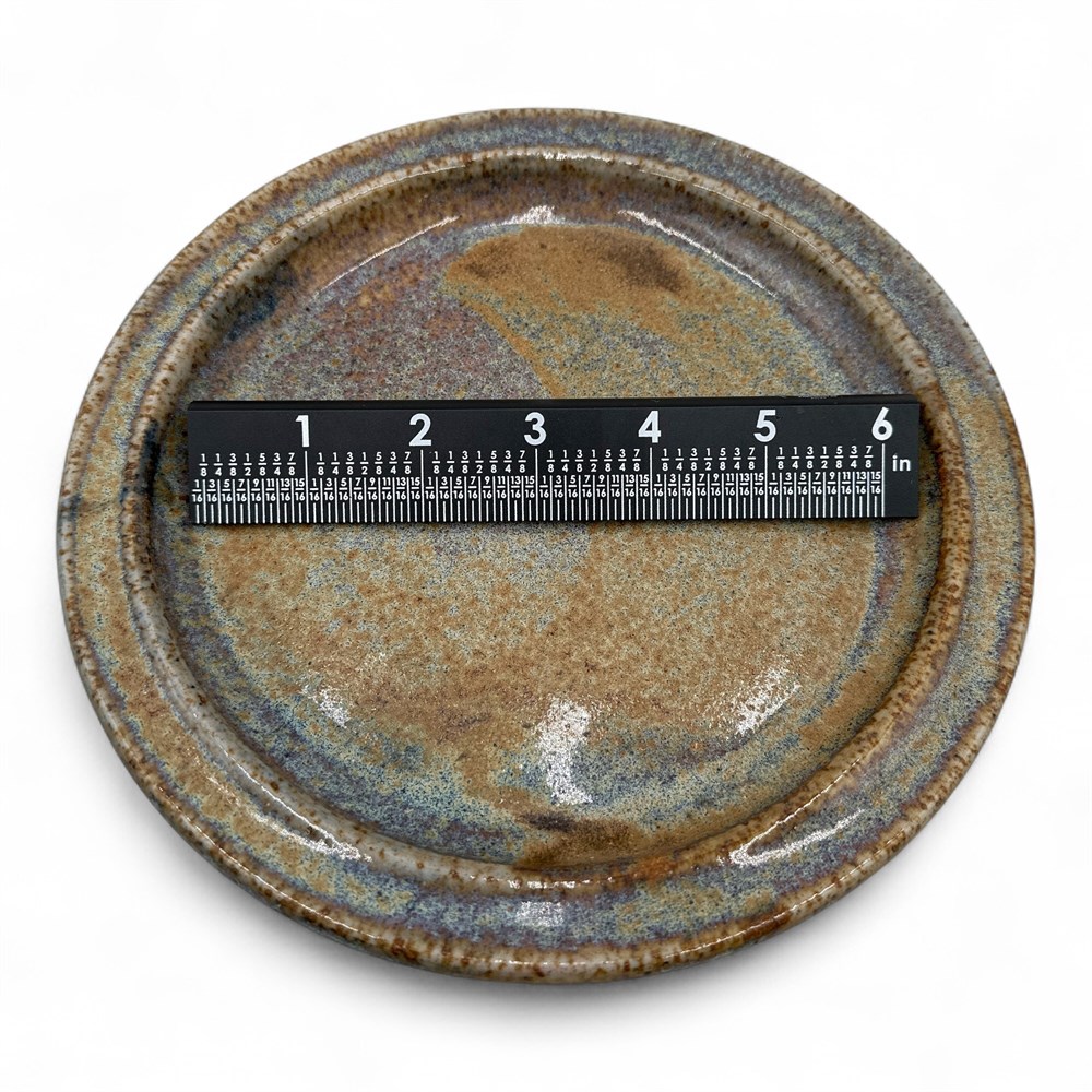 A handmade ceramic plate with a light blue and beige glaze. The plate is wheel-thrown, indicating studio art pottery. It has a low profile, a wide rim, and a slightly textured, glossy finish. The glaze displays variations in color and texture, making the piece unique. 8.25" W Good condition.