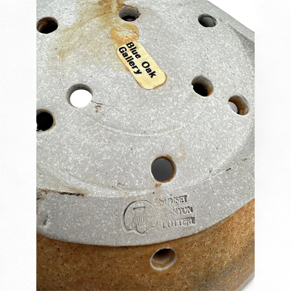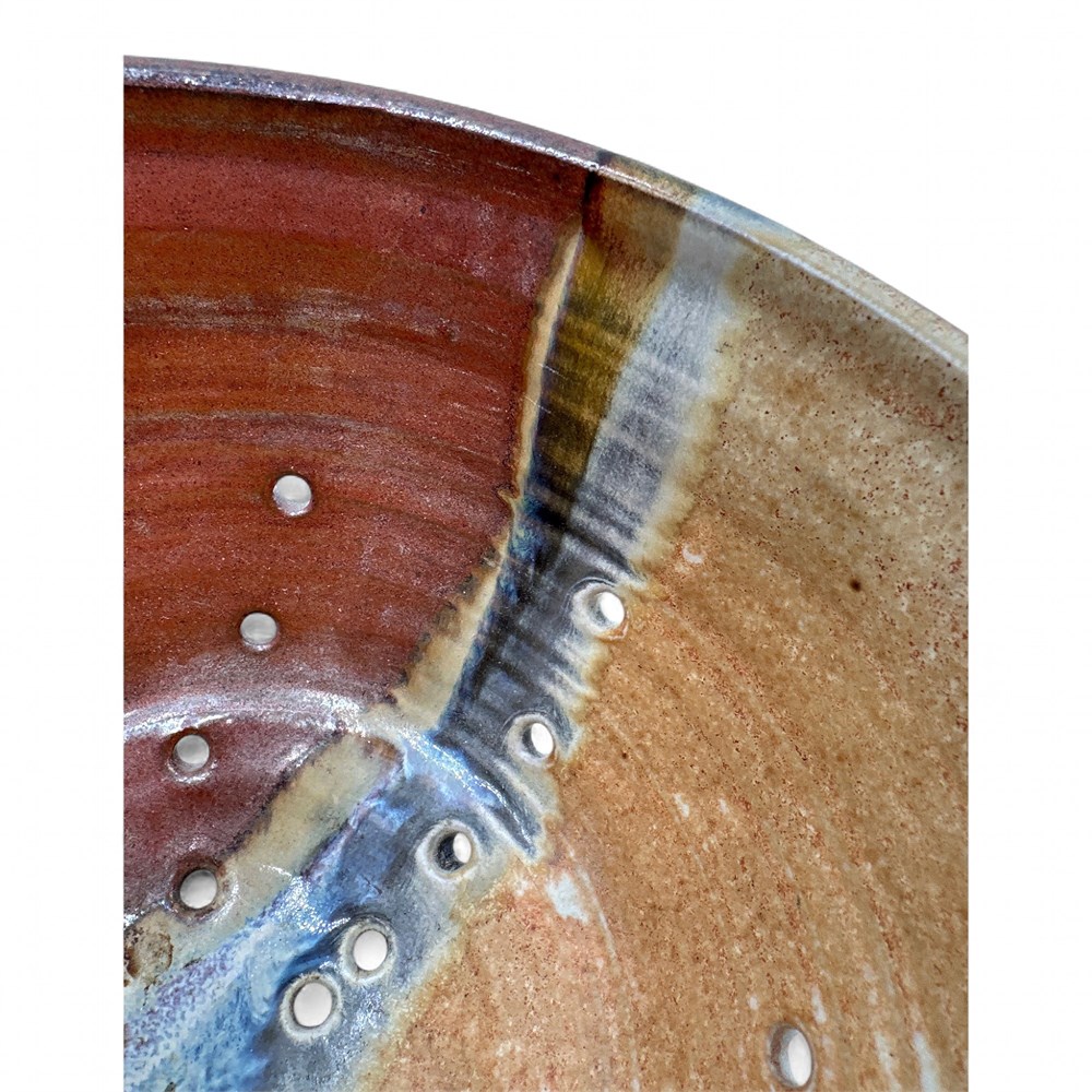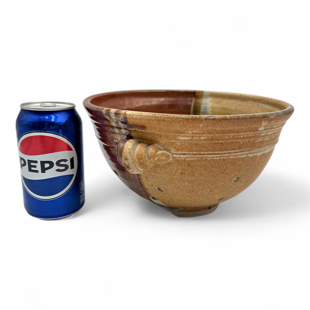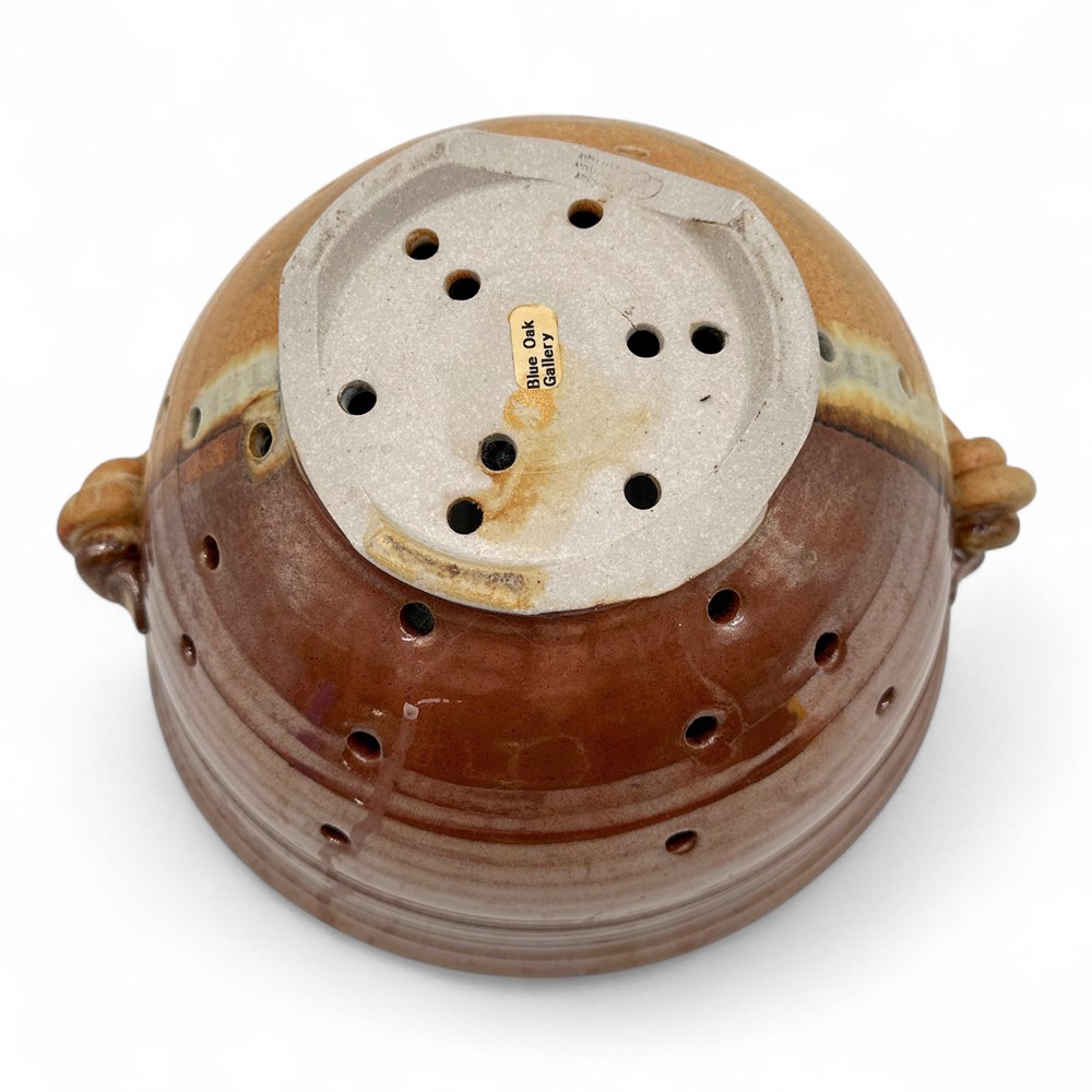 A berry bowl or colander that was sold at the Blue Oak Gallery from Sunset Canyon Pottery. Sunset Canyon Pottery is an Austin, Texas-based studio known for handcrafted stoneware that includes similar berry bowls (colanders) in various glazes. Their items are all hand-thrown and feature a wide range of glaze patterns, with slight variations in each piece due to their handmade nature. 5" H x 9" Dia x 10.5" W (including handles) Good condition.