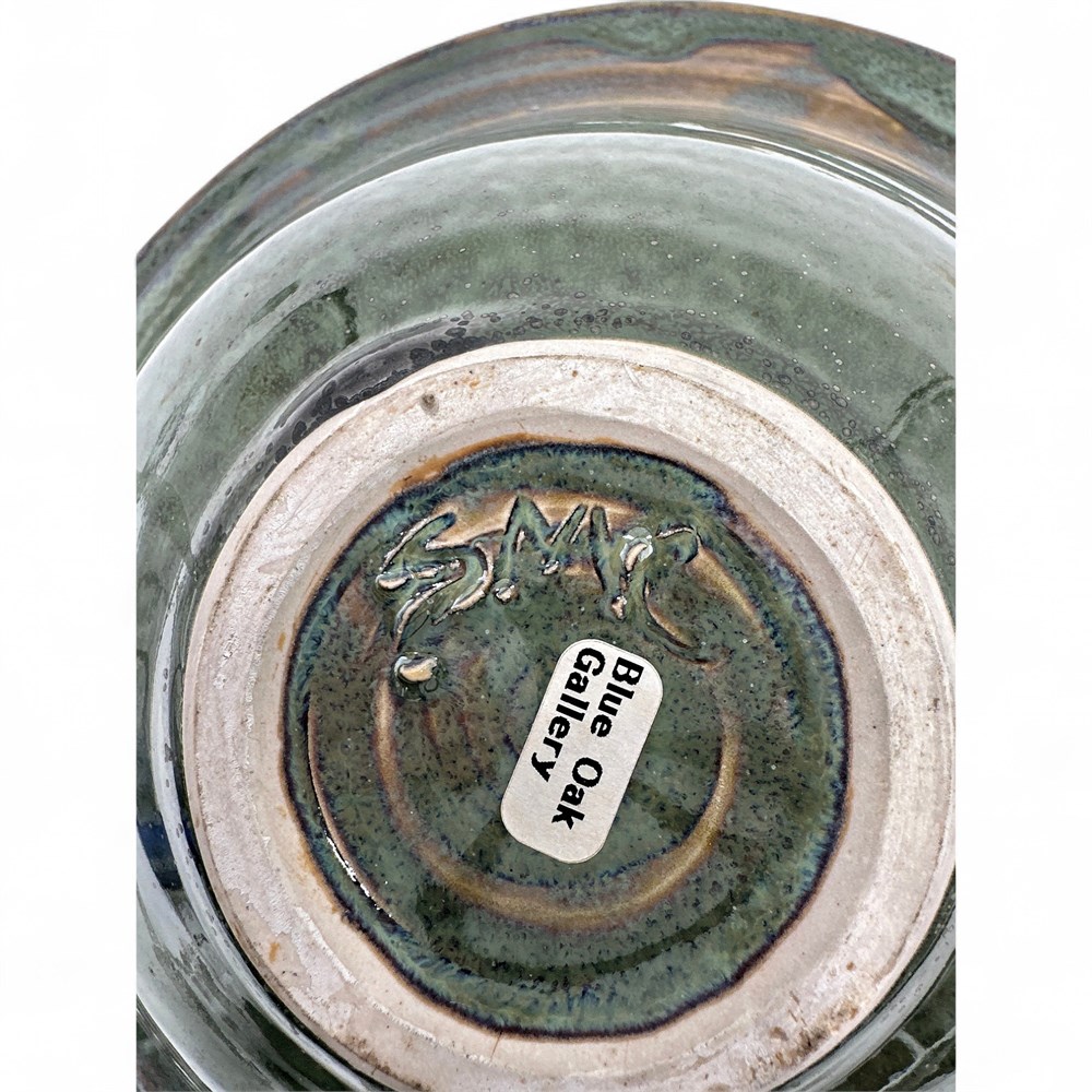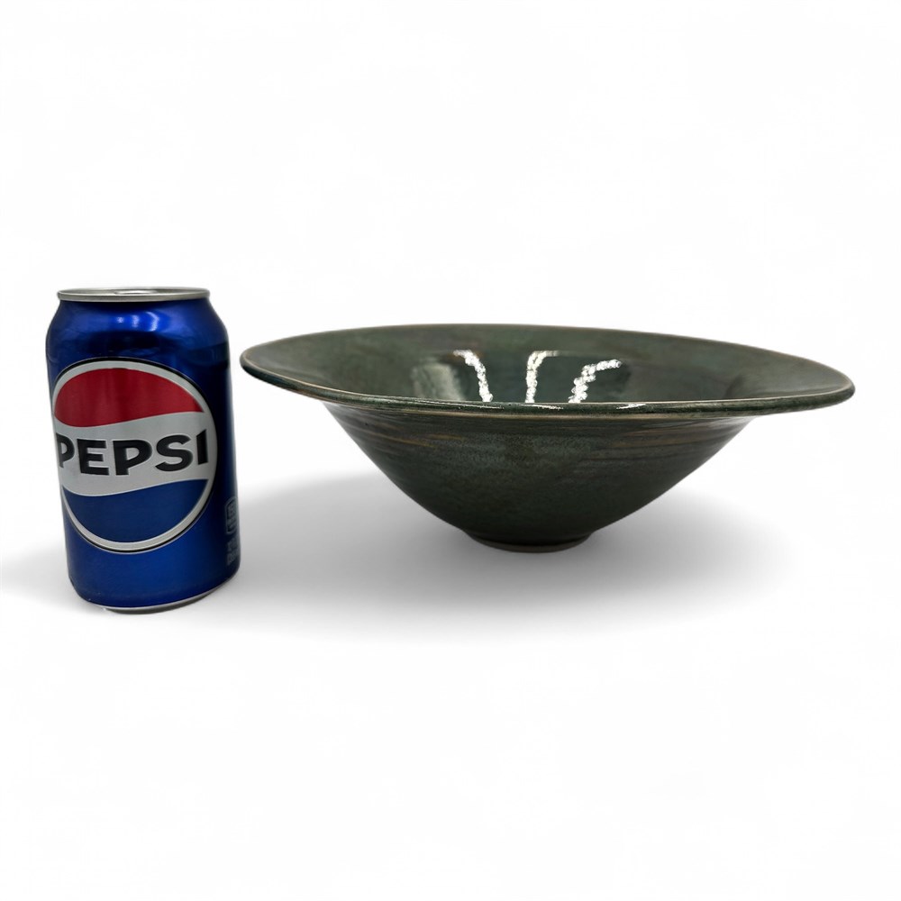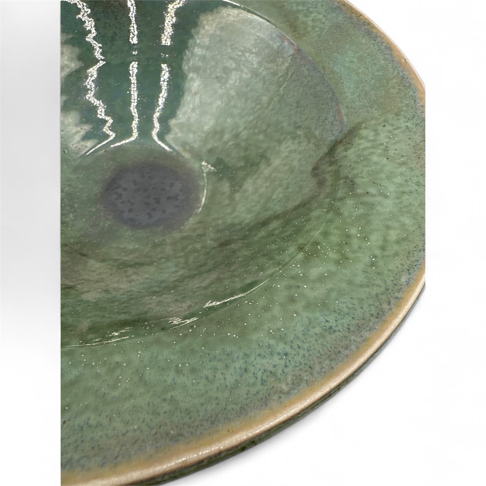 An organic modern abstract studio form art pottery bowl. It is a hand-thrown studio pottery bowl with a striking form. The bowl features a glossy glaze, appearing in shades of green. It has a wide, shallow bowl shape with a narrow base. Artist's initials at underside. 3.5" H x 10.5" W Good condition.