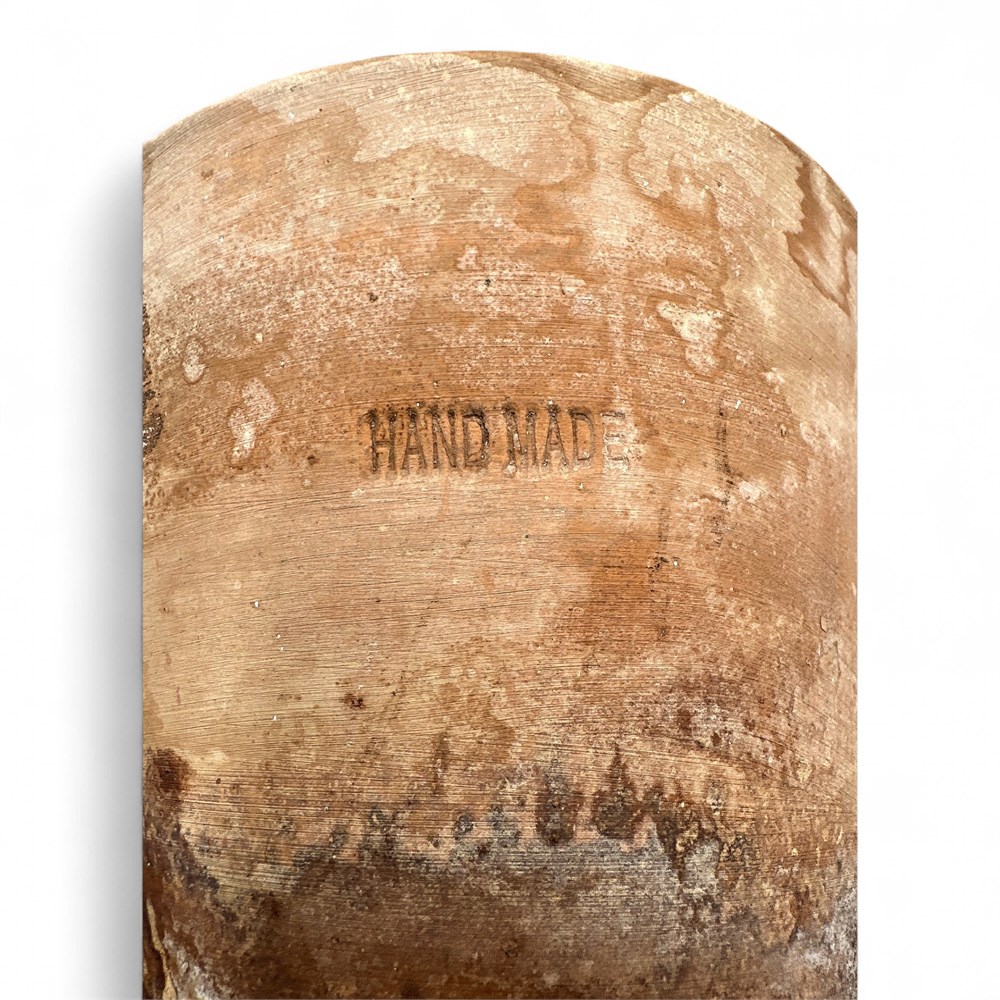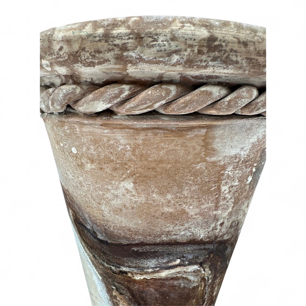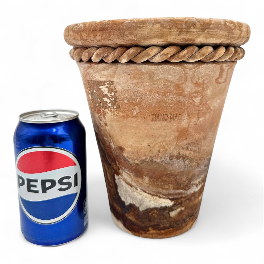 A terracotta planter pot with a distinctive rope design around the rim. The pot has a weathered or aged finish, giving it a rustic, vintage appearance. marked "handmade" at underside. 8" H x 7" W (top) x 4" W (base Good condition.