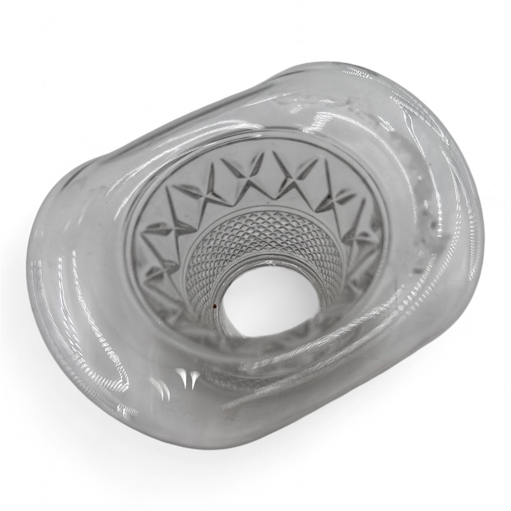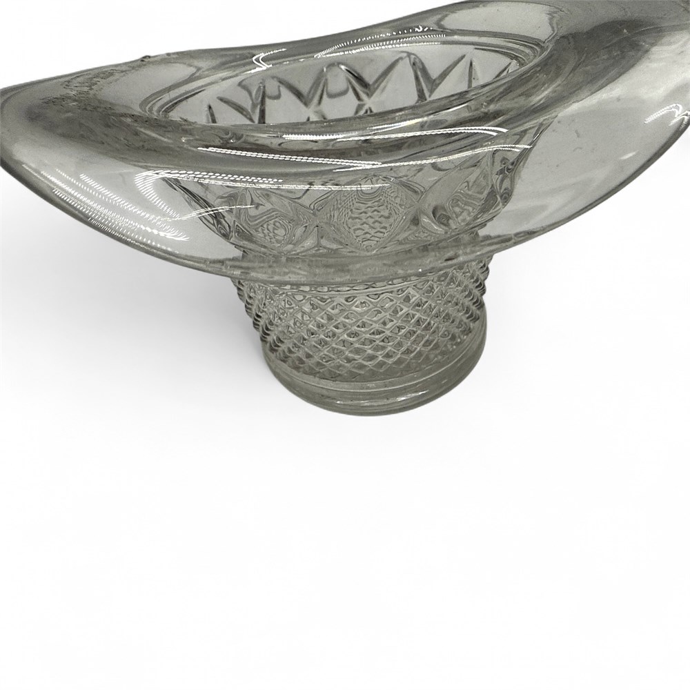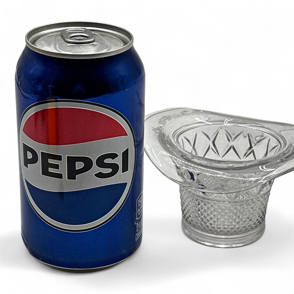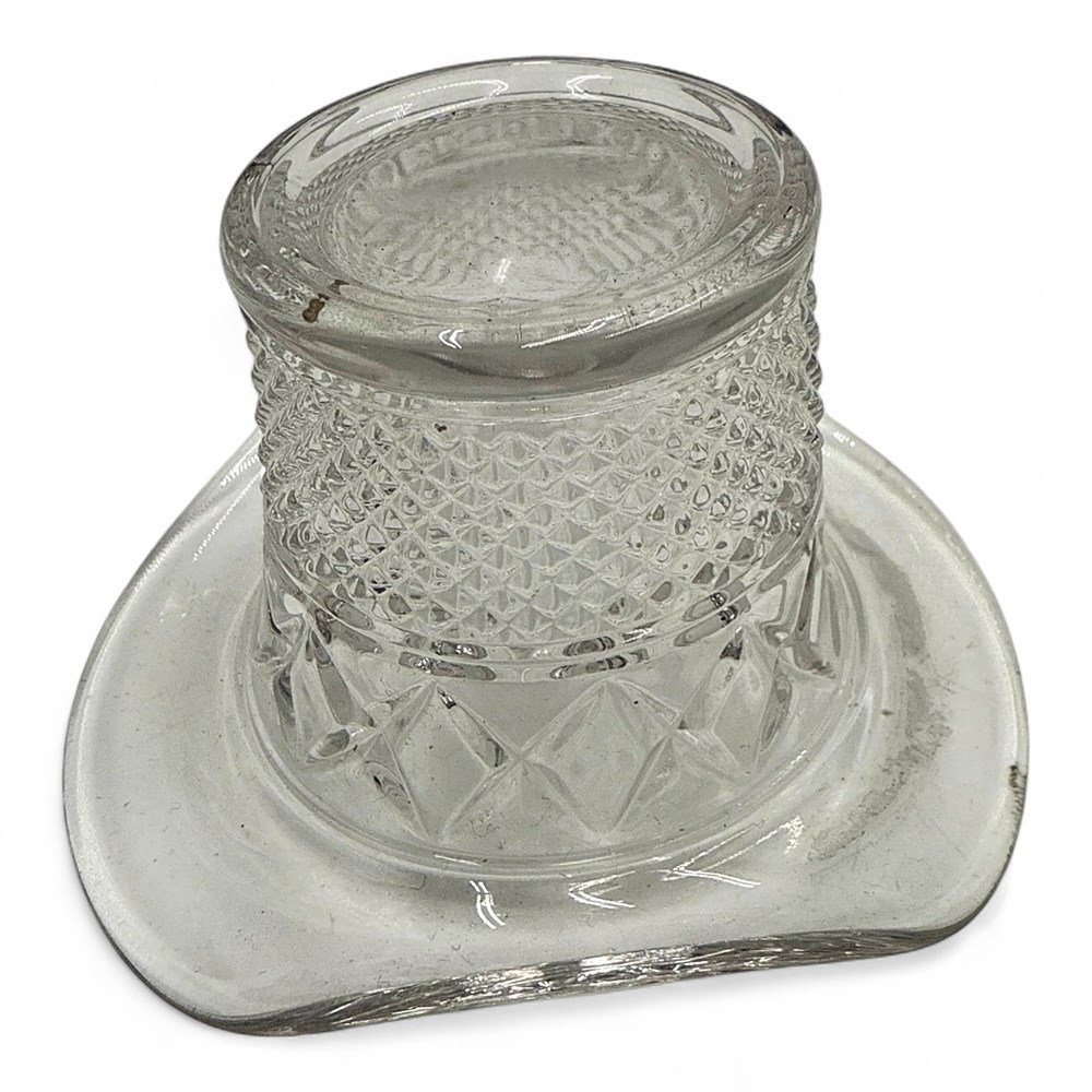 A vintage Duncan & Miller clear glass top hat. It features a diamond or crisscross pattern, sometimes referred to as the "Kimberly" pattern. It is made of pressed glass. It is a discontinued piece from the manufacturer. These items are popular among glass hat collectors. 2 1/4" H x 4" W Good condition.