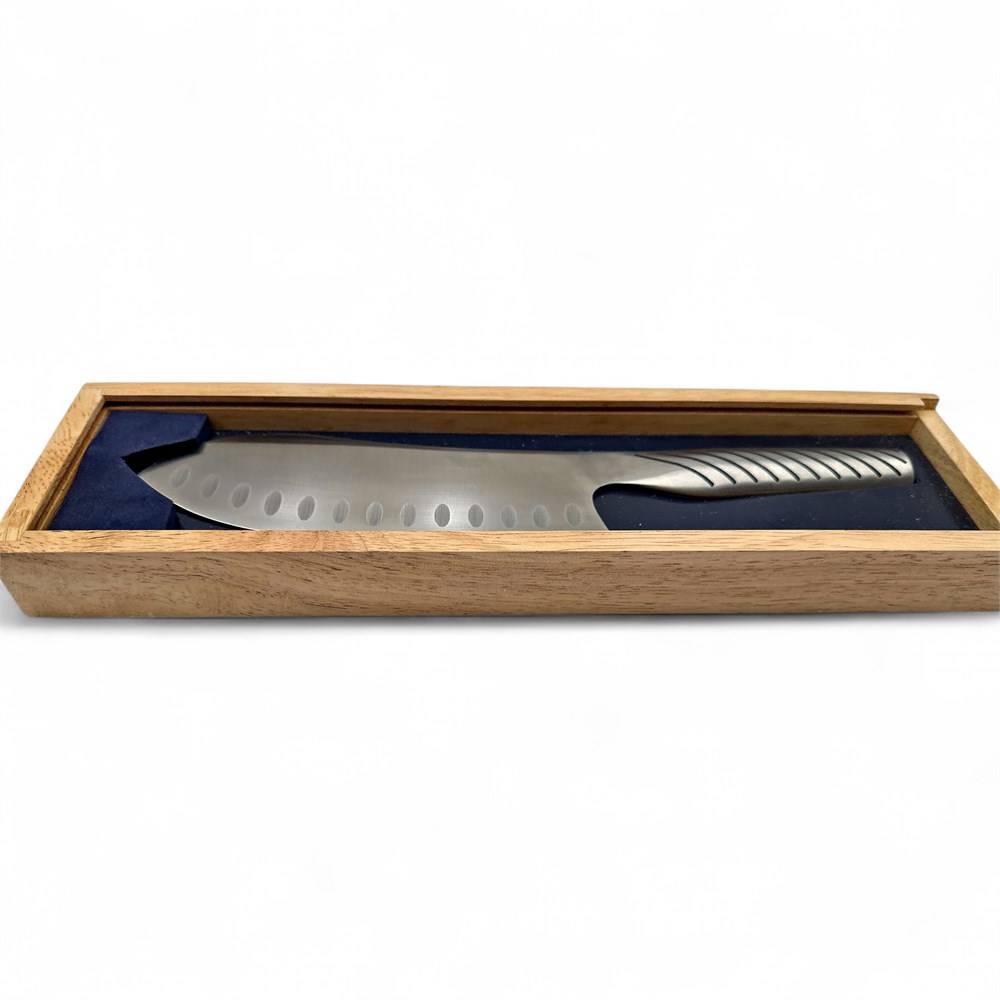 A Technique 7" Kohaishu Japanese stainless steel knife. It is a high-quality chef's knife designed for home use that combines features of both a santoku and a chef's knife for precision performance. Hybrid knife designed for slicing, dicing, mincing, and chopping. Features a stainless steel handle for a comfortable grip. Made in Japan. 11 1/2" L Good condition.