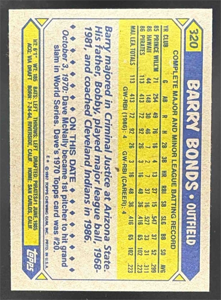 1987 Topps Barry Bonds #320 Rookie Pirates View Watchlist >
