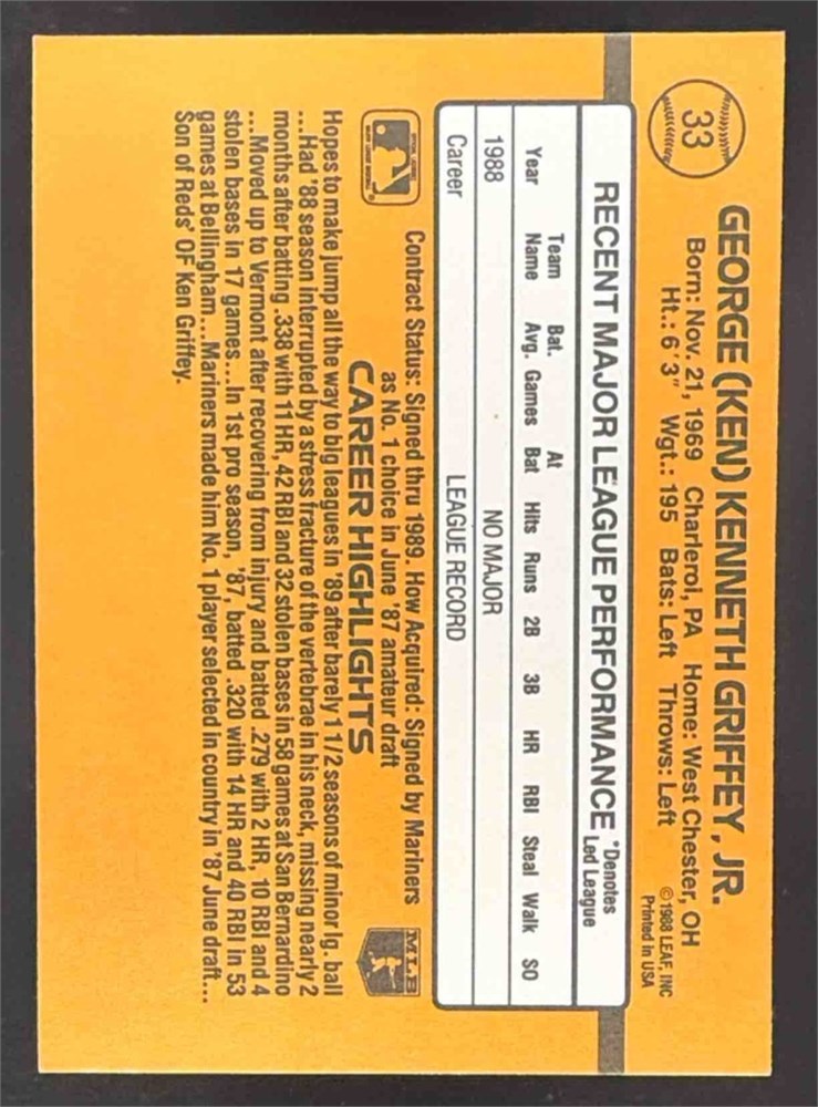 1989 Donruss #33 Ken Griffey Jr. Rookie Rated Rookie Mariners
