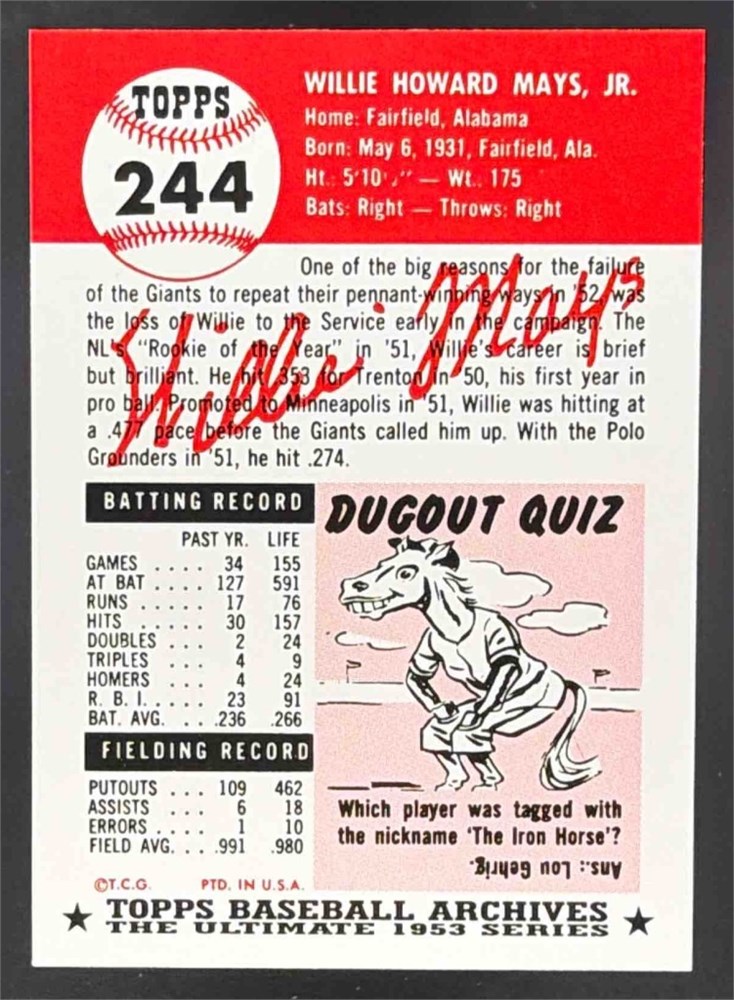 1953 Topps Baseball Willie Mays #244 New York Giants Archives