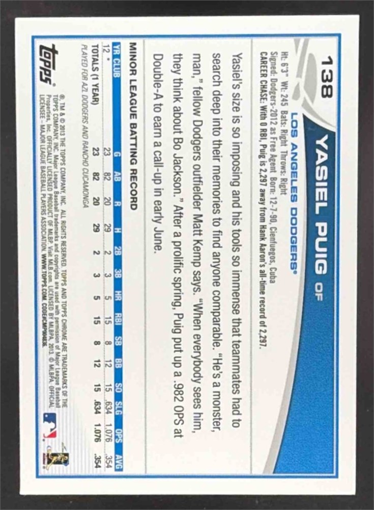2013 Topps Chrome #138a Yasiel Puig Rookie Dodgers Rookie