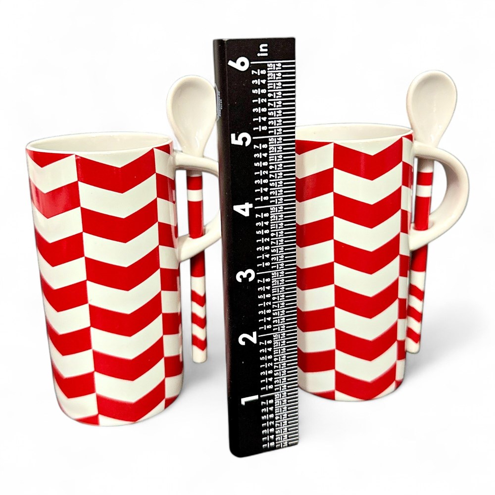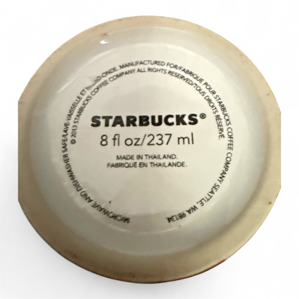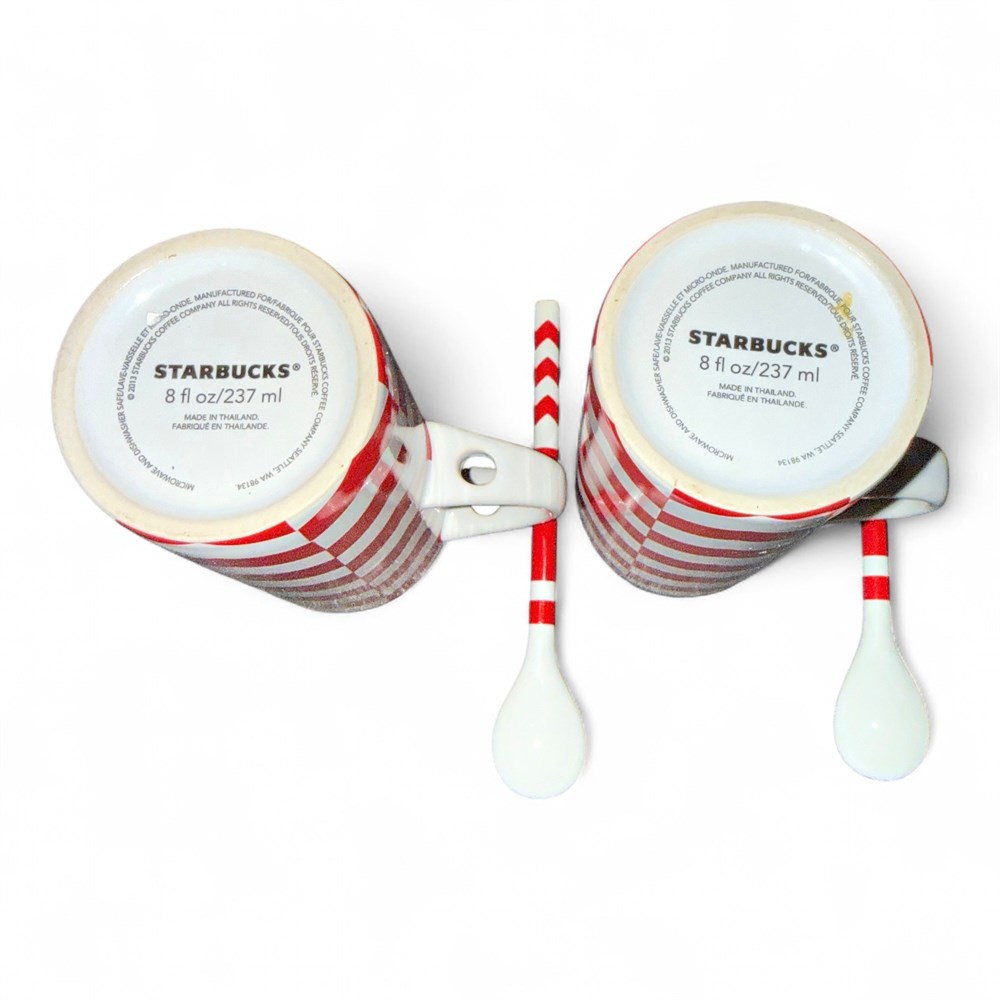 This is a set of Starbucks ceramic mugs with matching spoons, created in 2013 and manufactured in Thailand. It includes two mugs and two coordinating spoons, with each spoon designed to fit into the mug handle. The mugs are stamped on the bottom with Starbucks markings. Each mug measures approximately 5 inches in height, and each spoon measures approximately 5 1/2 inches in length. The lot is in good condition.