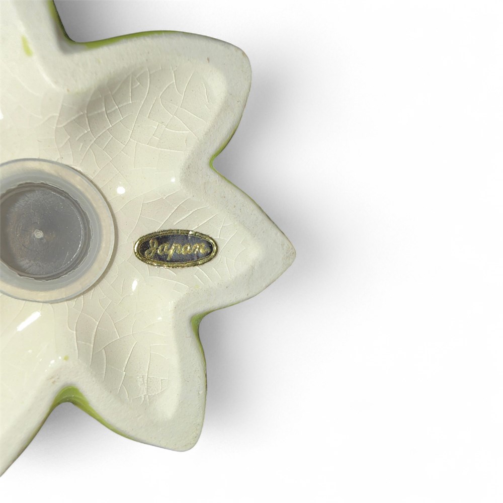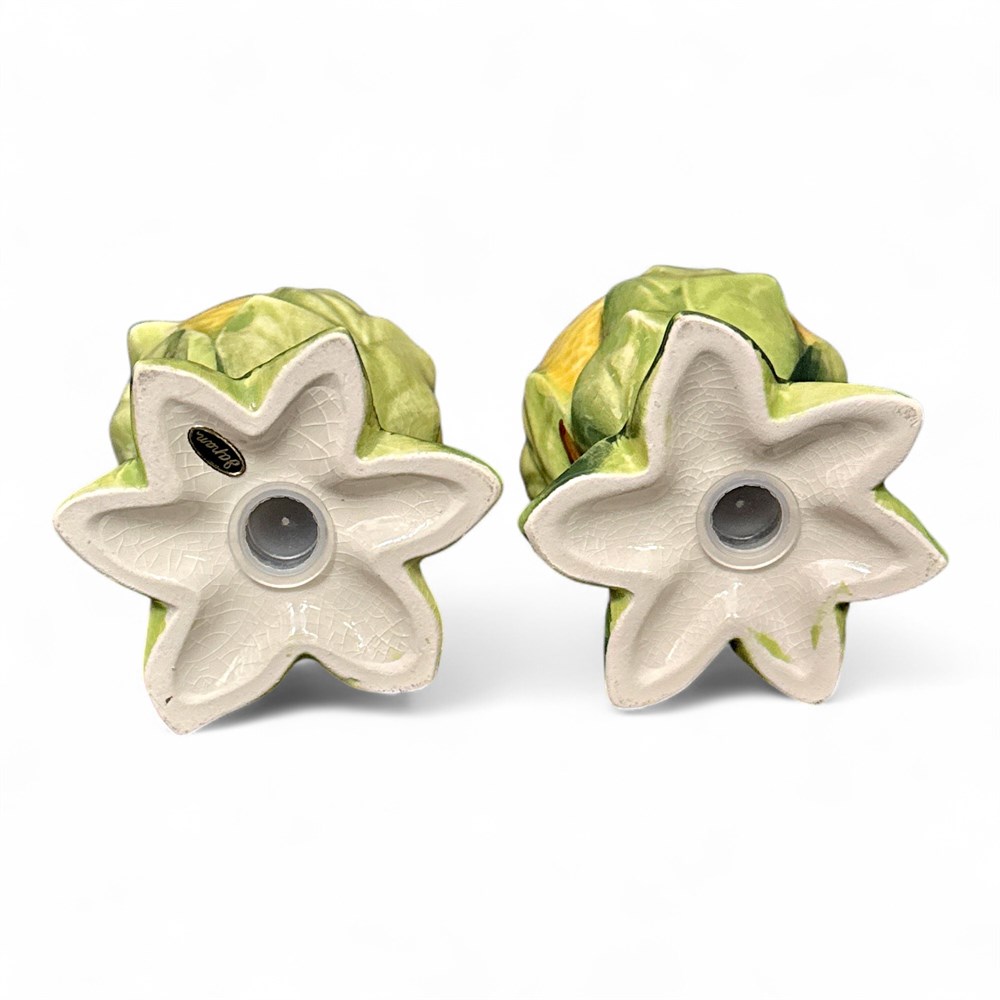 This is a vintage pair of ceramic salt and pepper shakers produced in the mid to late 20th century. They are Italian style in design and retain the original tag marked “Japan.” The set includes one salt shaker and one pepper shaker. They are formed as lemons with applied fruit and leaf detailing, with stand-up green leaves serving as the base. They measure approximately 3 1/2 inches in height each. The lot is in good condition.