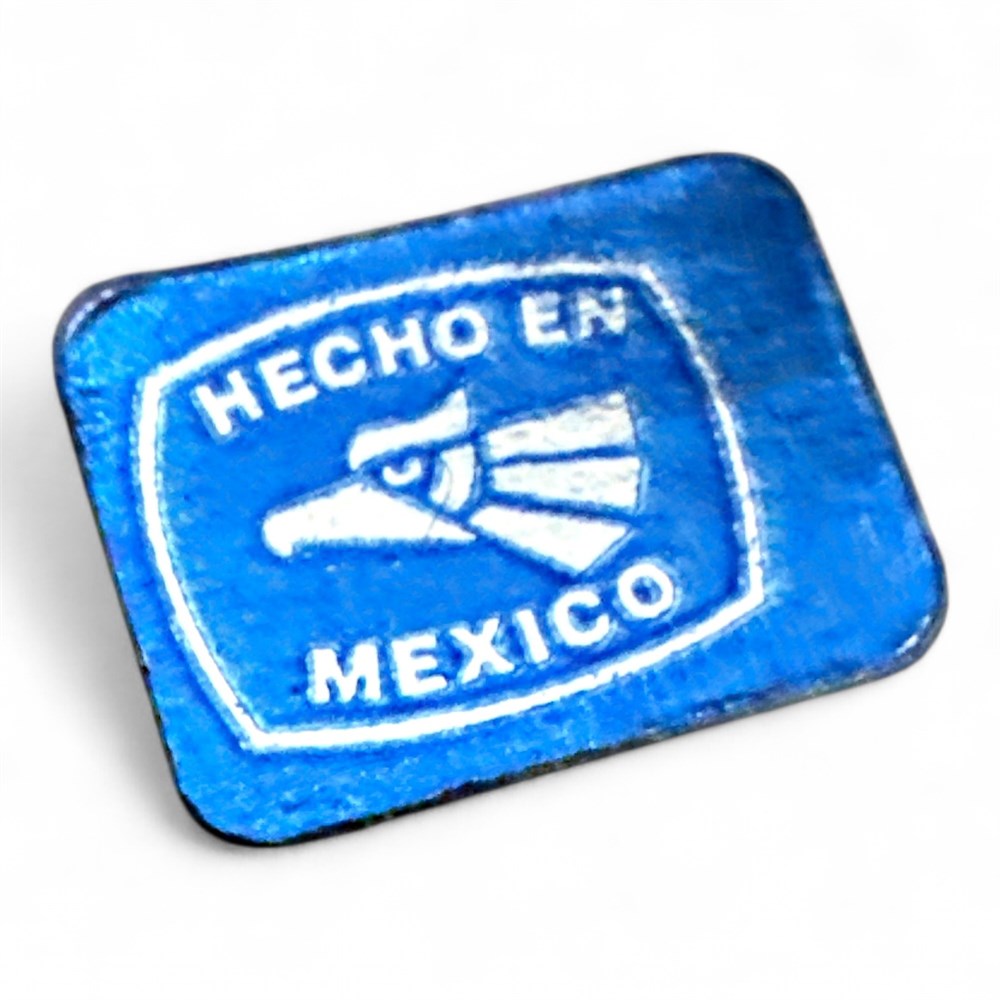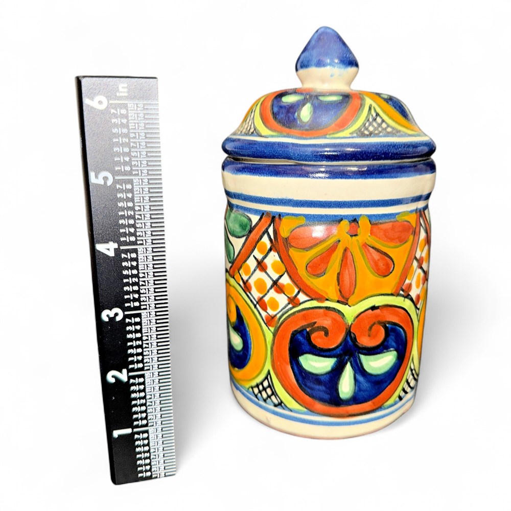 This is a Mexican Talavera style pottery jar with a fitted lid, also referred to as a ginger jar or canister. The piece is handcrafted, hand-painted, and hand-glazed, reflecting traditional Mexican ceramic design influenced by Spanish heritage. The surface is decorated with stylized floral and geometric motifs arranged in repeating panels. The jar retains the original tag reading “Hecho En Mexico.” It measures approximately 7 1/2 inches in height. The piece is in good condition.
