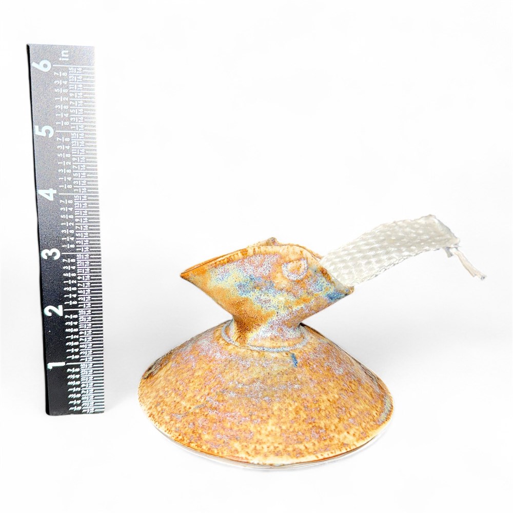 This is a vintage studio pottery oil lamp candle created by artist Eileen Black. The piece is ceramic, with a glazed finish. The form features a rounded base with an integrated spout and exposed wick. The surface displays a speckled glaze with iridescent tonal variation and an organic finish typical of studio pottery. The underside is artist signed and the piece was sold by Blue Oak Gallery. The lamp includes the original paper with printed instructions for lighting and use. It measures approximately 4 1/2 inches in height. The piece is in good condition.