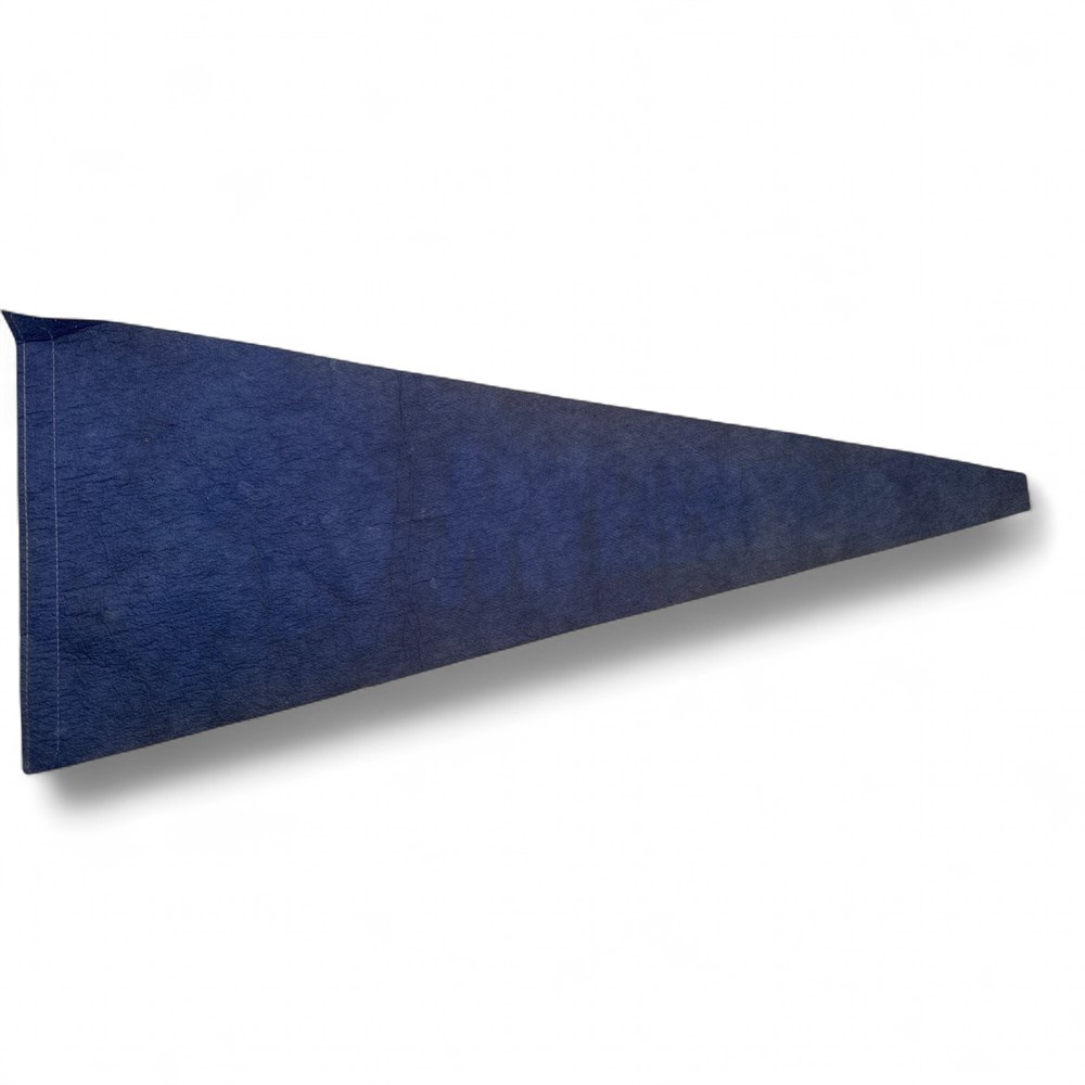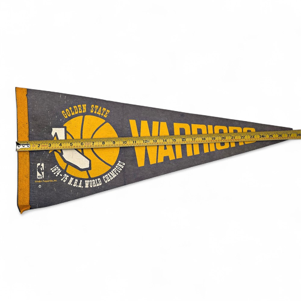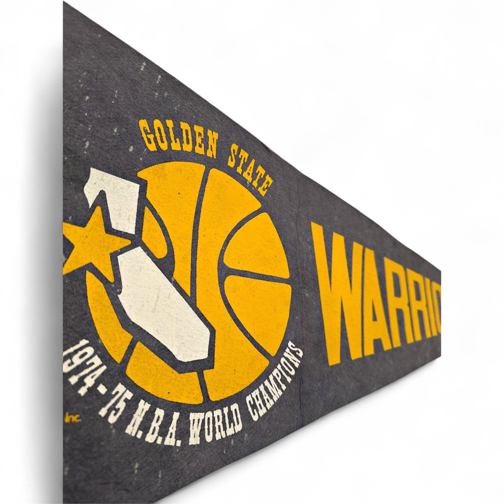 A vintage Golden State Warriors 1974-75 NBA World Champions pennant. It commemorates the Warriors' 1975 NBA Championship win. The pennant is made of felt and features the team's retro logo and colors from that era. 27.5" L x 12" H Good condition.