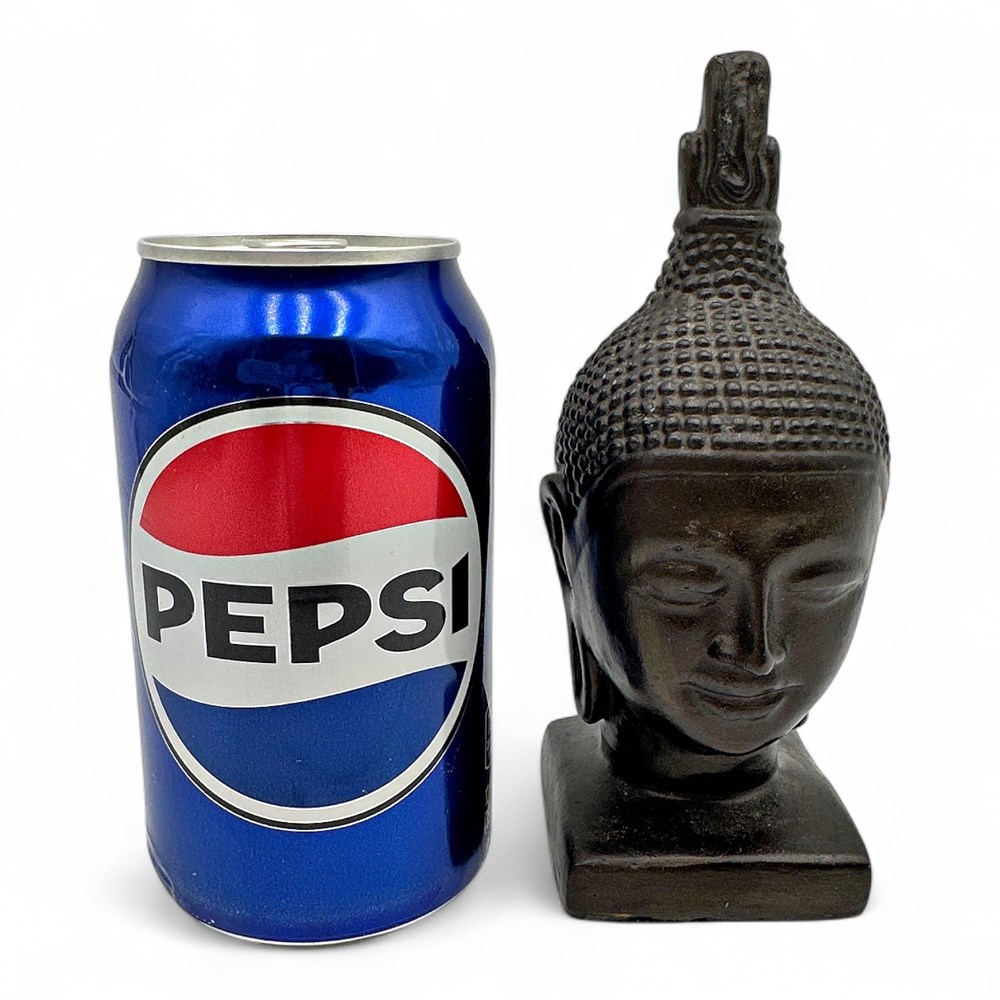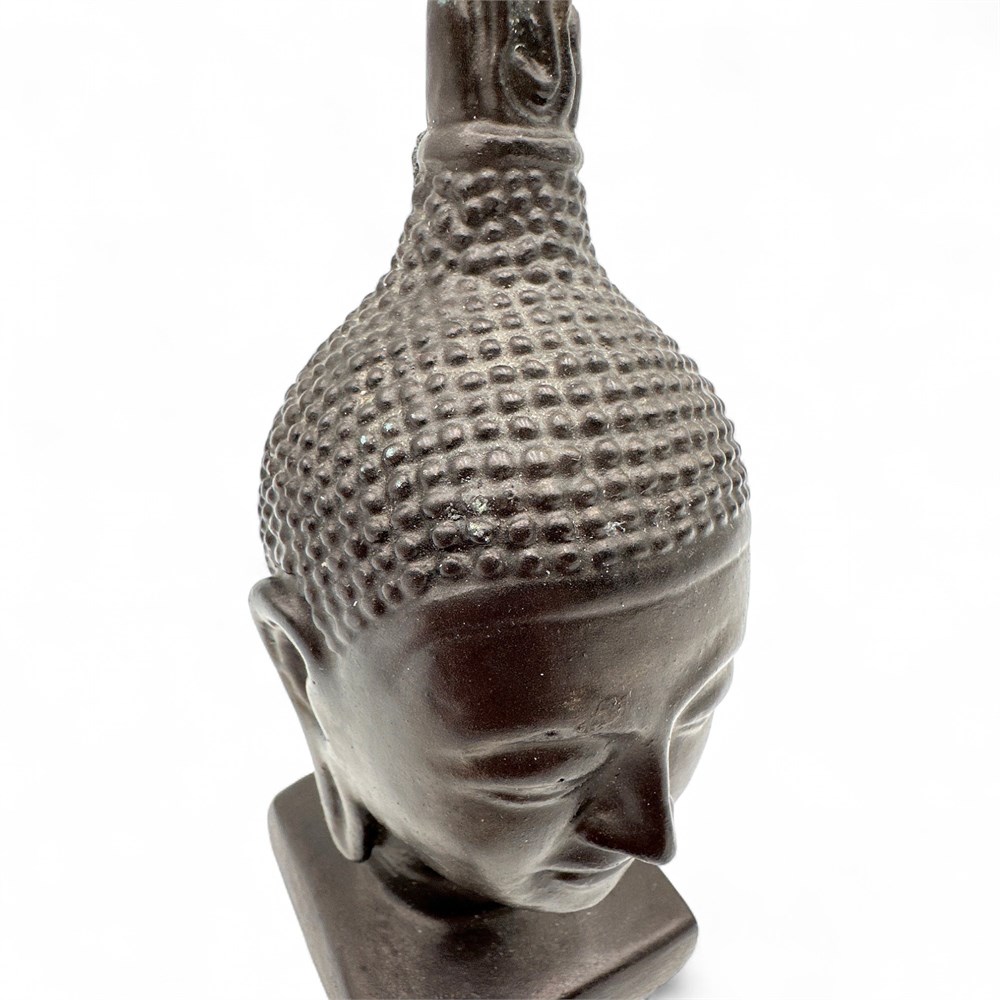 A Buddha head statue, which is a popular decorative item that symbolizes Buddha's wisdom and knowledge. The specific style, with its small, tightly packed curls (ushnisha) and serene, half-closed eyes, is reminiscent of traditional Indian art styles like the Gupta or Sarnath periods, which later influenced art in Southeast Asia. The cranial bump on top of the head represents Buddha's expanded wisdom and spiritual awakening. The dot between the eyebrows (though faint in this specific carving) symbolizes the Buddha's supernatural vision or "third eye". The elongated earlobes are a reminder of Prince Siddhartha's life of luxury when he wore heavy, extravagant earrings before renouncing his material wealth to pursue a spiritual path. The facial expression indicates a state of deep meditation, looking inward to the self as well as outward to the world. 6" H x 2.25" W Good condition.