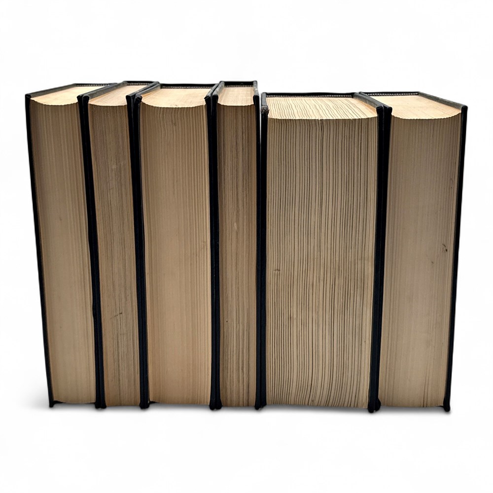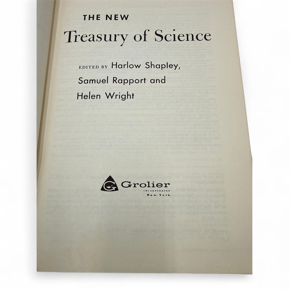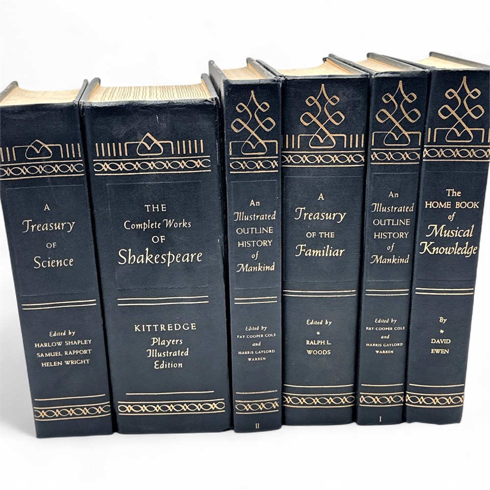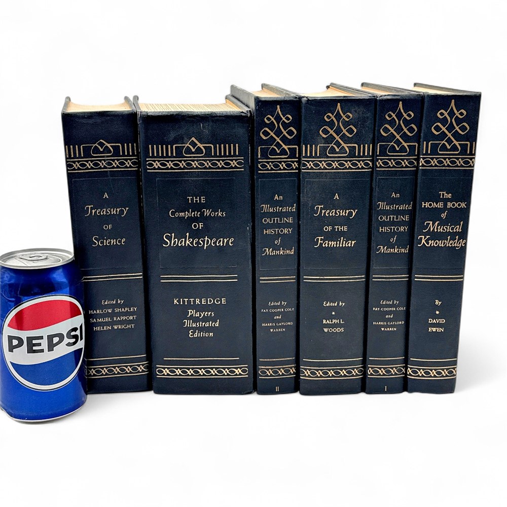 A set of 6 vintage hardcover books which are part of a multi-volume "Treasury" book collection published by Grolier and Spencer Press, typically found in sets of 10 or 12 volumes, with publication dates often in the 1950s and 1960s. includes: A Treasury of Science, edited by Harlow Shapley, The Complete Works of Shakespeare, Kittredge Players Illustrated Edition, The Outline History of Mankind, A Treasury of the Familiar, and The Home Book of Musical Knowledge. The collection covers a wide range of subjects, including literature, science, philosophy, history, and more. 9" x 6" Good condition.