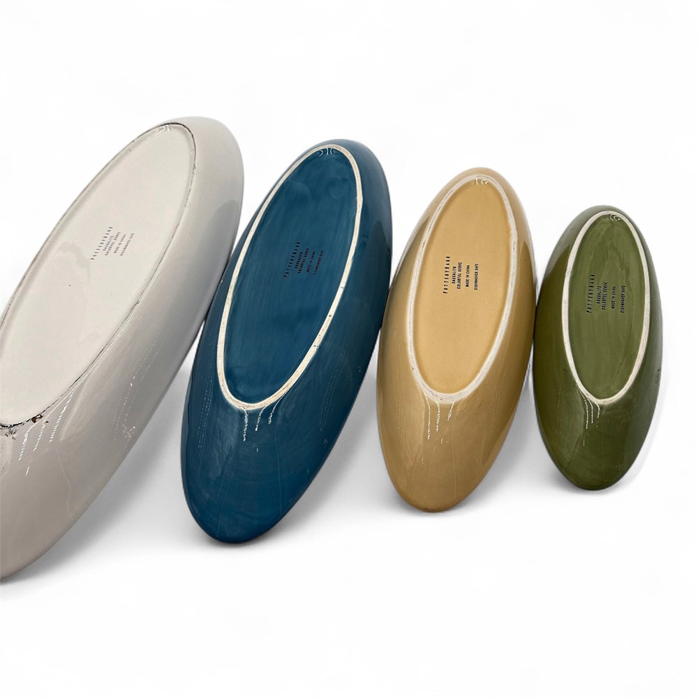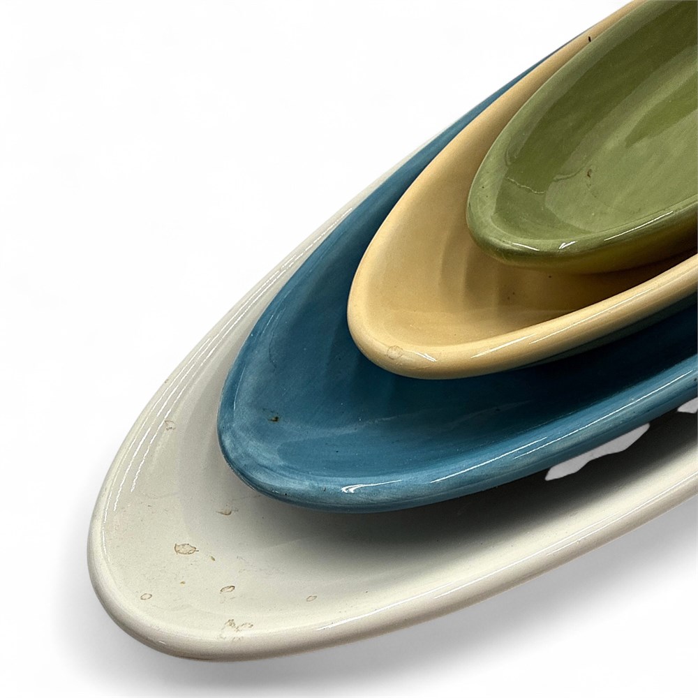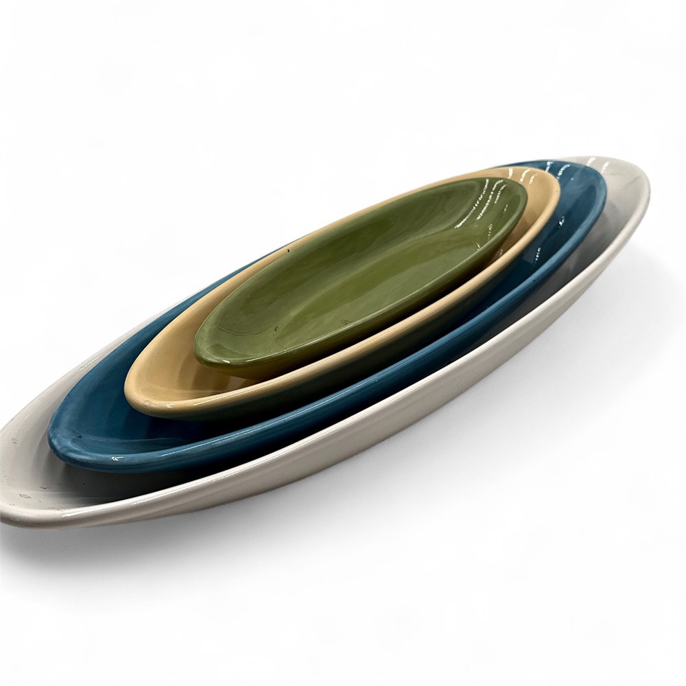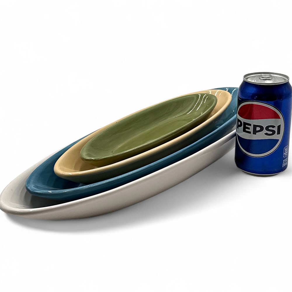 Four Pottery Barn "Colorful Serve" or "Sausalito" collections oval nesting serving platters. They are ceramic serving platters in a variety of solid colors. Largest bowl: 20" x 6" Good condition.