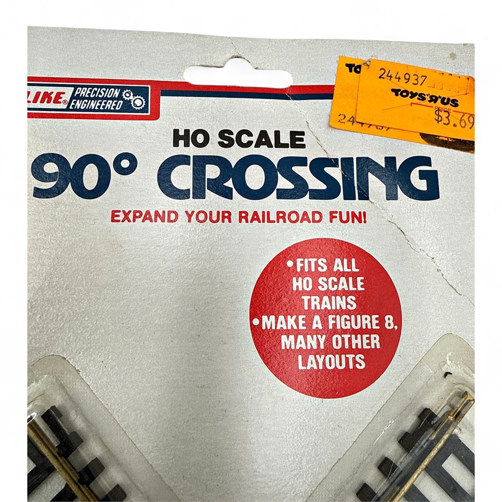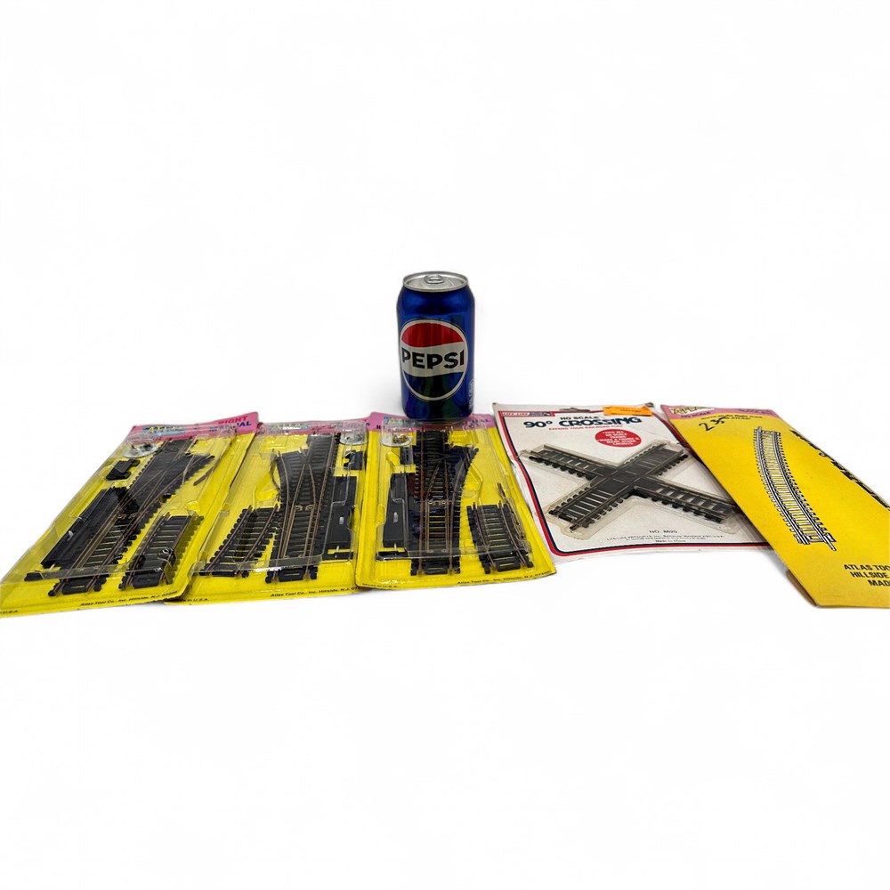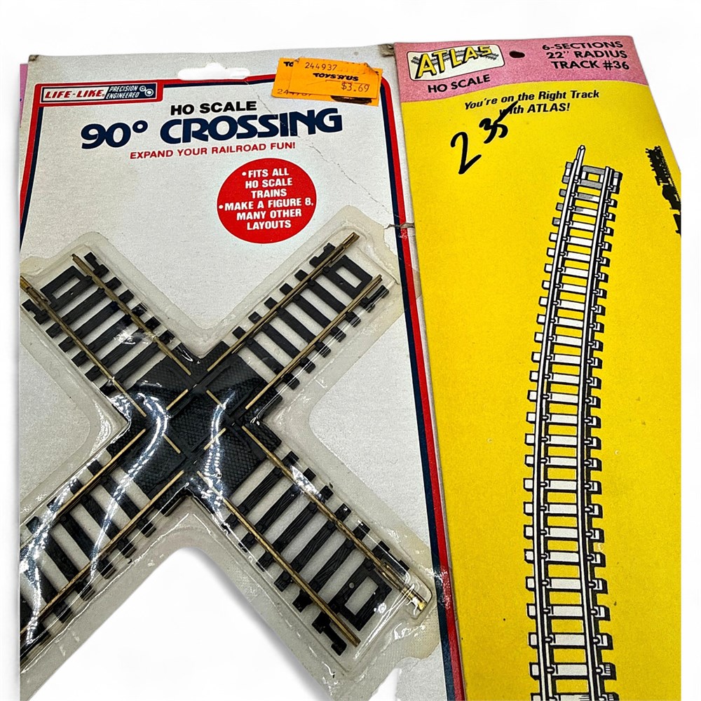 A vintage lot of HO scale model train track sections by Atlas and Life-Like. The lot includes various sections such as a 90-degree crossing, curved track, and right-hand manual switches. The items are in HO scale, which is a popular size for model railroading. The tracks feature nickel silver rails and black or brown ties, depending on the specific model. The packaging indicates compatibility with all HO scale trains, allowing for various layout designs. 11 1/2" x 4 1/2" New in original packaging.