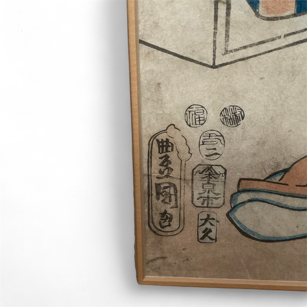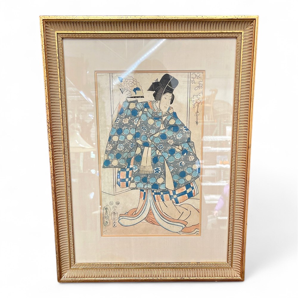 This lot comprises a modern print, after a 19th-century yakusha-e (kabuki actor print) by Utagawa Kunisada (Japan, 1786–1865), also known as Toyokuni III. The image derives from Kunisada’s original oban-format actor portraits executed circa 1853 and depicts a richly costumed kabuki actor rendered in the vivid, decorative style for which the artist is renowned. Kunisada was the most prolific and commercially successful ukiyo-e designer of his time, producing more than 20,000 prints and dominating the genre of actor prints throughout the mid-19th century Edo period. This example is a later, modern reproduction rather than an original Edo-period woodblock print. Presented in a gilt molded frame with mat. Overall dimensions approximately 20 x 15 inches. Condition is good, with light handling wear consistent with age and framing.