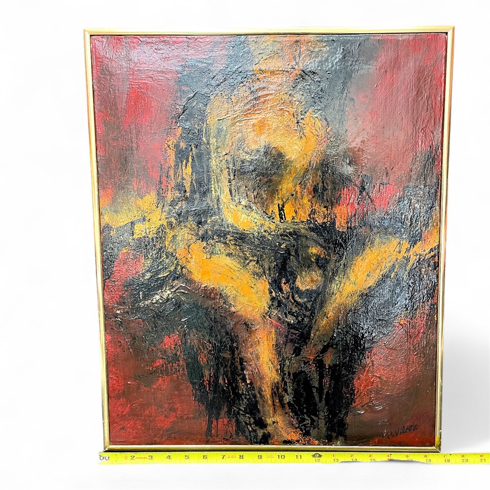 Heavily textured abstract expressionist painting executed in oil, featuring bold impasto brushwork and a dramatic palette of black, deep red, and vivid yellow. The composition is energetic and emotive, with dark central forms and forceful strokes of color suggesting movement and intensity, possibly evoking an abstracted figure or elemental force. The surface exhibits substantial texture throughout, emphasizing the physicality of the paint. Signed in the lower right corner with a stylized, partially illegible signature. Presented in a simple gilt frame. Measures approximately 23 inches by 19 inches. Overall good condition.