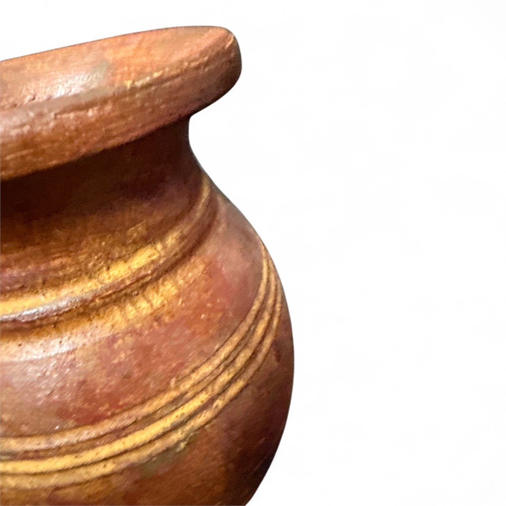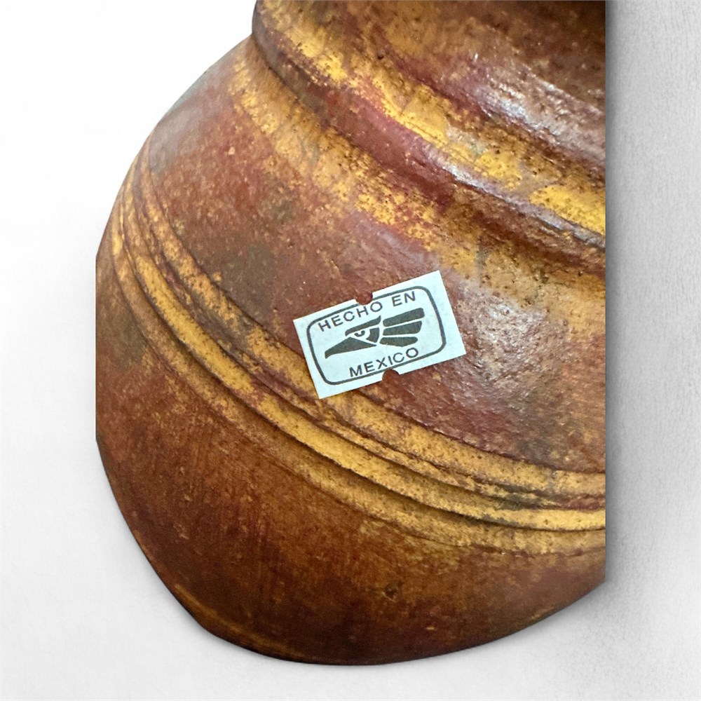 A rustic Mexican clay pottery vase, made from terracotta, featuring an earthy patina and a banded, ridged design. This style is part of a broad range of traditional Mexican folk art known as artesanía. It is made from natural clay or terracotta, which gives it a simple, organic, and matte or distressed finish. The vase has a classic pot shape with incised horizontal lines or ridges around the body, a common feature in many types of traditional Mexican and other world potteries. The warm, earthy look, with shades of brown, rust, and possible green or dark tones, is typical of low-temperature fired, unglazed, or naturally finished clay pottery from regions like Oaxaca or Jalisco. 11" H x 6" Dia (top) Good condition.