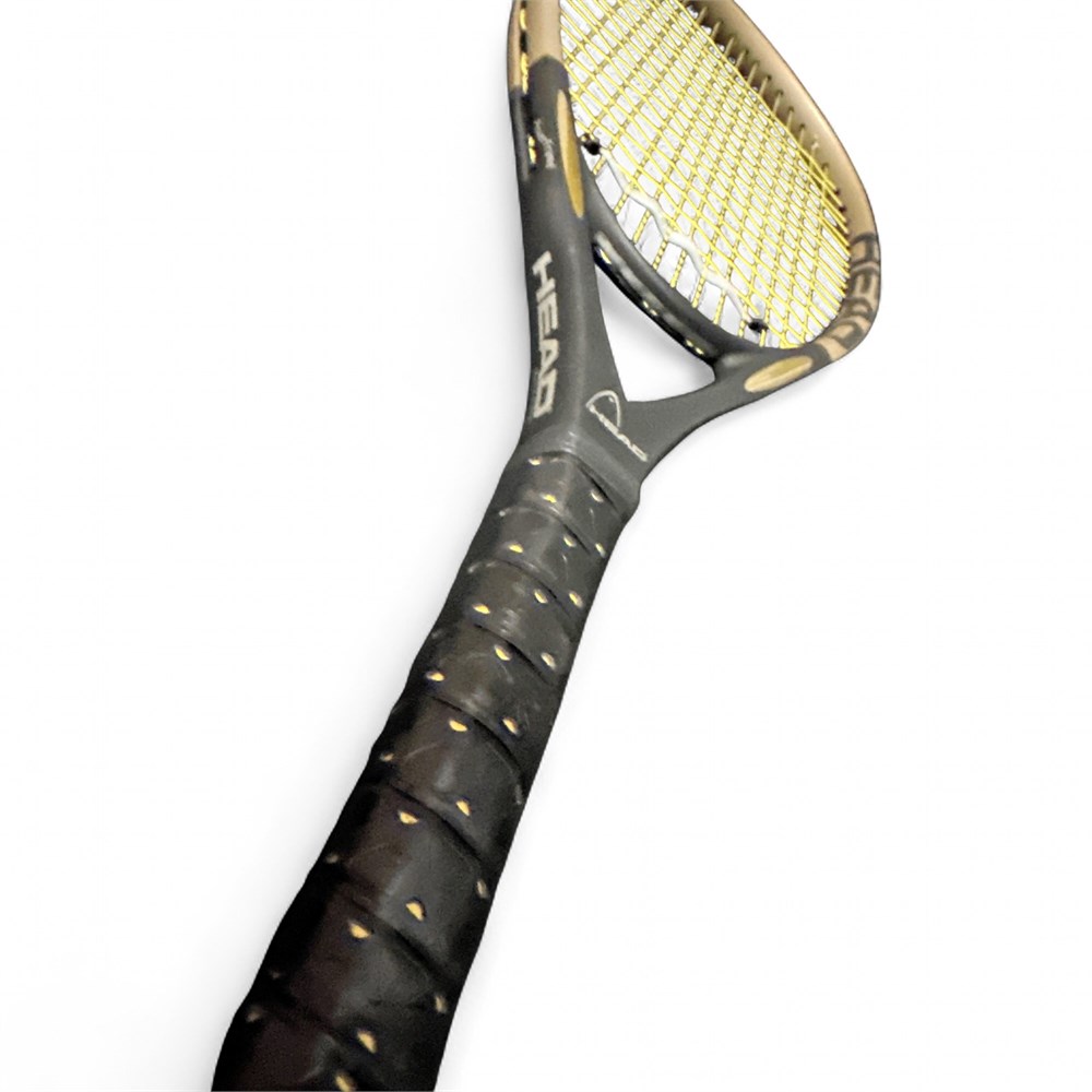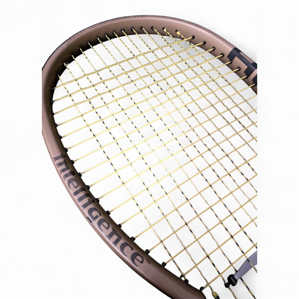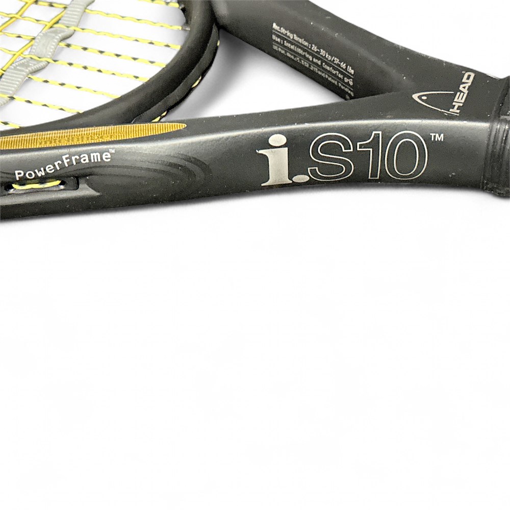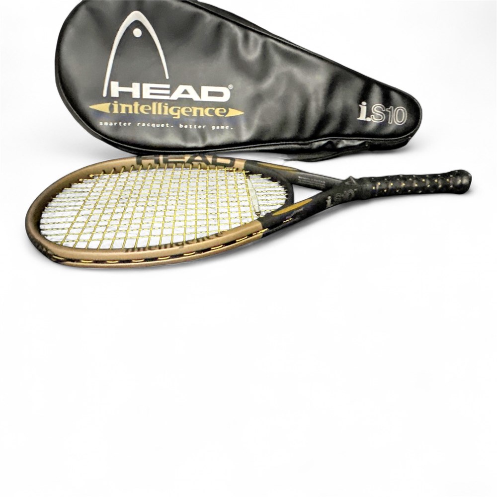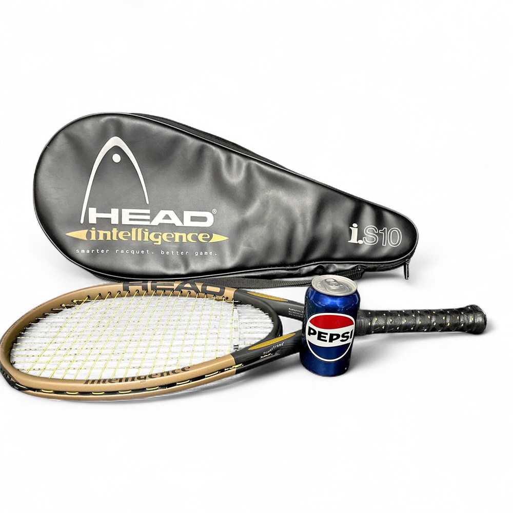 A HEAD Intelligence i.S10 Powerframe tennis racket, an oversized model known for its power and stability. It features Head's "Intelligence Technology," which uses intellifibers to adapt stiffness upon ball impact. With case. 28" L x 11" W Good condition.