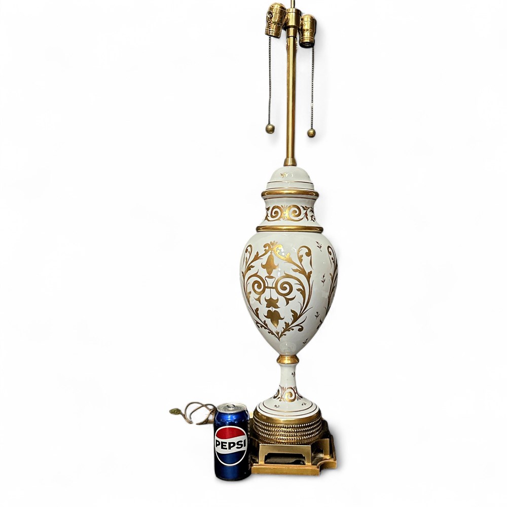 A vintage white and gold porcelain urn-form table lamp, produced by the Marbro Lamp Company in the mid-20th century. This style of lighting, which features ornate gilt details and a classic shape, is characteristic of Hollywood Regency or Neoclassical design, often referred to as Blanc de Chine when a shade is absent. The main body is porcelain with a white or ivory glaze, accented by extensive gold details and a brass or metal base. It features elaborate scroll and floral patterns on the urn body and an ornate, possibly square, pedestal base. 43" H Good condition.