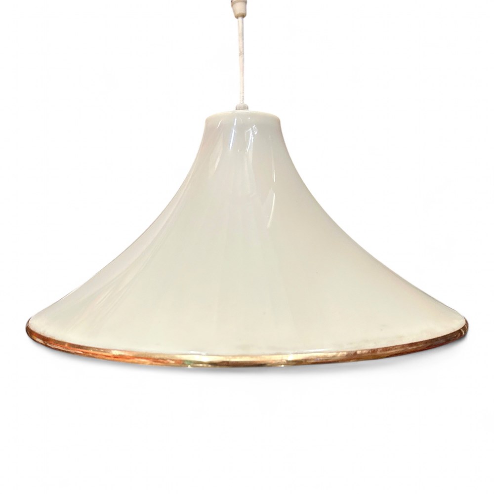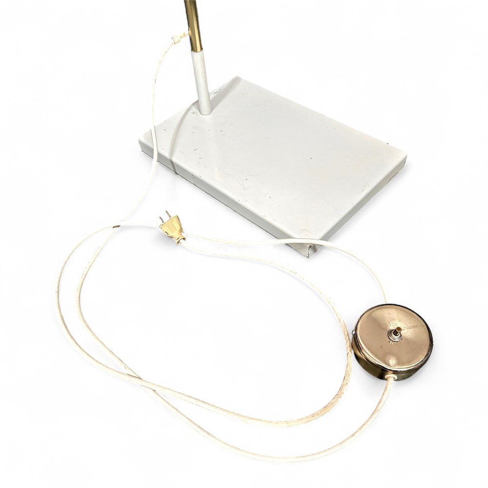 A modern arc or arched lamp, a style of lighting fixture known for its long, curved arm that extends over an area like a sofa or a chair to provide overhead lighting without needing ceiling installation. The specific lamp in the image has a white, conical shade and a clear, possibly acrylic or glass, base and stem. Modern, minimalist, and mid-century modern-inspired design. The defining feature is the prominent, gracefully curved arc that suspends the light shade overhead. It features a clear or transparent base and stem, which creates a light, unobtrusive look, paired with a solid white shade. Arc lamps are primarily used for ambient and task lighting in living rooms, reading nooks, or offices, providing light to hard-to-reach places. 68" H x 53" W; Base: 9" W x 13.5" L Good condition.