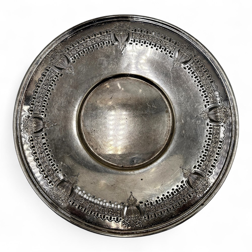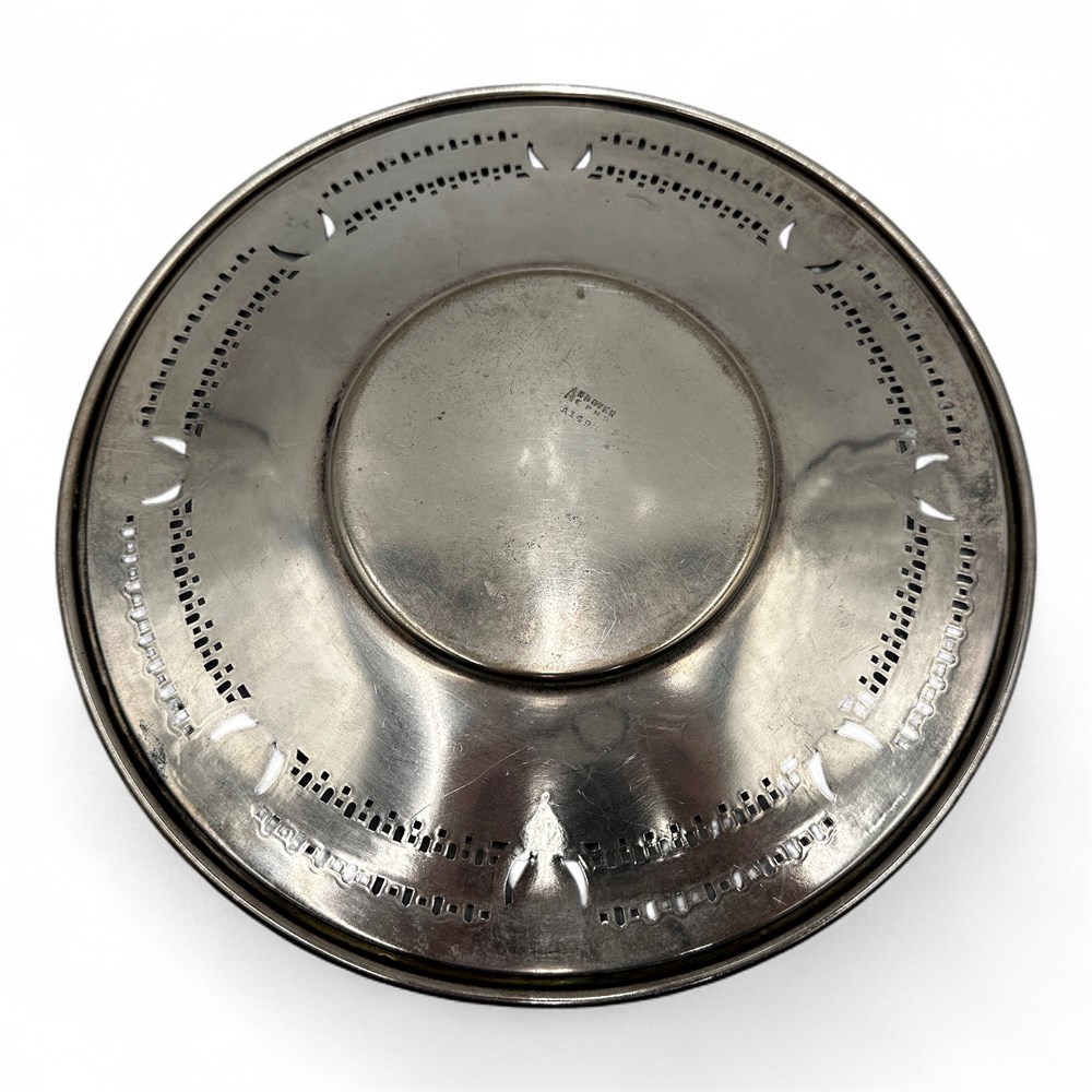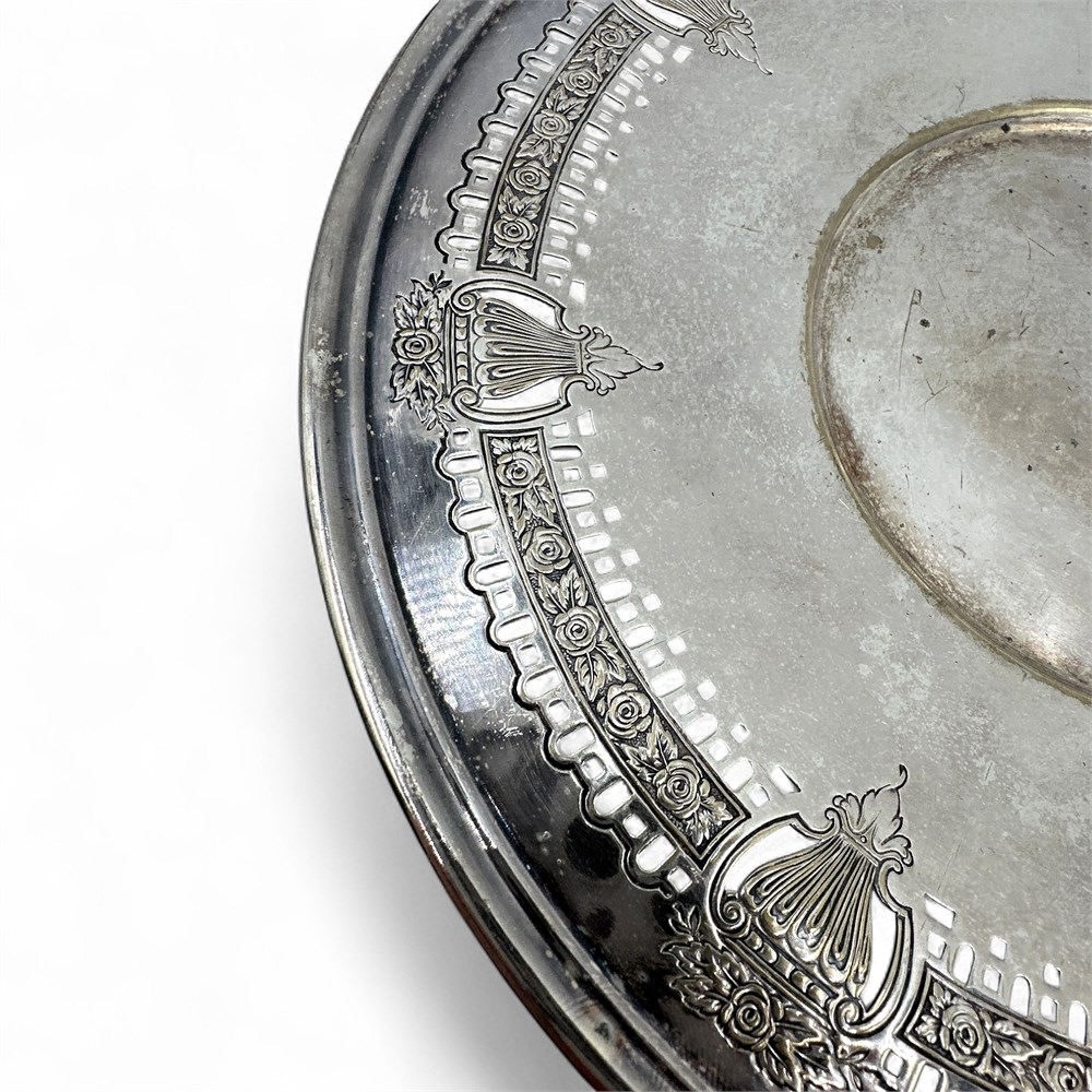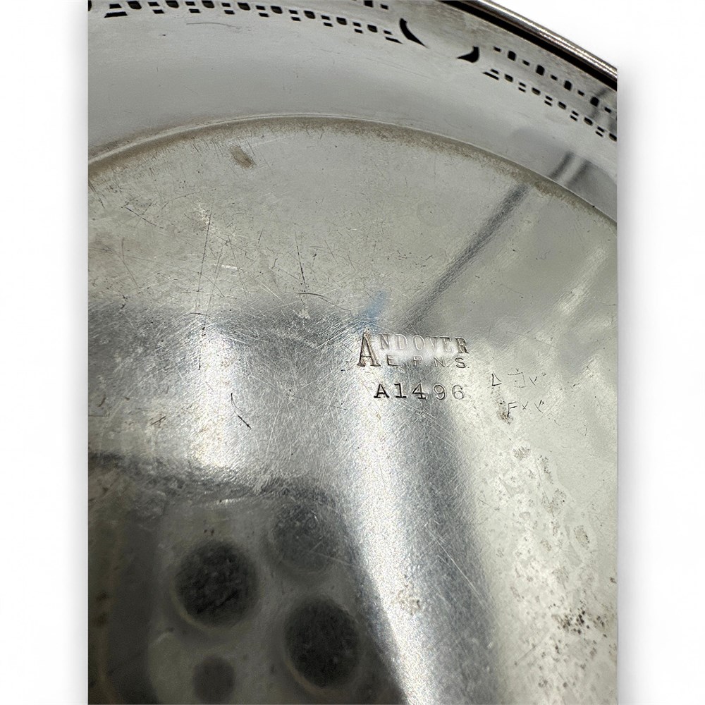 A silver-plated tray made by the Andover Silver Company. The tray has a distinct ornate, pierced, or reticulated floral and rose border design. The design is characteristic of the Victorian style, featuring elaborate embossed roses and a decorative edge that was popular in the late 19th and early 20th centuries. The markings at underside "ANDOVER EPNS" and "A1496" identify the manufacturer, the material (EPNS stands for Electro-Plated Nickel Silver), and a potential model or inventory number. EPNS (Electro-Plated Nickel Silver), meaning it has a base metal core with a thin layer of silver plating. "A1496" indicates a specific product line or inventory number. 10" W Good condition.