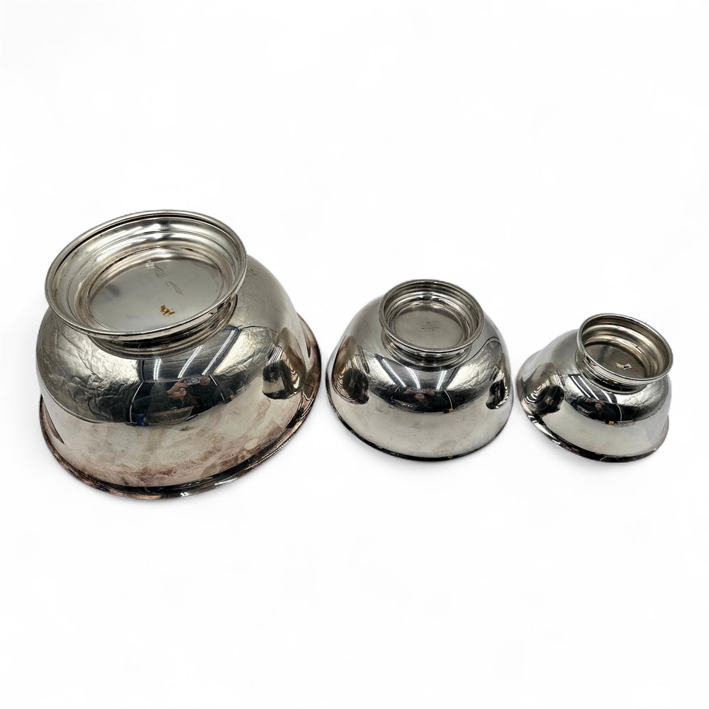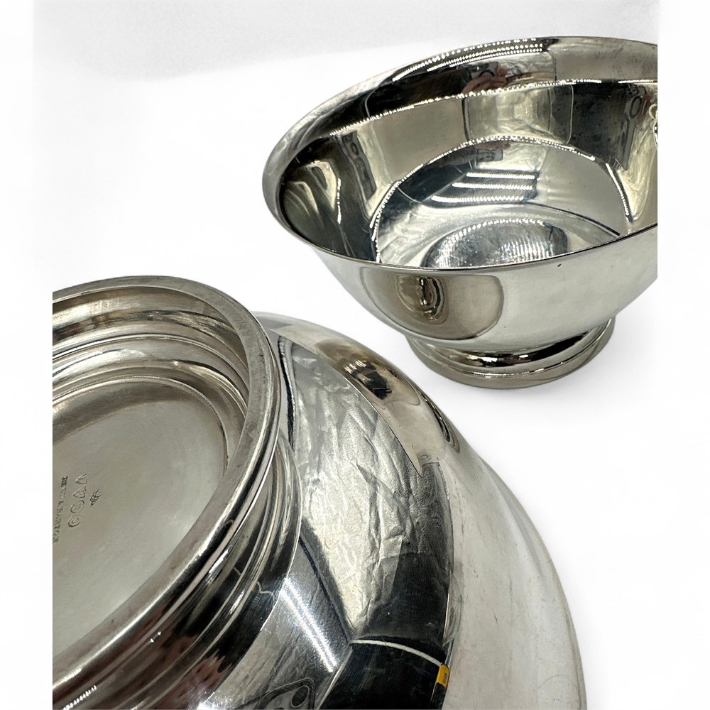 A group of three silver-plate bowls including Reed & Barton and Wallingford. The Reed & Barton bowl is item #104, and the Wallingford is #506. Largest bowl: 11.5" W x 6" H; Smallest bowl: 6" W x 3.25" H Good condition.