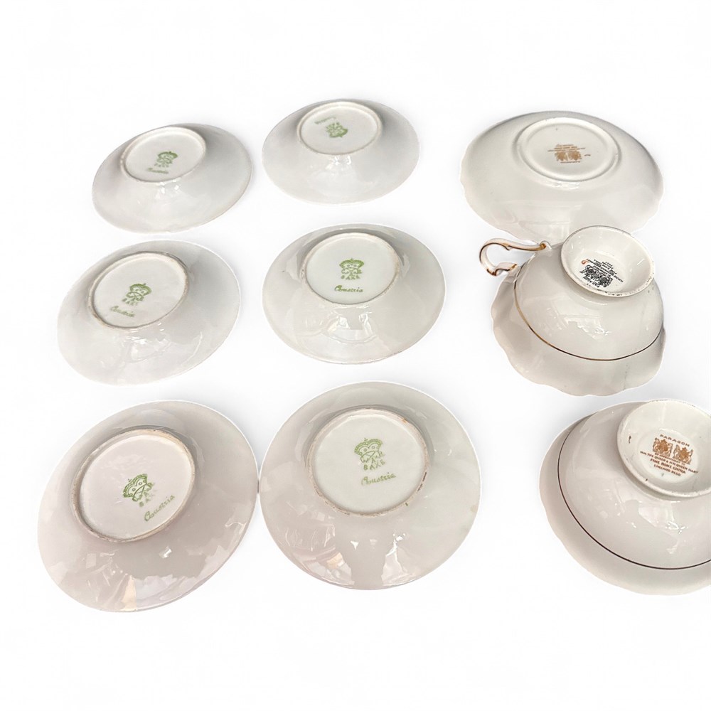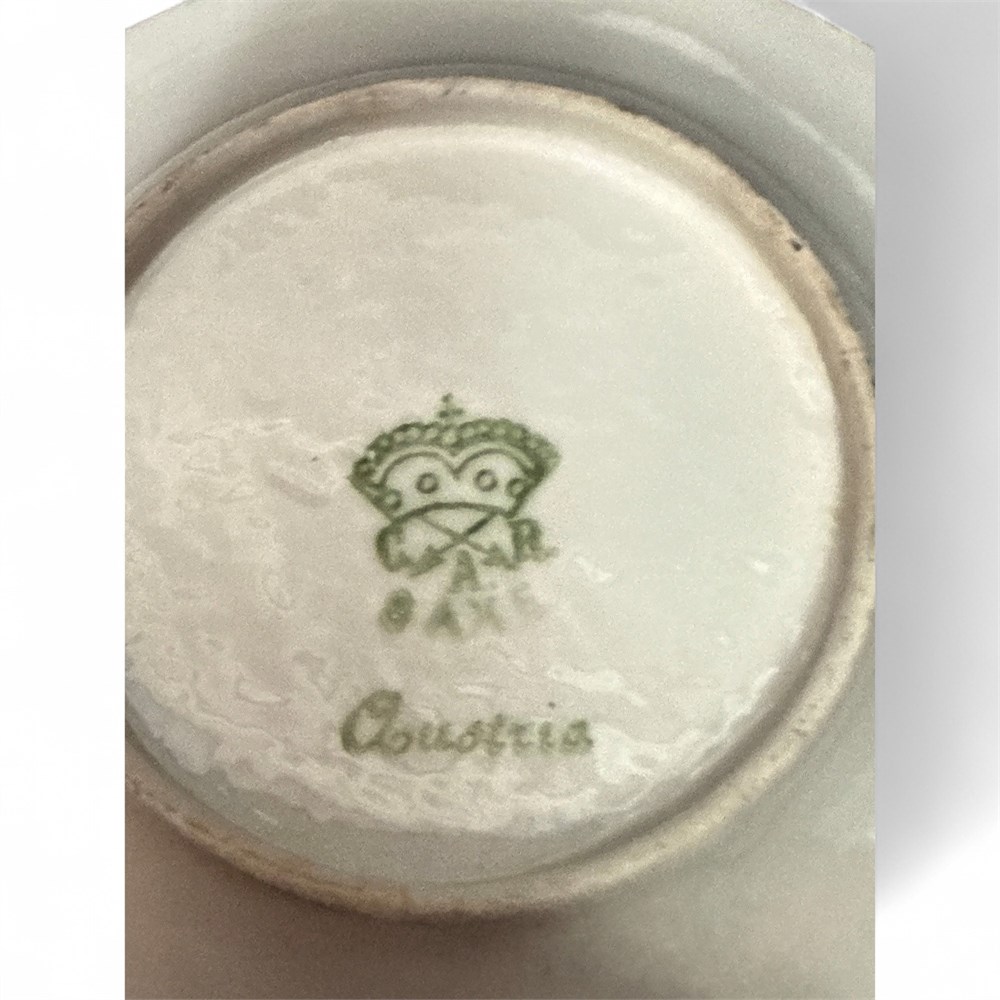 A group of vintage nine pieces of fine china, six of which are Saxe saucers, and two Paragon teacups and a Saucer. Paragon China was a British ceramics manufacturer known for high-quality bone china. The double royal warrant stamp at underside indicates production between approximately 1939 and 1949. Saxe porcelain dishes, produced by the German manufacturer Beyer and Bock, located in Volkstedt, Thuringia, Germany. The mark at underside, featuring the "C.A.R" initials and a crown above the word "Austria," was used between approximately 1905 and 1931. Plates: 5" Dia Good condition.