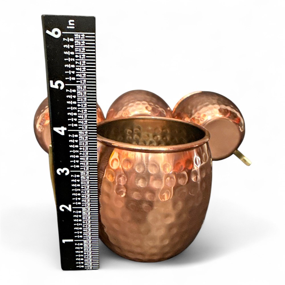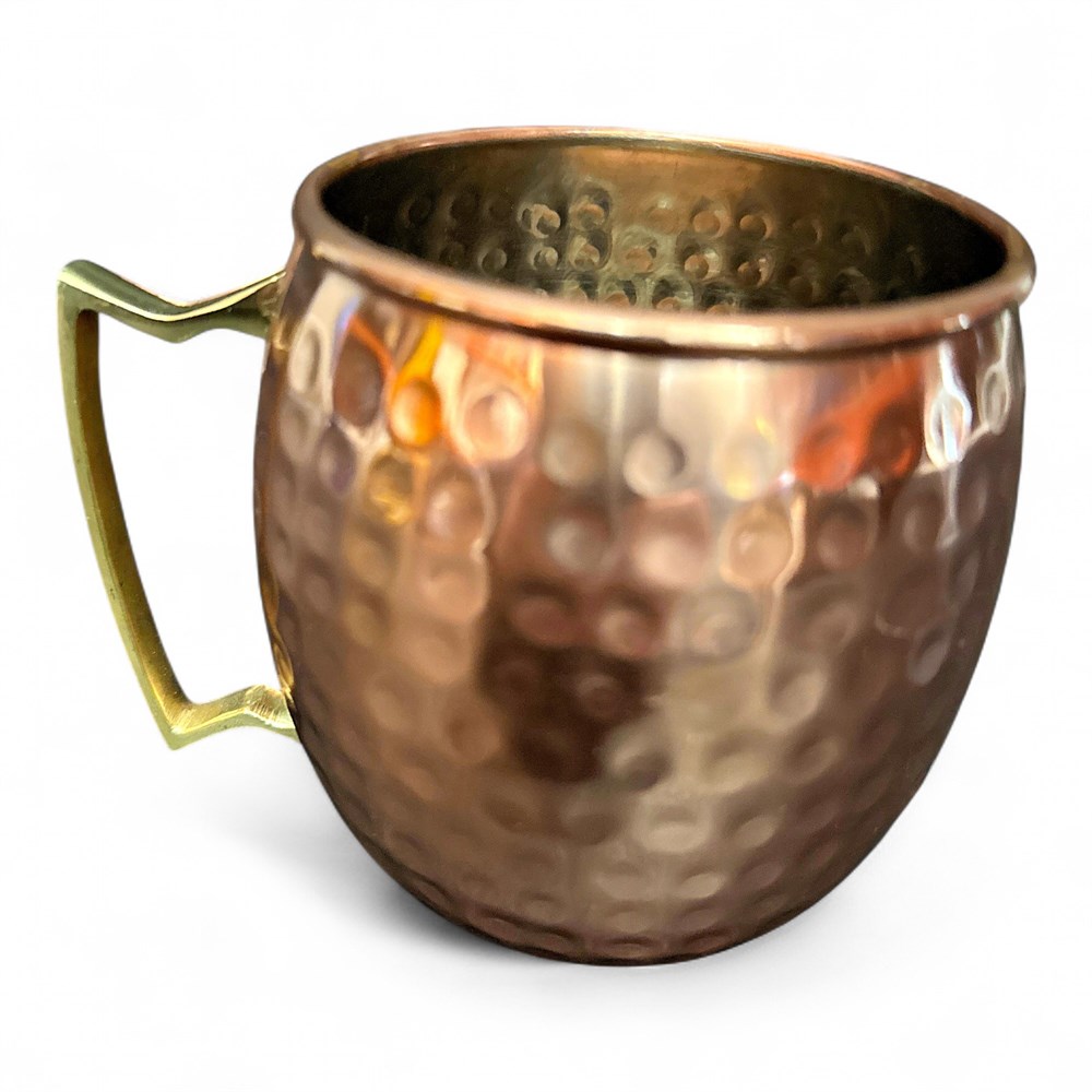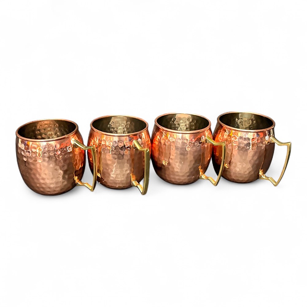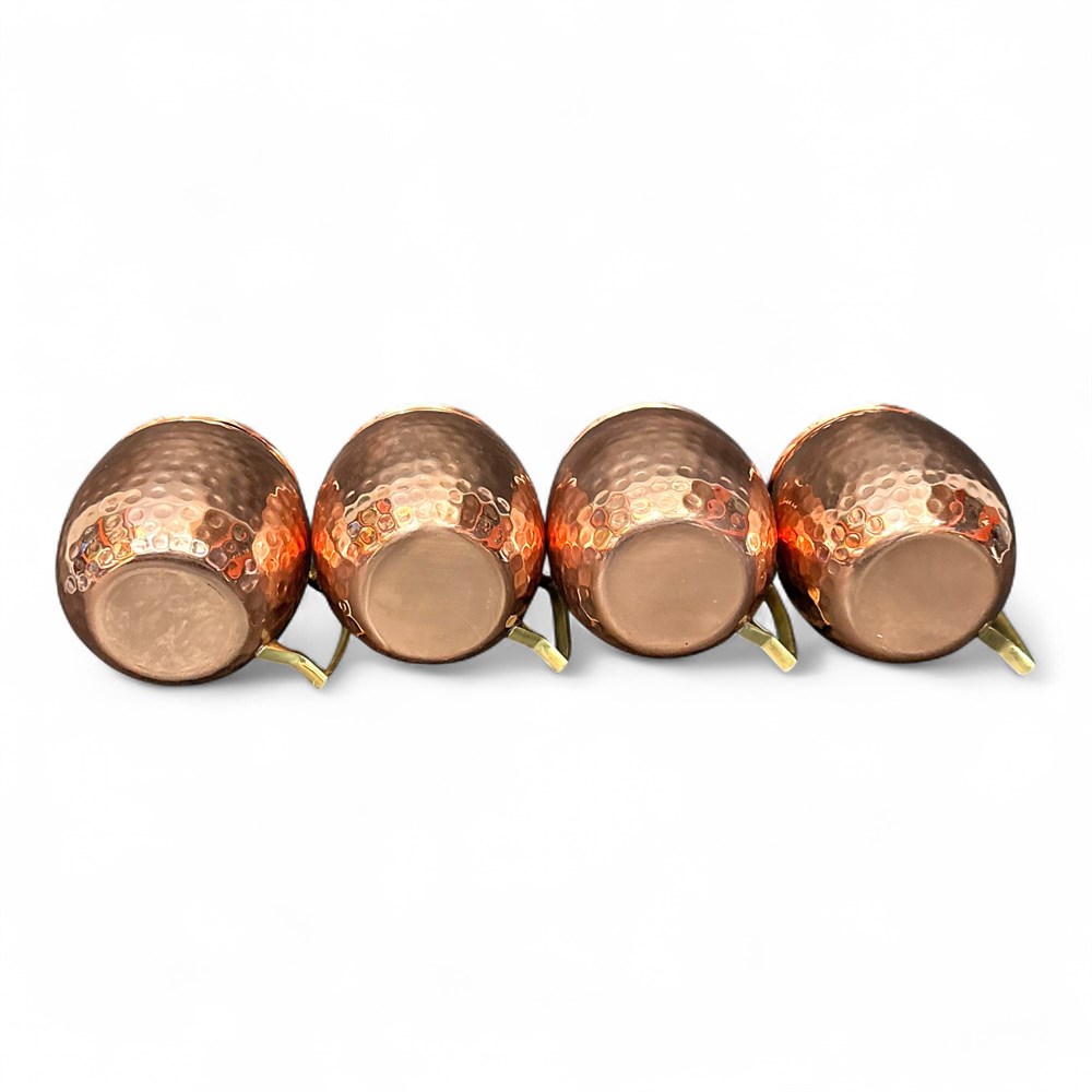A set of four hammered copper Moscow Mule mugs, typically used for serving the classic cocktail. Made from 100% pure copper with a food-grade lining like stainless steel or nickel. Features a distinctive hammered finish and a brass handle. The copper material helps keep drinks, such as the Moscow Mule (vodka, ginger beer, lime juice), ice cold for a longer duration than glass mugs. Hand washing is typically recommended; they are not microwave or dishwasher safe. 4" H x 3 1/2" W Good condition.