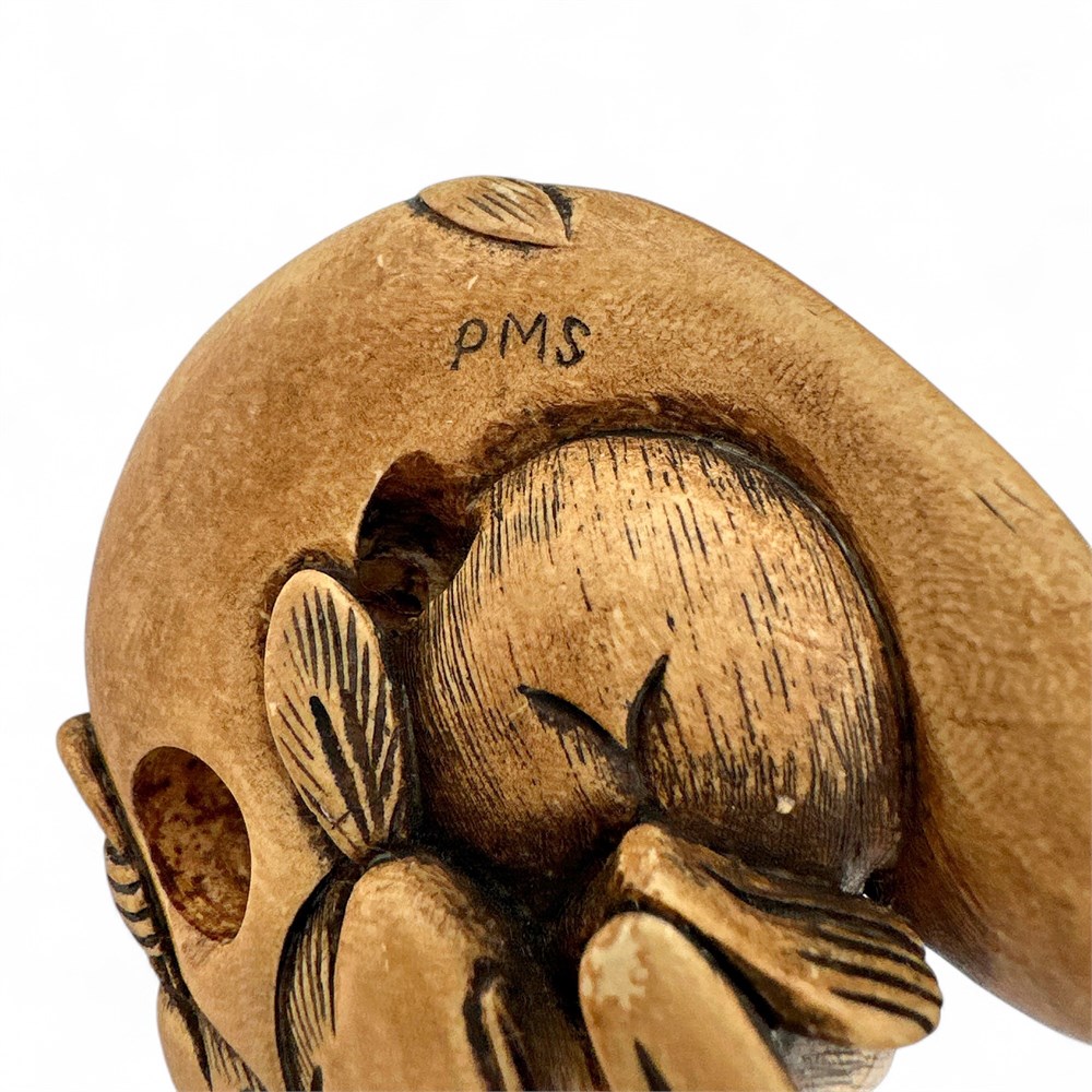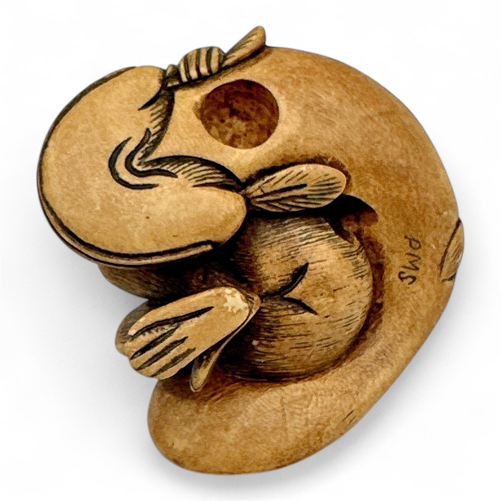 A vintage Japanese netsuke carving depicting a monkey resting on a large namazu (earthquake fish). Netsuke are miniature, intricately carved sculptures that served as toggles for suspending items from a sash in traditional Japanese attire. The monkey is a messenger of the Shinto deity Ōkuninushi-no-Mikoto. The namazu, or giant catfish, is a mythological creature believed to cause earthquakes. Monkey and namazu carvings were a popular subject for netsuke carvers. The item is likely a vintage or antique piece, possibly dating to the early 20th century or earlier. 2" W x 2" L x 1.25" H Good condition.
