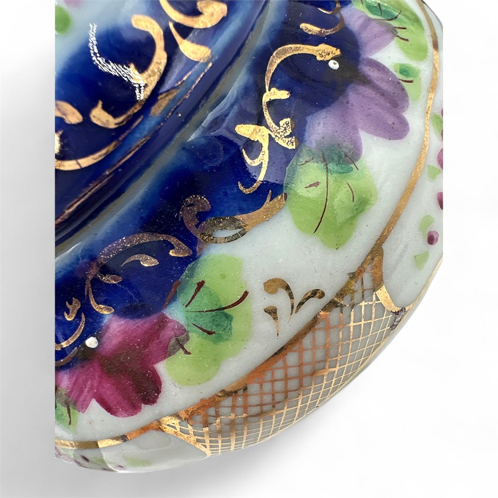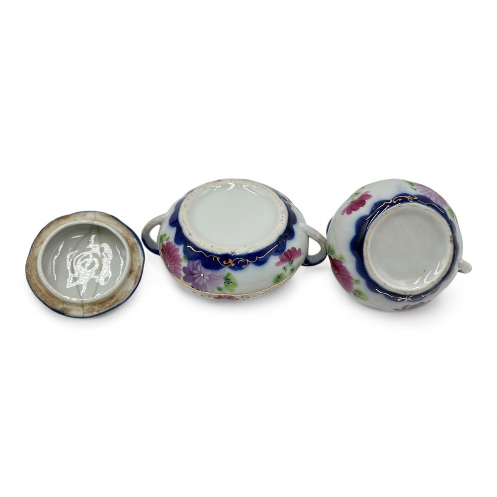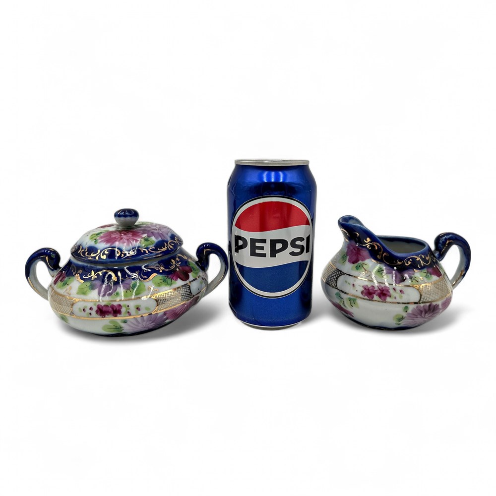 An antique hand-painted porcelain creamer and sugar set, from the Nippon Era (1891–1921) of Japanese porcelain production. The style is very characteristic of items marked "Nippon," which were exported from Japan during a specific time frame when US law required imported goods to be marked with their country of origin. The set features a blue, white, and pink floral pattern with detailed gold trim along the rims, handles, and base of the pieces. The sugar bowl is lidded and both pieces have a somewhat bulbous, melon-like shape. It is made of porcelain, with a slightly iridescent or pearlescent finish. Container w/ lid: 3.5" H x 6.5" W; Smaller container: 5" L x 4" W Good condition.