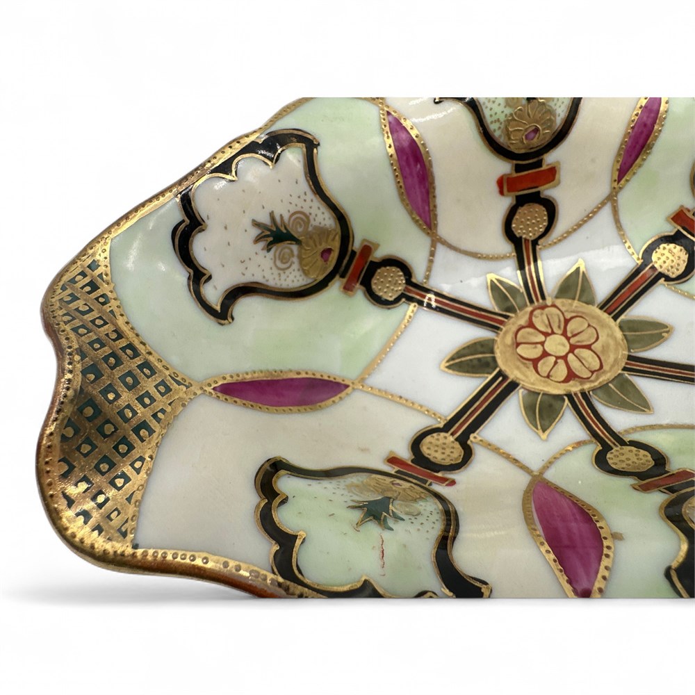 A vintage Japanese porcelain serving or candy dish, possibly a Nippon piece, featuring a hand-painted floral design with gold accents. These types of items, particularly from the Morimura Brothers era (1921-1933) in Japan, are known for their intricate hand-painted details and gilded edges. The decorative style, which includes raised gold moriage-like elements and scalloped edges, is typical of early 20th-century Japanese export porcelain. 7.5" L x 4.5" W x 2" H Good condition.