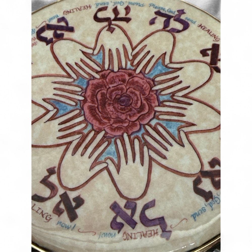 This is a small, round, headless tambourine produced by Remo. It features a hand-painted surface with a central floral motif surrounded by illustrated hands arranged in a circular pattern. The design includes text in both English and Hebrew placed around the surface. The English text reads, “Please, God, send HEALING now!” repeated around the rim. The Hebrew text, written in purple script, translates to “healing” and appears at intervals around the central imagery. The tambourine has a gold-tone finished rim. The underside is marked with the name “Marylee.” It measures approximately 2 inches in height and 6 1/4 inches across. The item is in good condition.