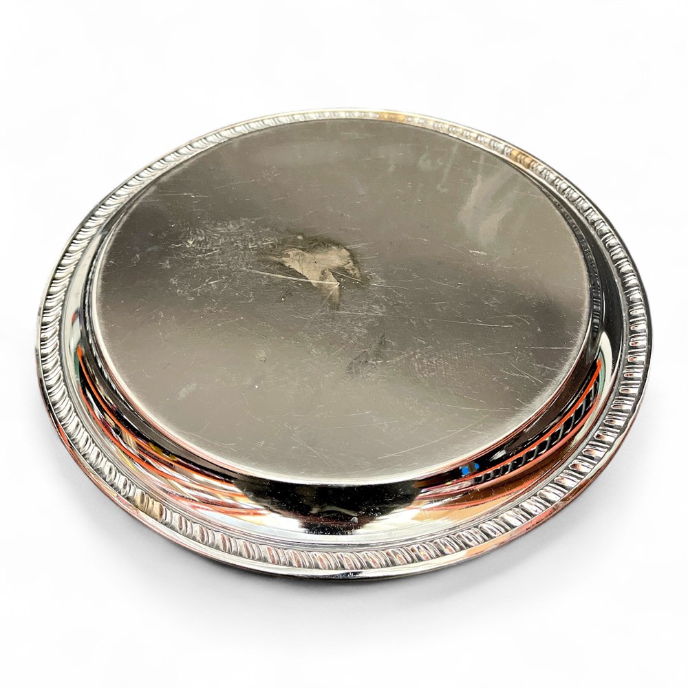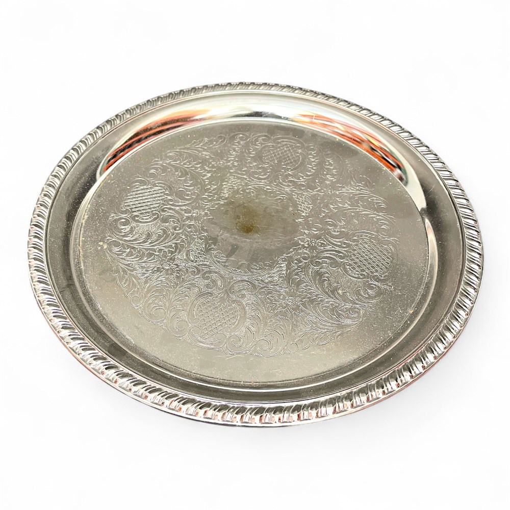 This vintage Irvinware silver-plated tray features an intricate engraved pineapple pattern accented by a braided border along the rim. The circular form and detailed surface decoration reflect classic mid-century decorative metalwork. The tray is stamped on the underside, confirming Irvinware manufacture. Measures approximately 12 1/2 inches in diameter. Presented in good vintage condition, with light surface wear consistent with age and normal use.