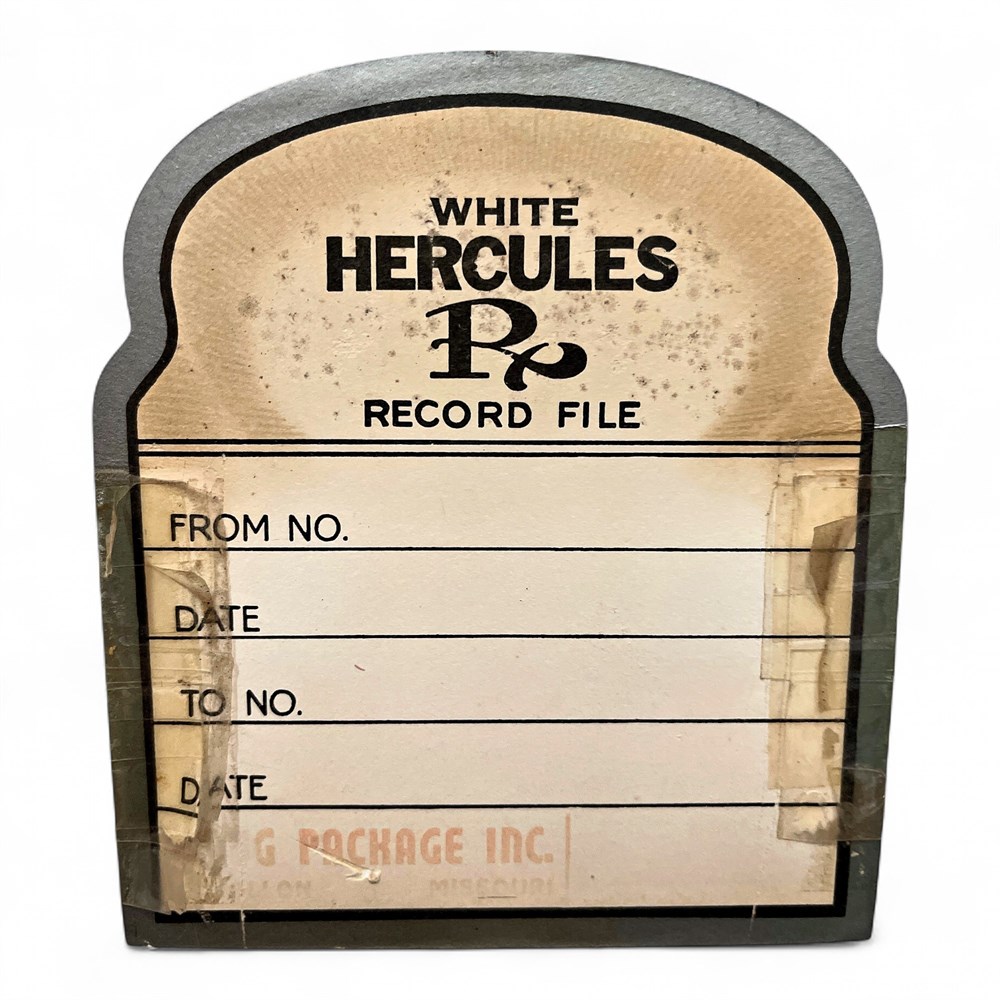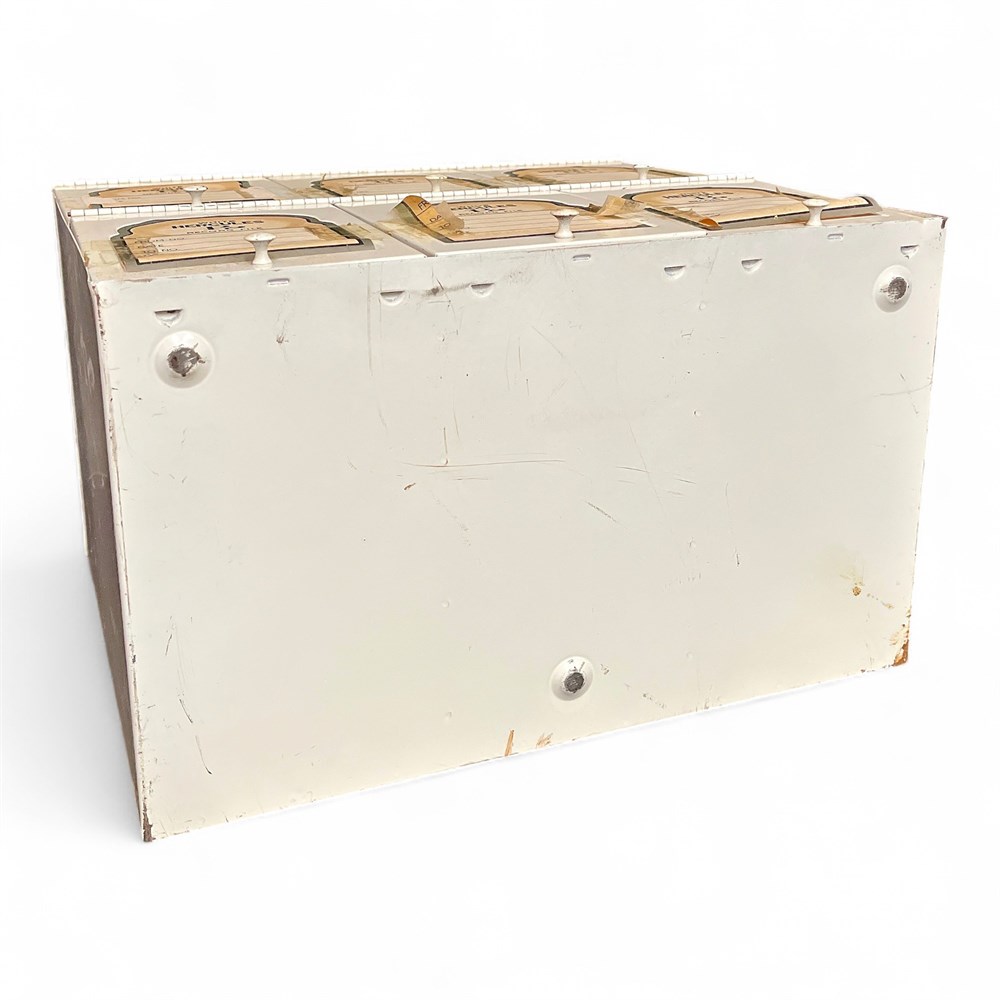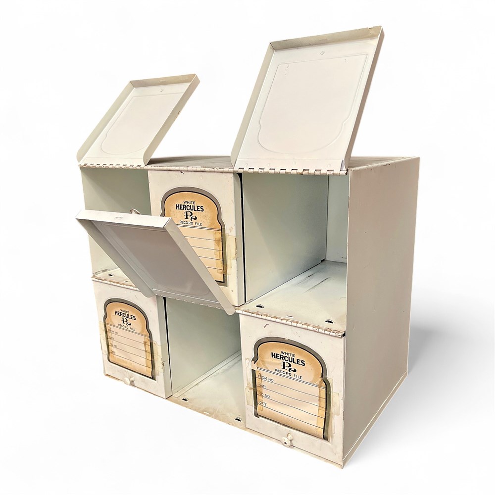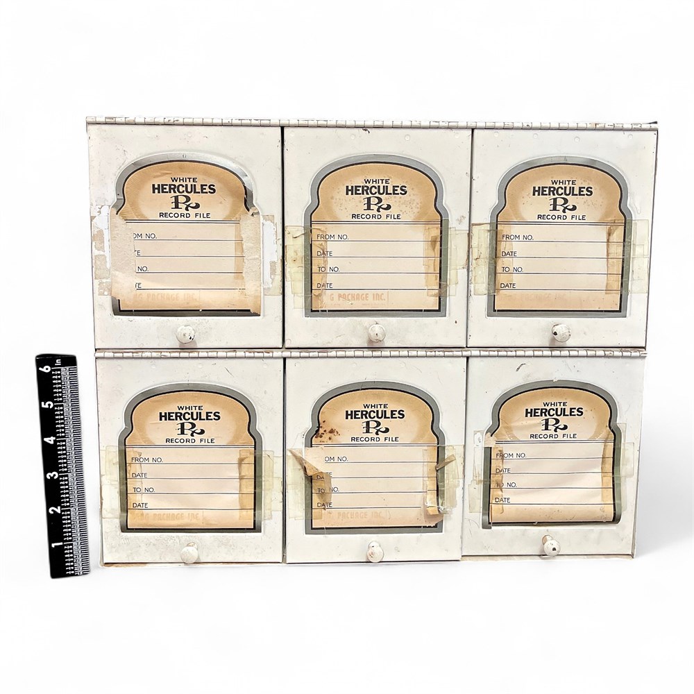 Vintage white metal “Hercules P.” prescription record file cabinet, dating to the mid-20th century (circa 1960s–1970s). Originally produced for pharmacy use, this cabinet is constructed of painted metal and configured with six individual storage compartments arranged in two rows of three. Each compartment features a hinged front door with a metal pull and an original paper label insert. The labels are marked “WHITE HERCULES P. RECORD FILE” with printed fields for “FROM NO,” “TO NO,” and “DATE,” all retaining a desirable aged patina consistent with period use. Dimensions: approximately 9.5 in. deep × 15.5 in. wide × 13 in. high. Good condition.