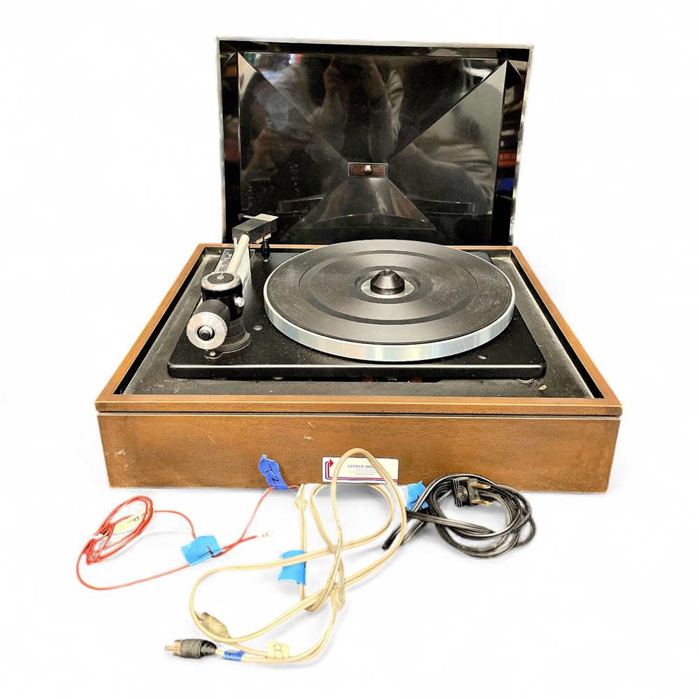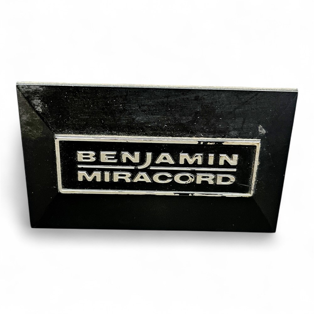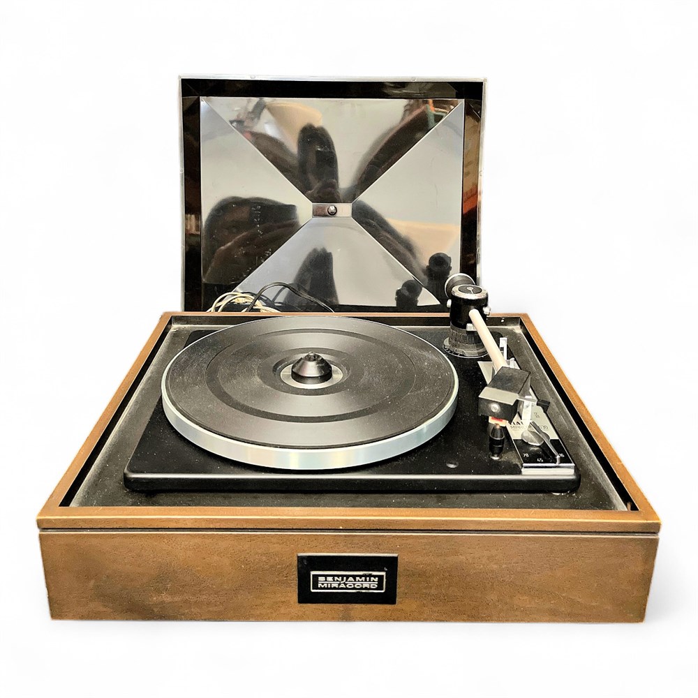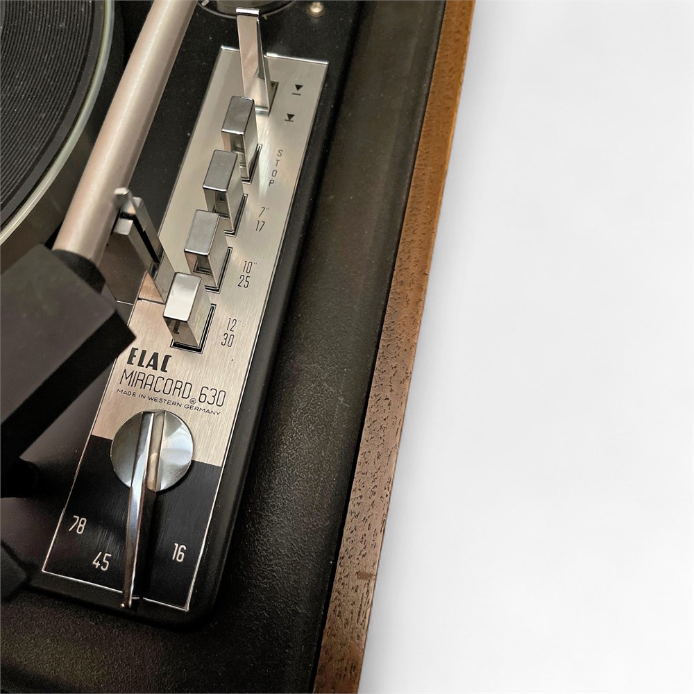 Vintage automatic turntable manufactured by ELAC (Electroacustic GmbH), model Miracord 630, produced in Germany circa 1970–1972. This model is a well-regarded example of early 1970s German engineering, featuring a heavy zinc die-cast platter, four-pole asynchronous motor, and precision aluminum tonearm with integrated lift and antiskating. The Miracord 630 supports multiple operating modes including single play, changer, automatic, and continuous play, with selectable speeds of 16⅔, 33⅓, 45, and 78 RPM. Control is via push-button operation. The tonearm allows fine adjustment of tracking force via spring mechanism, with a minimum tracking force of approximately 0.75 p. The platter measures 264 mm in diameter and contributes to low wow and flutter, rated at approximately 0.08% (DIN 45507). Rumble figures exceed 42 dB (weighted) and 60 dB (noise voltage), meeting DIN 45500 standards. Housed in a wooden plinth with hinged dust cover. Branded “Benjamin Miracord” badge present. Designed for use with standardized cartridge systems, originally offered with STS-244 or STS-344 cartridges (cartridge presence not guaranteed). Approximate dimensions: 14½" L × 17" W × 7½" H. Condition: Good vintage condition with expected cosmetic wear consistent with age; functionality not fully tested unless otherwise stated.