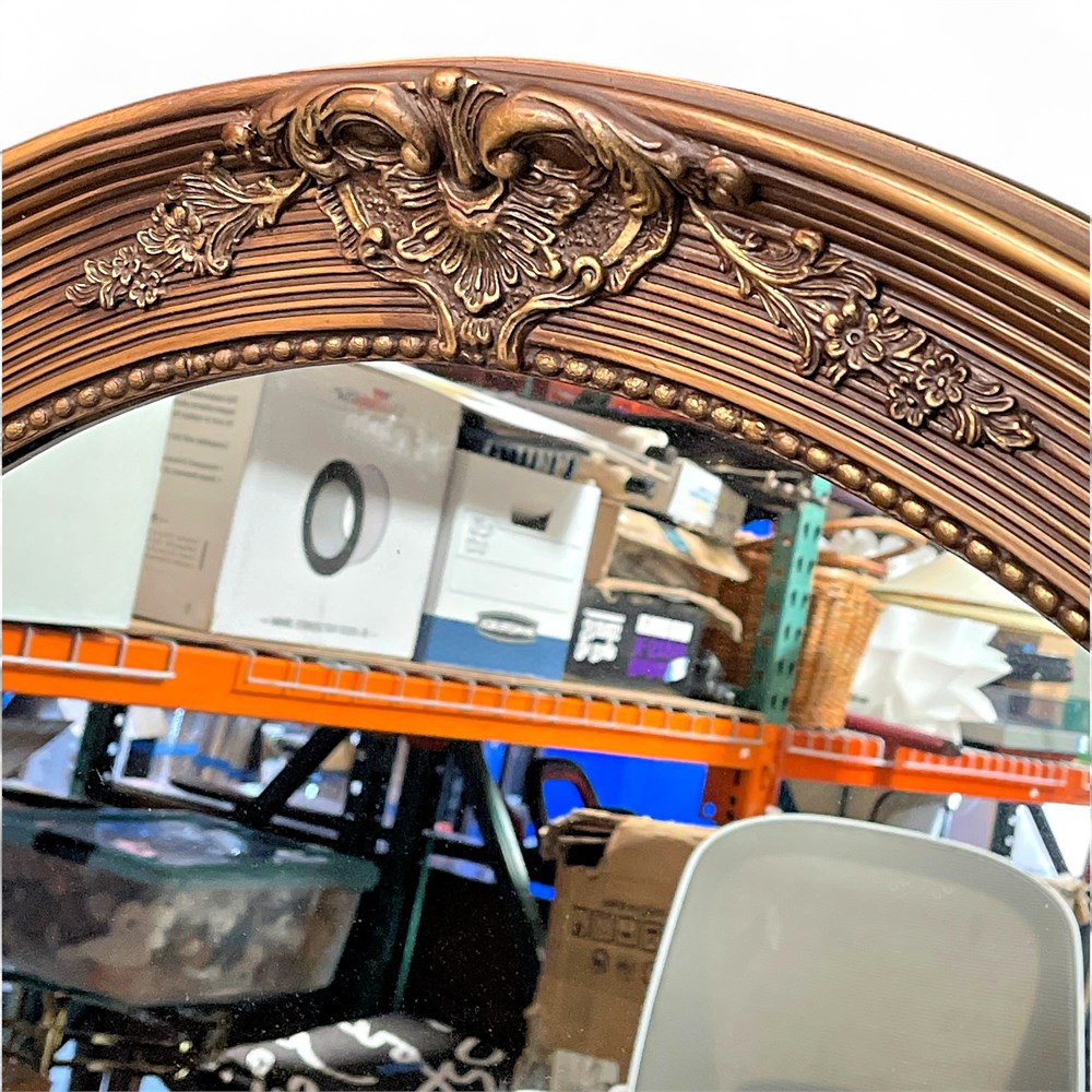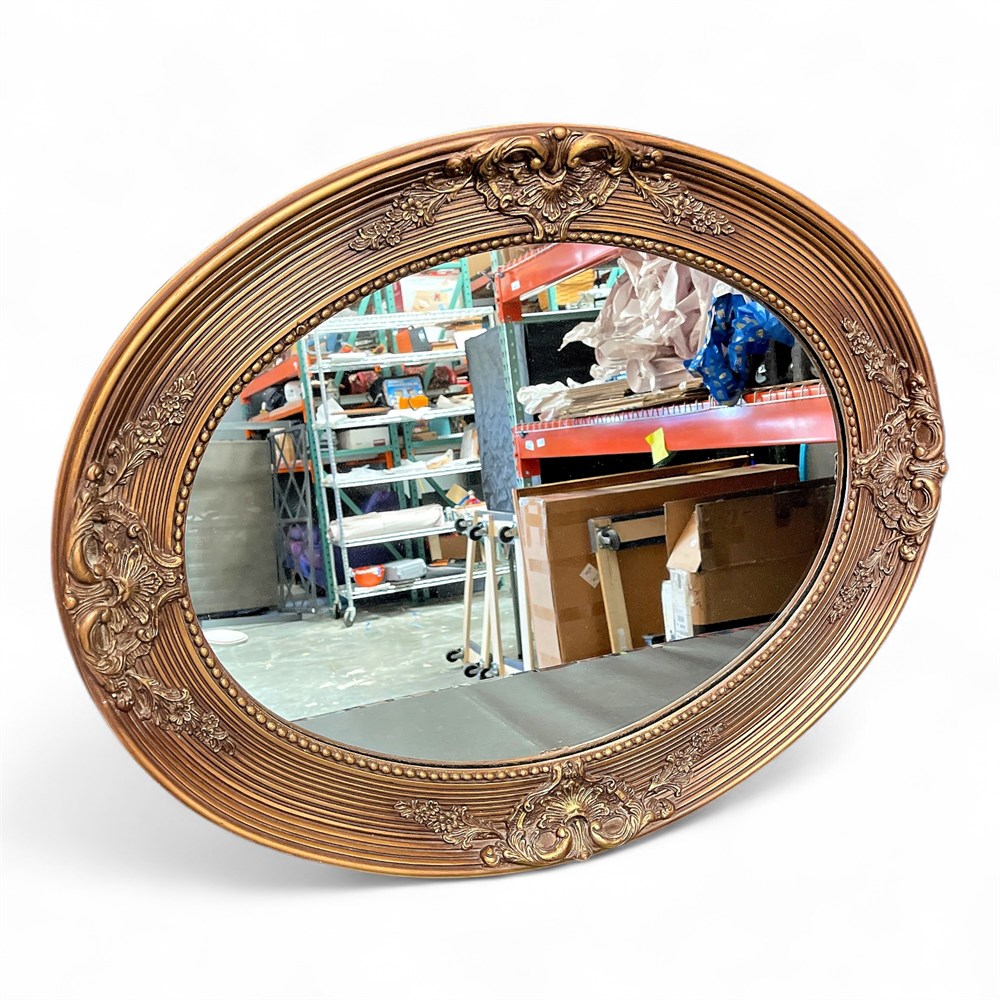 This vintage-style oval wall mirror is designed in a Baroque/Rococo-inspired aesthetic, featuring a richly detailed and highly decorative frame. The frame is finished in an antique gold or gilt tone and is elaborately ornamented with classical scrollwork, acanthus leaves, and floral motifs, reflecting the elegance of 18th-century European design traditions. Overall condition is good, with minor surface wear commensurate with age and use. Approximate dimensions are 30 inches long by 24 inches wide.