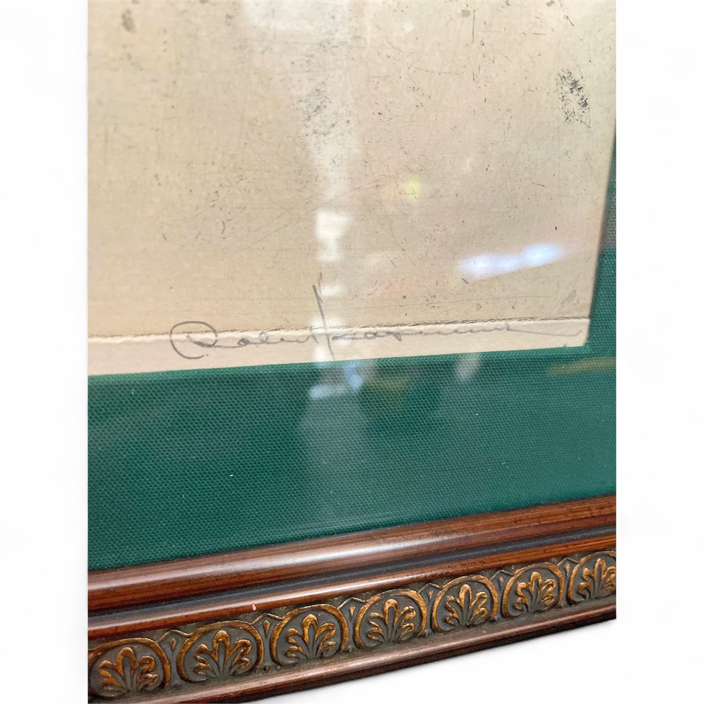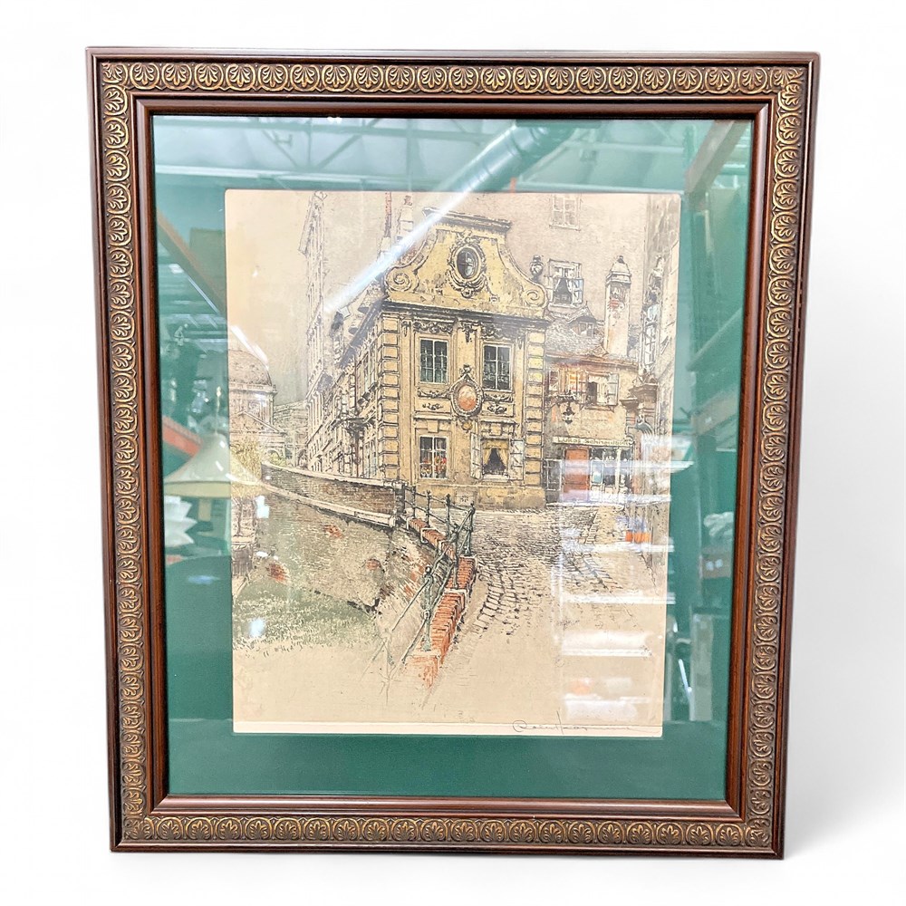 Hand-signed color etching by Robert Kasimir (Vienna, 1914–2002), depicting an architectural street scene titled Three Girls’ House in Vienna. Kasimir, the son of noted artists Luigi Kasimir and Tanna Kasimir-Hoernes, was trained at the Graphic Arts Training and Research Institute and the Academy of Fine Arts in Vienna, and is best known for his finely detailed architectural etchings. This work exemplifies his precise linework and atmospheric treatment of historic European buildings. Presented in a decorative frame, the etching is hand-signed by the artist. Sight size approximately 21 inches by 18 inches. Condition is good, with no significant issues noted at the time of cataloging.