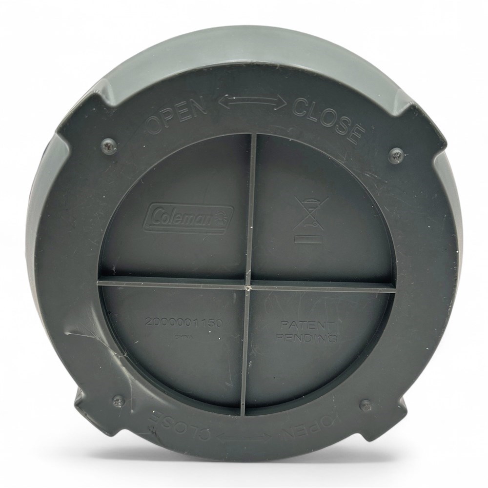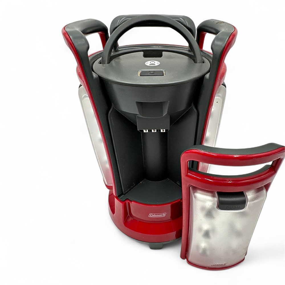 The Coleman LED Quad Lantern, model 2000001150, is a versatile camping and emergency lighting solution designed to provide bright, reliable illumination in tents, campsites, or power-outage situations. This lantern features four removable light panels that snap into a central charging base, allowing the unit to function either as a traditional lantern or as four independent personal lights. In total, the system contains 24 lifetime LEDs that never require replacement and produce approximately 190 lumens of cool-running, ultra-bright light with an effective range of up to about 26 feet (8 meters). Each detachable panel houses six LEDs, an internal rechargeable battery, and its own on/off switch, automatically recharging when returned to the lantern base. The lantern itself operates on eight D-cell batteries and includes a master power switch along with a water-resistant construction suitable for outdoor use in varying weather conditions. Measuring approximately 12.5 inches high by 7 inches wide, the lantern remains in good overall condition.