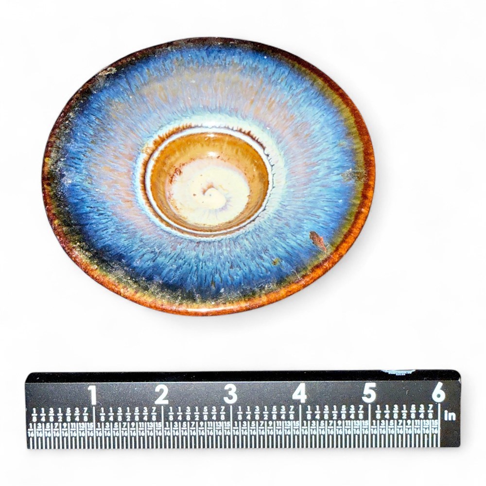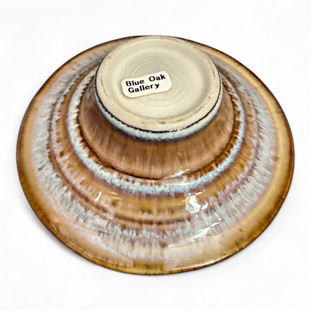 Signed American porcelain art pottery flower frog bowl by noted studio potter Bill Campbell, featuring his signature layered crystalline blue and brown glaze with flowing organic color transitions and subtle crystal formations created through controlled firing and slow cooling. The wheel-thrown form has a flared lotus-style rim and integrated pedestal base with a central built-in frog designed to hold flower stems securely for arranging. Finished in a glossy, richly variegated surface typical of Campbell Studios’ in-house formulated glazes. Marked on the underside and originally sold through Blue Oak Gallery. Measures approximately 5 1/2 inches wide and remains in good overall condition.